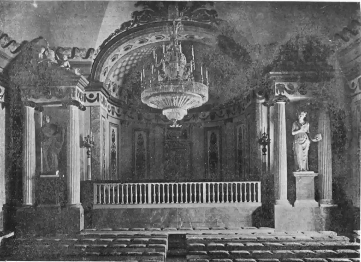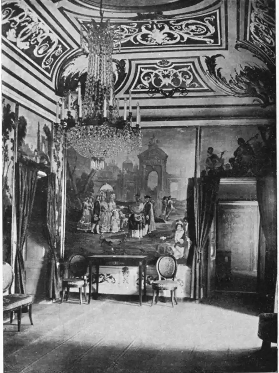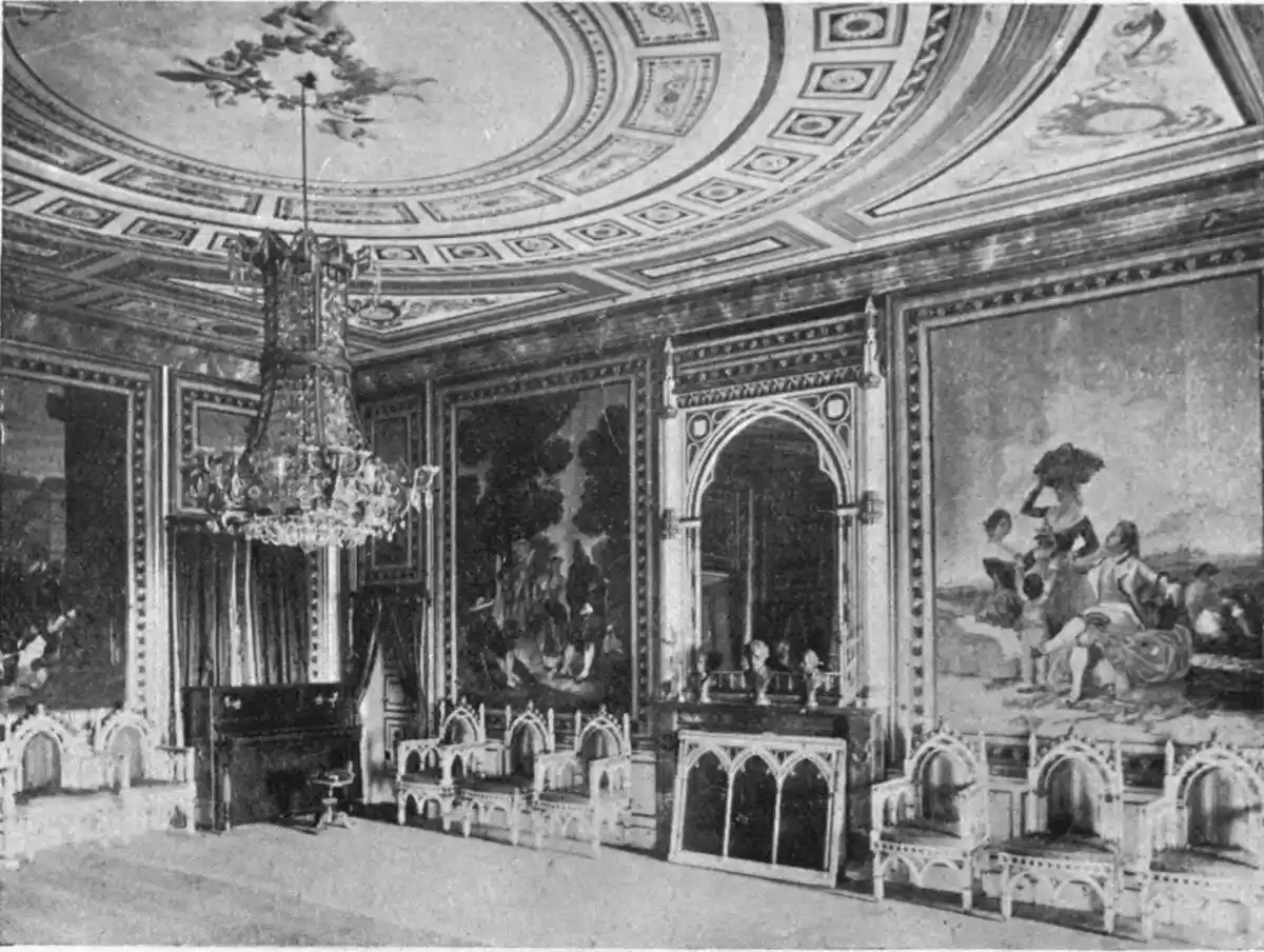 To the north of the town is the Prince’s Cottage, another creation of that villa-building monarch, Charles IV. It is a delightful example of the three noble arts that vie with one another to give beauty to the villa—the old silks that cover the walls, the carvings that adorn them, and the magnificent chandeliers and rich, varied furniture, which make a valuable museum of this so-styled cottage. There are also other two palaces called La Zarzuela and the Quinta. Both are surrounded by fine gardens, and contain sumptuous oratories where Mass is celebrated on special occasions. These two buildings are surviving portions of the old edifice. In La Zarzuela{44} Don Fernando, the brother of Philip IV., was wont to organise those little vaudeville entertainments which were christened Zarzuelas. It is no longer used for that purpose, the theatrical performances at El Pardo now taking place in the small but elegant theatre in the palace which Alfonso XIII. had restored when the residence was prepared for the accommodation of Princess Victoria Ena.