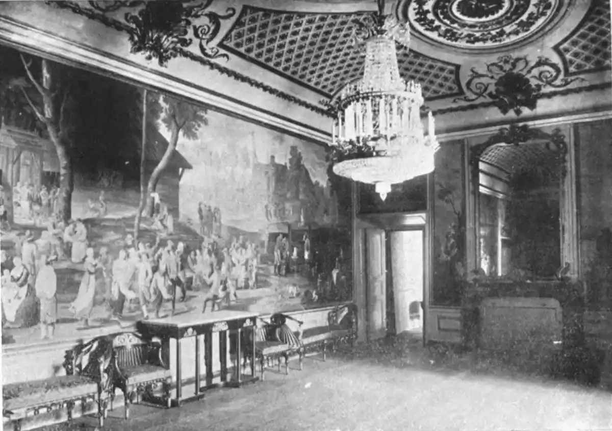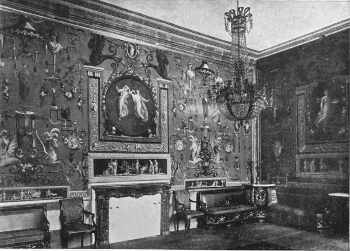 The palace contains a series of small rooms, the most remarkable of which are a set of four. The other apartments are covered with beautiful tapestry made from designs by Rubens, Teniers, and Goya, but the walls of these particular rooms are covered with the finest inlaid woodwork. The hinges, locks, and handles of the doors are in gilt-bronze and steel, and the ceilings are painted by Maella. The entire work is said to have cost £280,000.