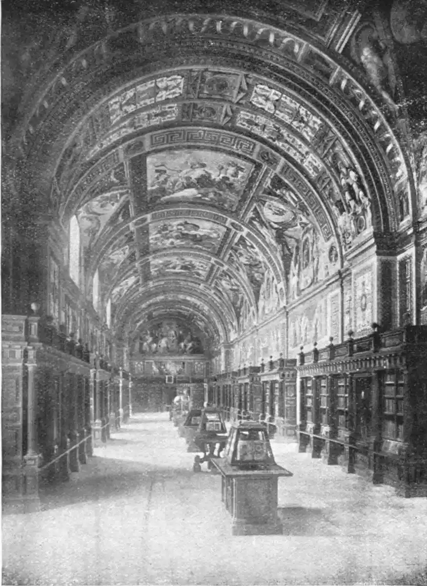 The private library of his Majesty is on the{102} ground-floor of the palace. It was formed by Philip V. about 1714, and has since been increased by the acquisition of several notable collections, including those of the dean of Teruel, Counts Mansilla and Gondomar, and Judge Bruna of Seville. The manuscripts are for the most part from the extinct colleges. The king’s library, which occupies ten rooms and two passages, is composed of eighty thousand volumes in magnificent mahogany cases with beautiful glass from La Granja. Books issued prior to the sixteenth century, beautiful copies on vellum, very rare editions by Spanish printers, and rich bindings, make this library one of the most important in Europe. Among the illustrated missals is a prayer-book said to have belonged to Ferdinand and Isabella or their daughter, Juana la Loca, whose portrait it contains. The building is adorned with exquisite ornaments and the arms of Leon and Castile in enamel. The correspondence of Gondomar, the Spanish ambassador in London during the reign of James I., is also to be seen here.