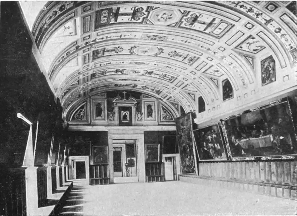 The apartments on the first floor, which with the exception of the sacristy and chapel on the ground floor are the only rooms that call for description, are decorated and furnished with a simplicity that would seem to betoken actual poverty. This is accounted for by the fact that the royal family very seldom resides in this{37} palace; and at such times whatever is required is conveyed there from the palace of San Ildefonso. On the other hand, the collection of pictures is superior in number and merit to that of San Ildefonso, for among its six hundred and fifty-eight pictures there are many originals of the great masters of the different schools. There is one each of Van Dyck, Titian, Albert Dürer, and Goya; two by Zurbaran, Navarrete, Guido de Reni, Pantoja de la Cruz, and Correggio; eight by Jordán, three by Teniers, four by Domenichino, and six by Poussin.{38}