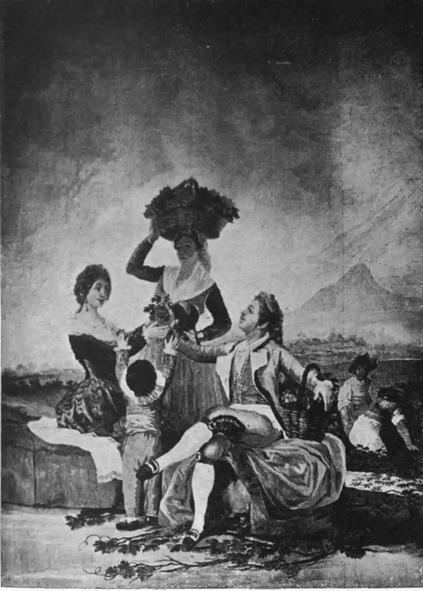 The ‘platillos’ of the four vaults, surrounded by a moulding, were painted al fresco by Maella, and all the paintings on the cupola are by{33} Bayeu, brother-in-law of Goya. Some of the studies for these paintings were purchased by Queen Isabel II., and are now in the Madrid Museum.
