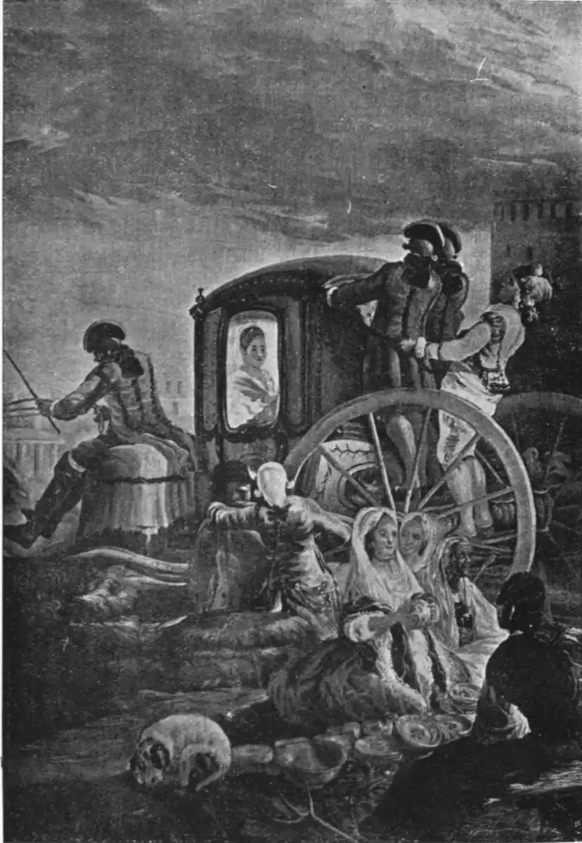 In 1830, when Ferdinand VII. lay ill at La Granja, and his heir and brother, Don Carlos, was holding himself in readiness to assume the responsibility of sovereignty, Queen Cristina, anxious for her three-year-old daughter’s interest, induced the king to abolish the Salic law and declare his daughter Isabel to be his successor. Three years afterwards, Ferdinand died, and three years later the king’s abrogation of the constitution was revoked by a mob of common soldiers, led by Sergeant Garcia, who compelled the queen to renounce her royal rights and proclaim the Cadiz constitution of 1812. George Borrow, who was in Madrid at the time these events were taking place, had the story of the revolution of{25} La Granja from eye-witnesses, and it is related here in his words. ‘Early one morning,’ he writes—‘it was the morning of 12th August 1836—a party of these soldiers, headed by a certain Sergeant Garcia, entered her apartment, and proposed that she should subscribe her hand to this constitution, and swear solemnly to abide by it. Cristina, however, who was a woman of considerable spirit, refused to comply with this proposal, and ordered them to withdraw. A scene of violence and tumult ensued, but the Regent still continuing firm, the soldiers at length led her down to one of the courts of the palace, where stood her well-known paramour, Muñoz, bound and blindfolded. “Swear to the constitution, you she-rogue,” shouted the swarthy sergeant. “Never!” said the spirited daughter of the Neapolitan Bourbons. “Then your cortejo (lover)—he was in reality her husband—shall die!” replied the sergeant. “Ho! ho! my lads; get ready your arms and send four bullets through the fellow’s brain.” Muñoz was forthwith led to the wall and compelled to kneel down, the soldiers levelled their muskets, and another moment would have consigned the unfortunate wight to eternity, when Cristina, forgetting everything but the feelings of her woman’s heart,{26} suddenly started forward with a shriek, exclaiming, “Hold! hold! I sign! I sign!”’