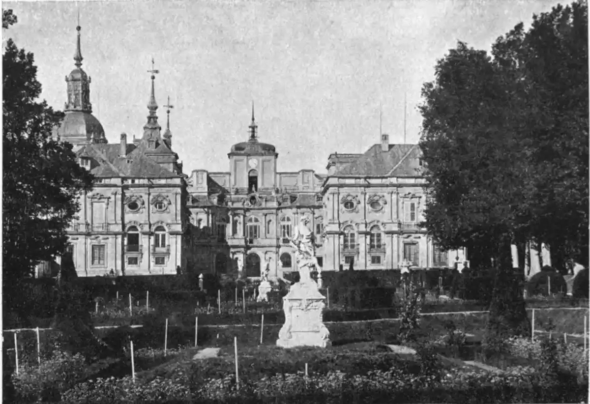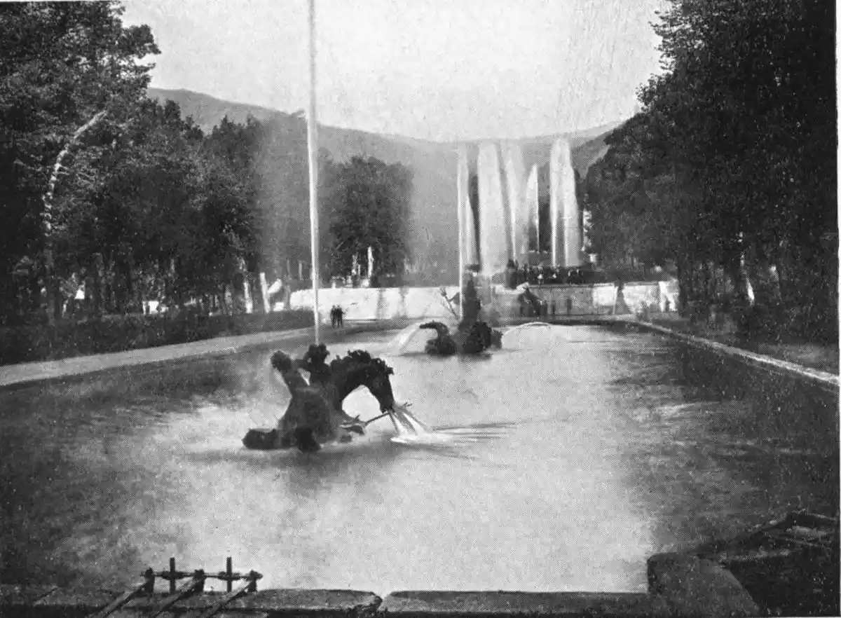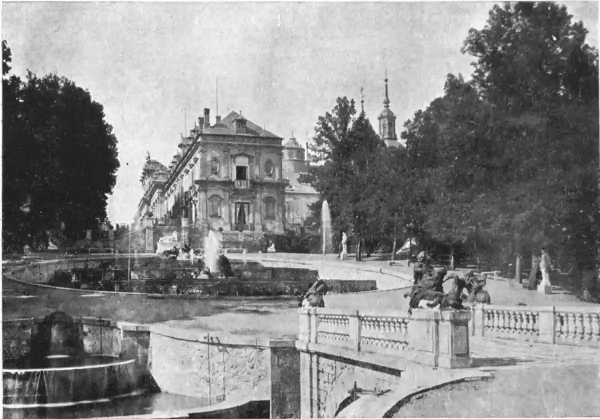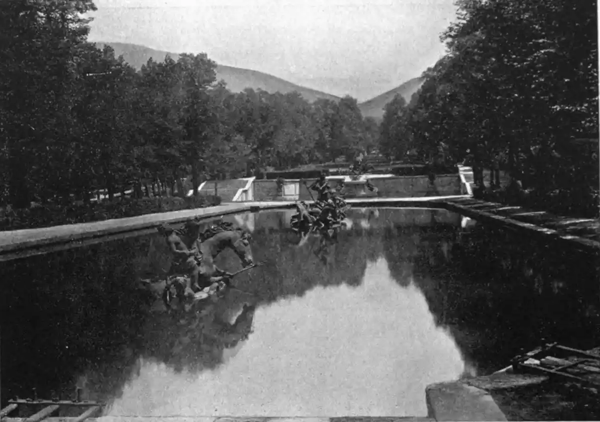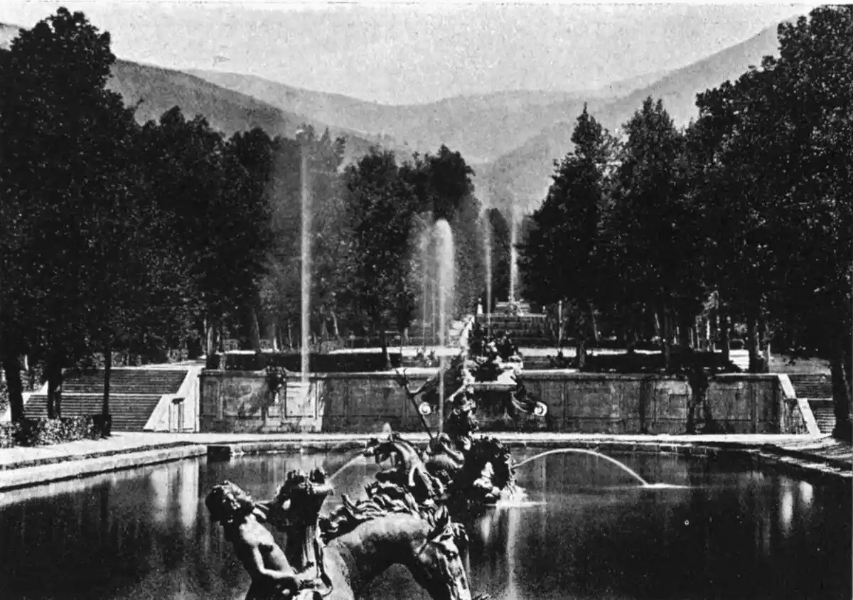 It was on the rocky eminence of La Granja, overlooking Segovia’s brown towers and the distant Roman aqueduct, that Philip V. gave orders for an estate to be laid out that should be reminiscent of his beloved Versailles. The fact that no suitable level existed on the sharp mountain slope for the erection of a palace mattered nothing. The level must be made. Tens of thousands of tons of rock were blasted away; tens of thousands of tons of soil were brought up from the sunny plain below; and on the astonishing ledge thus torn out of the sides of the mountain, the Royal Palace arose in a garden of the most beautiful flowers and adorned with the choicest fountains in all Spain.