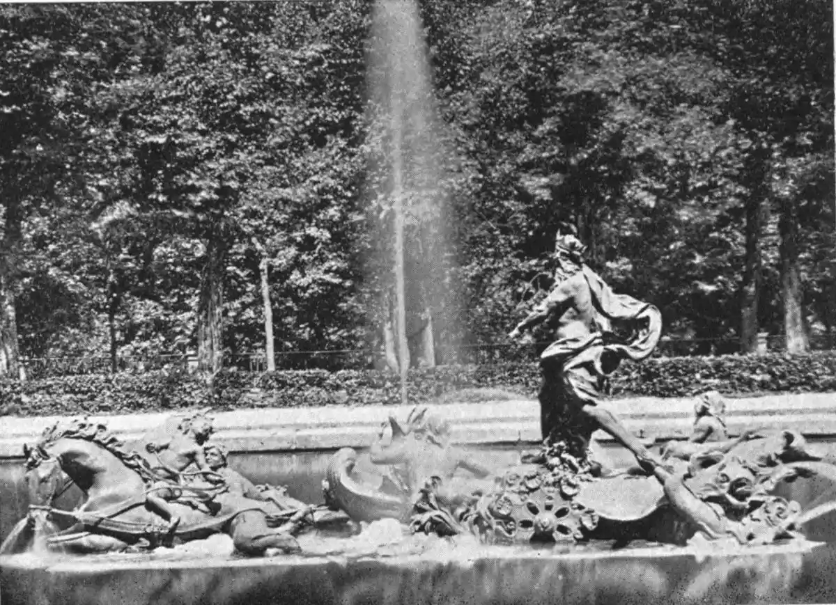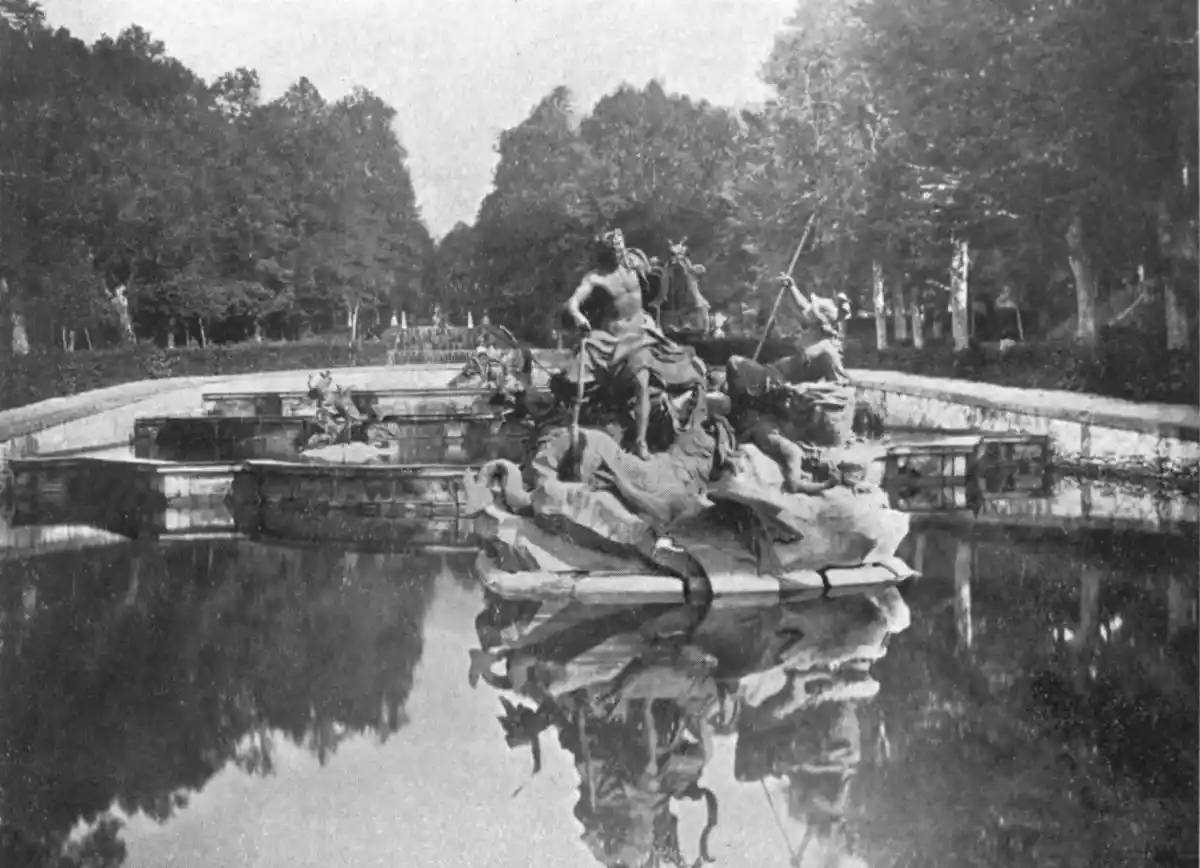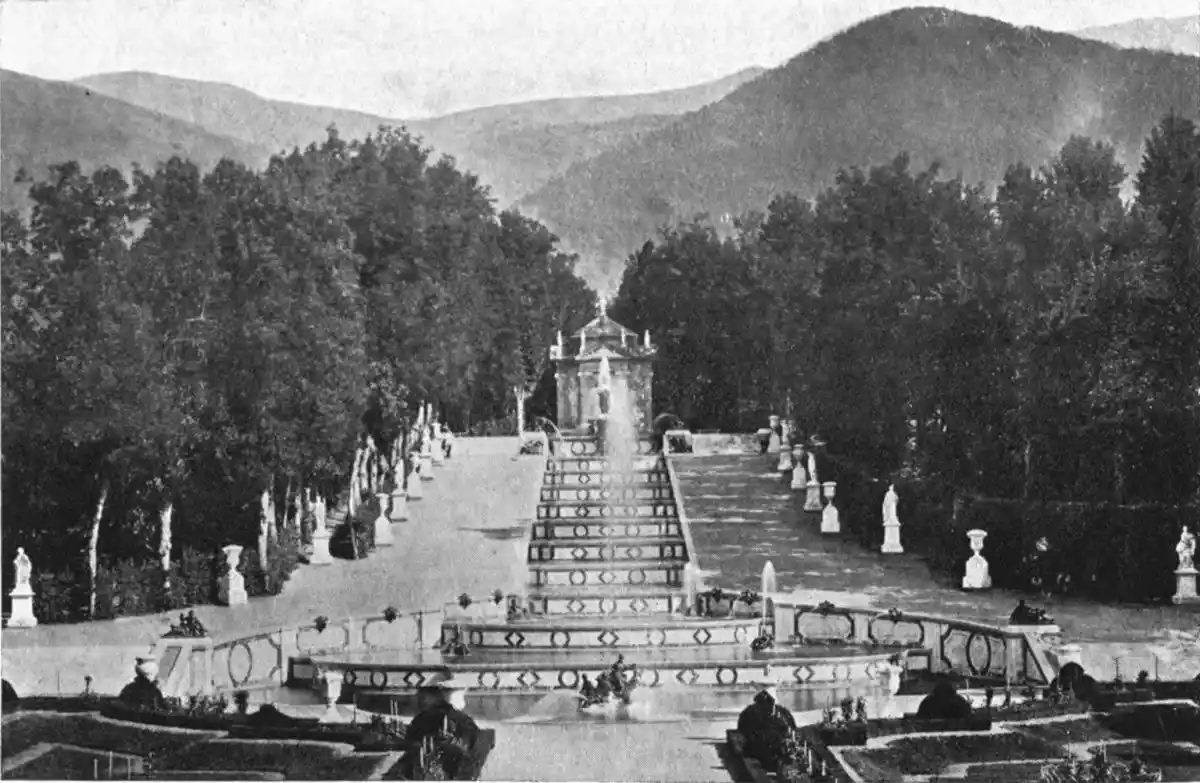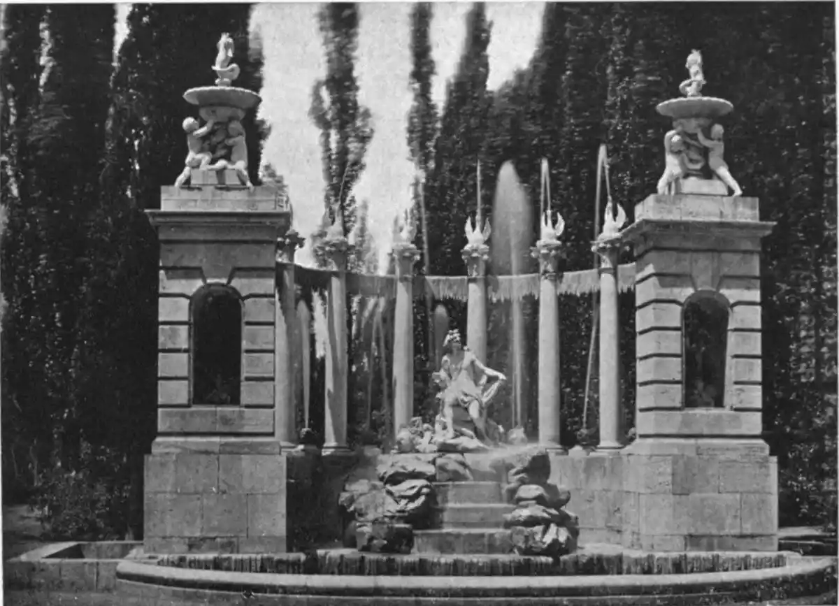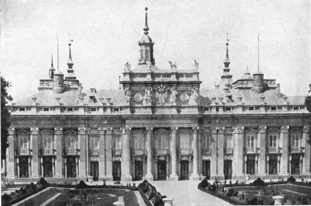 It was on the rocky eminence of La Granja, overlooking Segovia’s brown towers and the distant Roman aqueduct, that Philip V. gave orders for an estate to be laid out that should be reminiscent of his beloved Versailles. The fact that no suitable level existed on the sharp mountain slope for the erection of a palace mattered nothing. The level must be made. Tens of thousands of tons of rock were blasted away; tens of thousands of tons of soil were brought up from the sunny plain below; and on the astonishing ledge thus torn out of the sides of the mountain, the Royal Palace arose in a garden of the most beautiful flowers and adorned with the choicest fountains in all Spain.