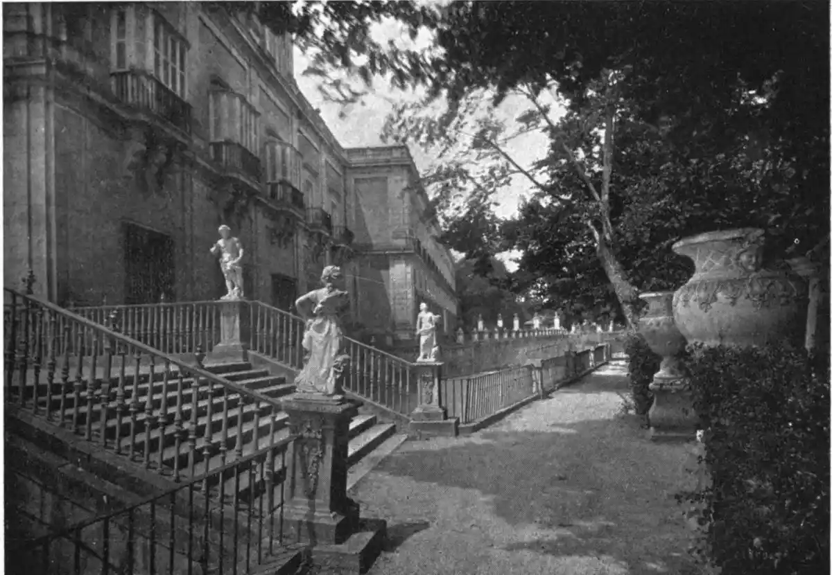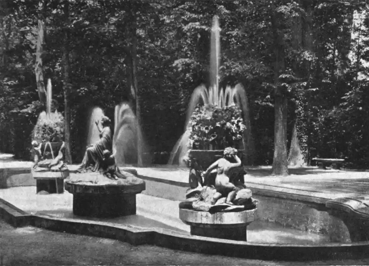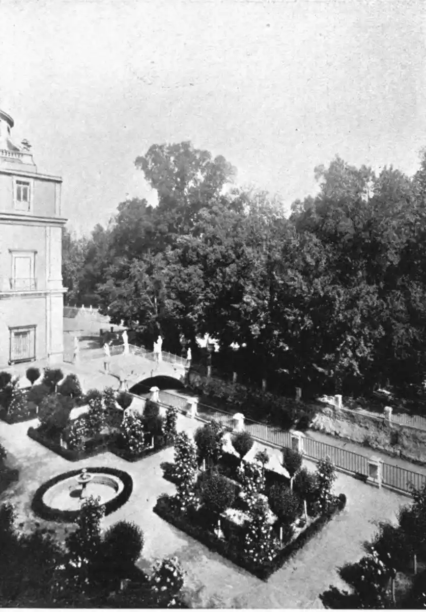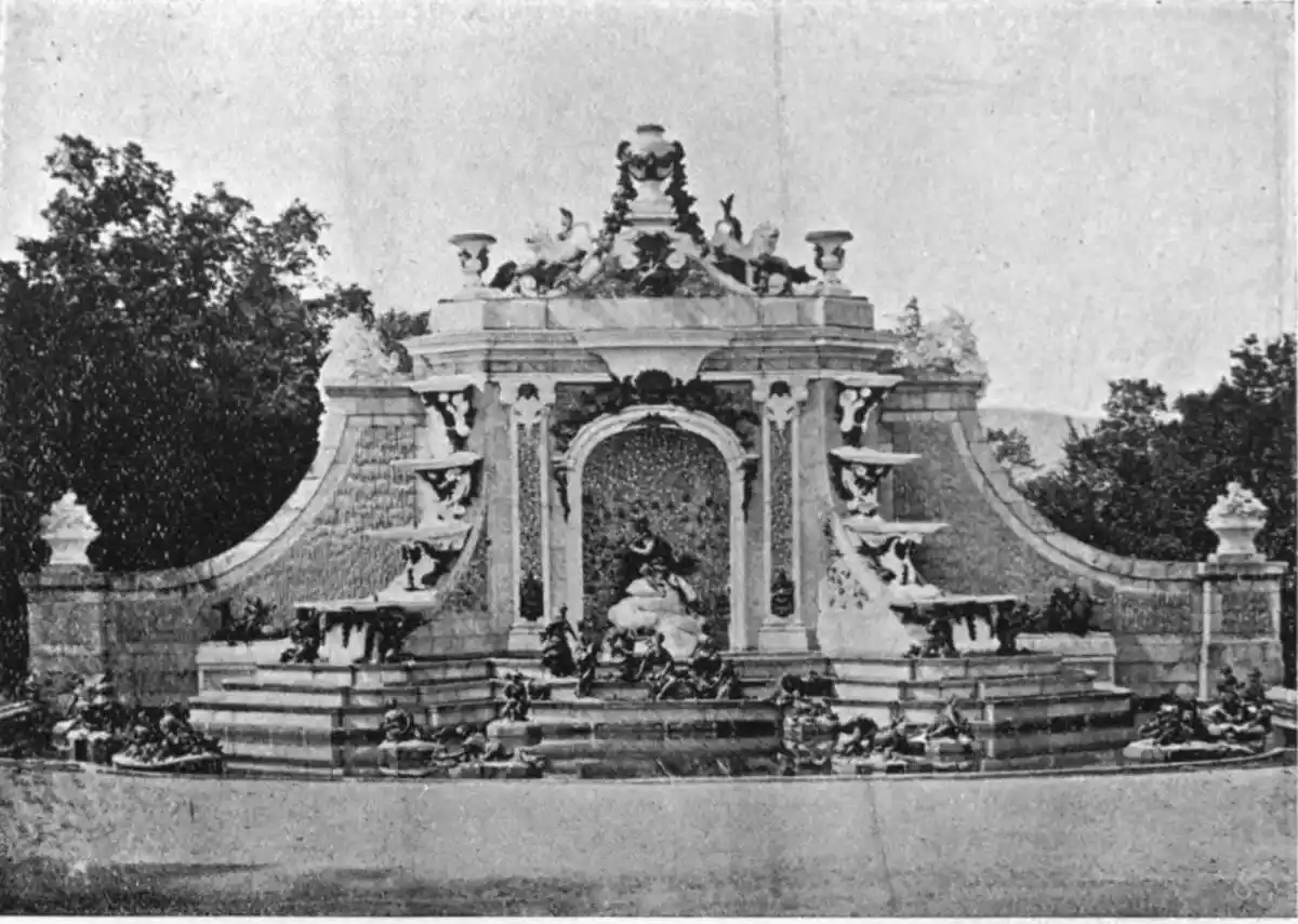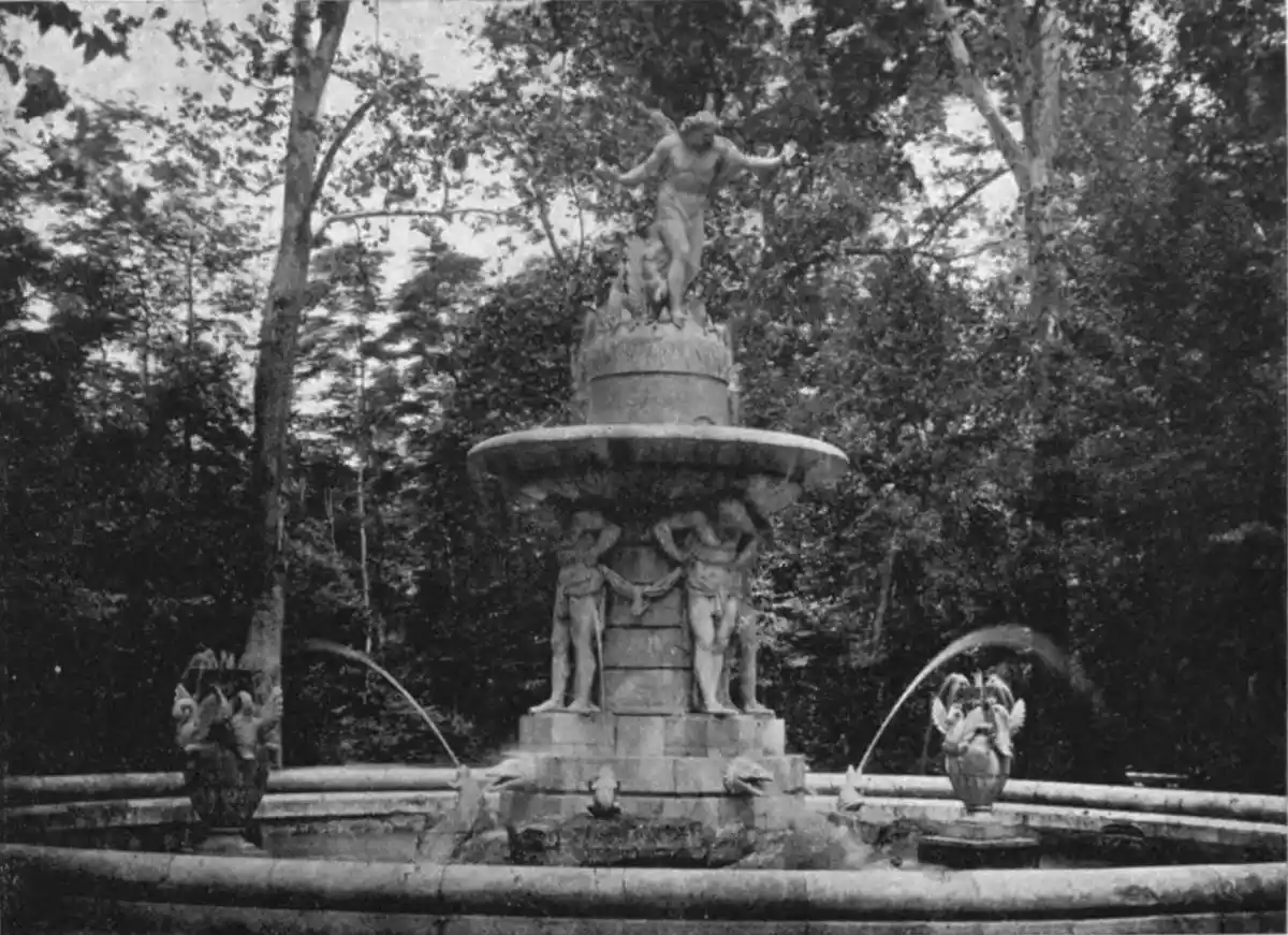 It was on the rocky eminence of La Granja, overlooking Segovia’s brown towers and the distant Roman aqueduct, that Philip V. gave orders for an estate to be laid out that should be reminiscent of his beloved Versailles. The fact that no suitable level existed on the sharp mountain slope for the erection of a palace mattered nothing. The level must be made. Tens of thousands of tons of rock were blasted away; tens of thousands of tons of soil were brought up from the sunny plain below; and on the astonishing ledge thus torn out of the sides of the mountain, the Royal Palace arose in a garden of the most beautiful flowers and adorned with the choicest fountains in all Spain.
