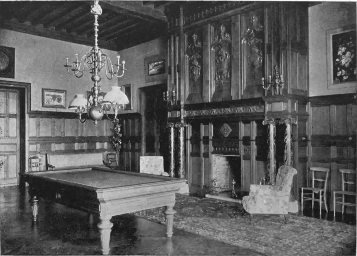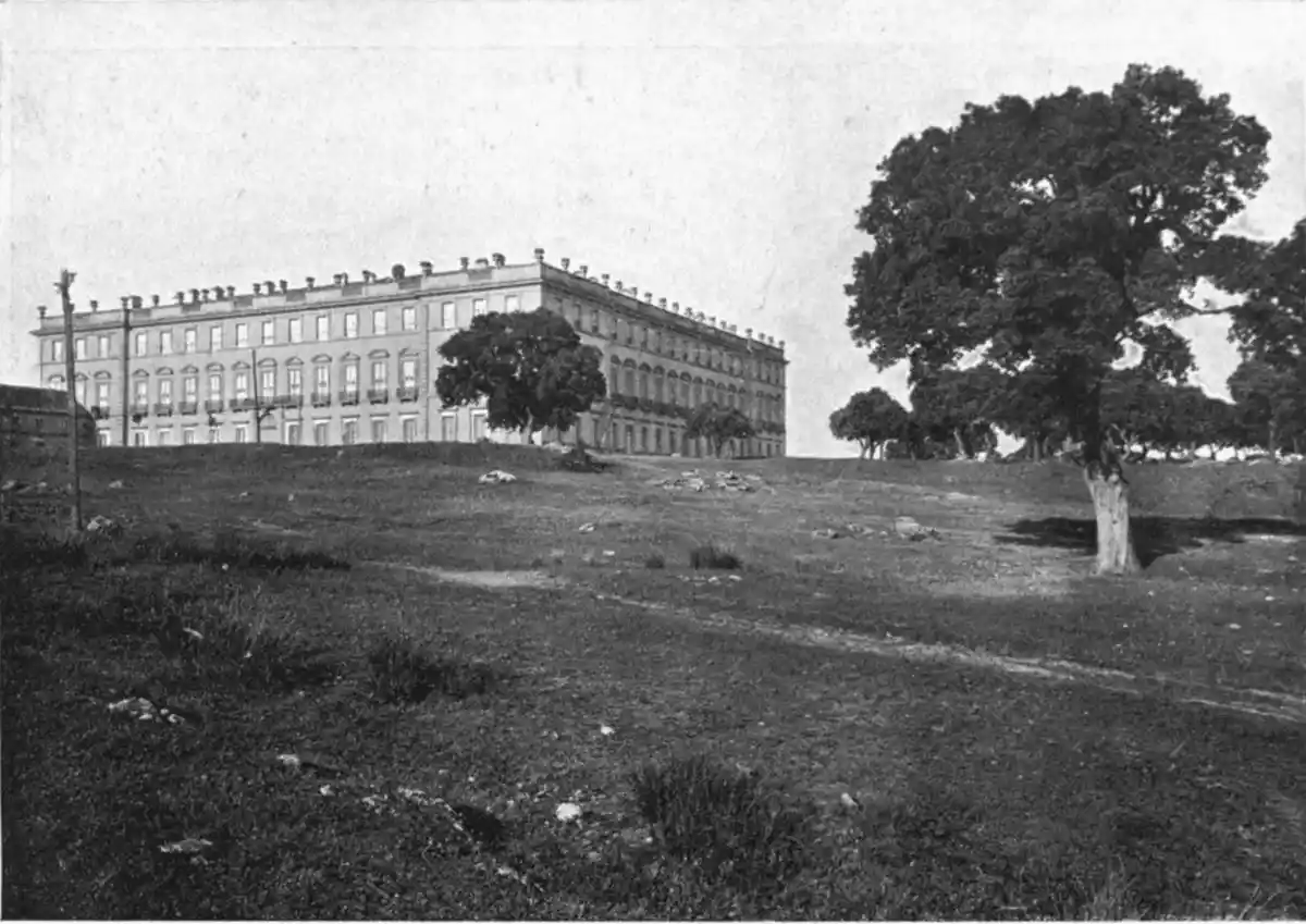 The real Casa de Campo de Miramar is composed of three departments: the palace, the offices, and the stables and coach-houses. The palace is a three-storied building, in the style of{70} an English country house. On the ground-floor, at the entrance, is a spacious central gallery, which extends nearly the whole length of the palace, dividing it into two parts. On the right are the king’s study, the library, the oratory, the reading-room and the dining-room, which is rectangular, and boasts a magnificent balcony. On the left are the hall, the official reception rooms, and the billiard-room. Between the study and the library is a large drawing-room. On the first floor are the apartments of the king and queen and the old playroom of his Majesty, all communicating with each other by a terrace which overlooks the sea and the garden. From the king’s room a tower is reached, which is surmounted by a flag-staff. The rooms occupied by the royal servants are on the upper floor. A long gallery connects the main building with the house in which are lodged the chief officials of the palace, and the stables, which are fashioned on the most modern English pattern, form a separate building.