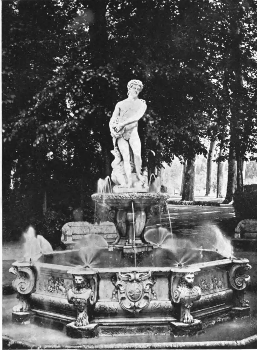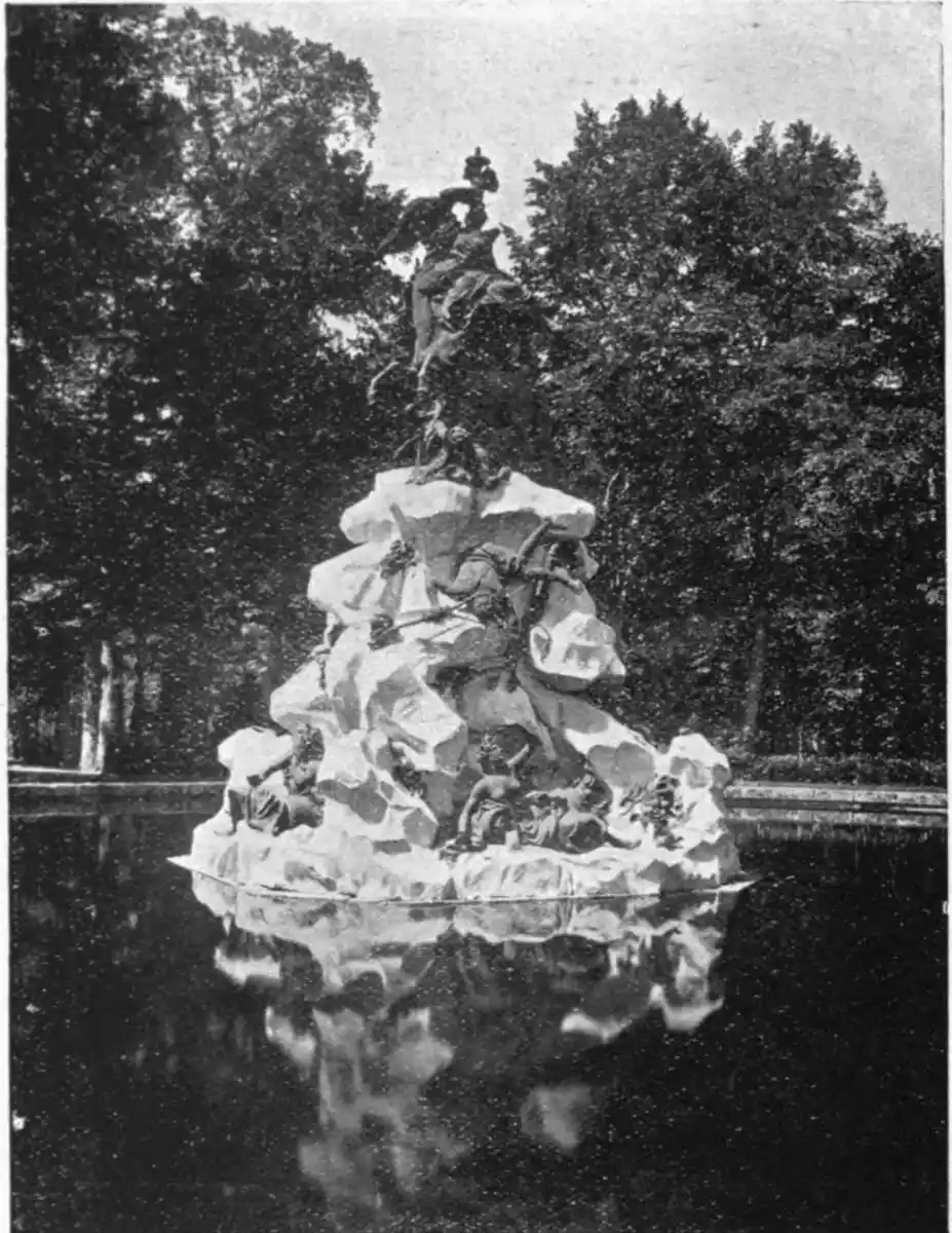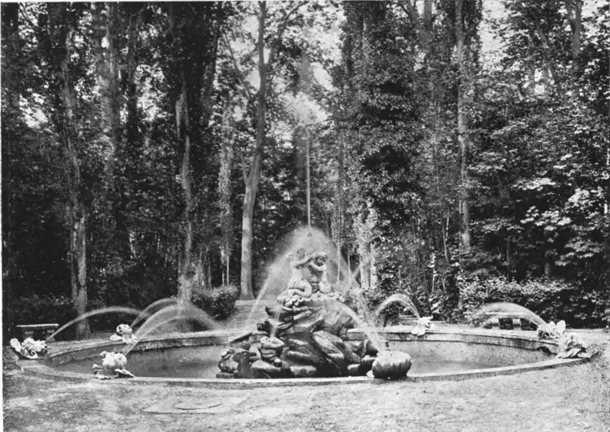 George Borrow loved Spain well, but he loved not the solitude in which Philip V. found respite from the cares of State and from the dominating personality of Elizabeth Farnese. ‘So great is the solitude of La Granja,’ he writes, ‘that wild boars from the neighbouring forests, and especially from the beautiful pine-covered mountain which rises like a cone directly behind the palace, frequently find their way into the streets and squares, and whet their tusks against the pillars of the porticos.’ But at the time this was written the country was overrun with Carlists. Candido lurked in the undergrowth, Garcia and his fellow-conspirators had driven Queen Cristina from the palace, and nine-tenths of the inhabitants of the town had fled. Even in the season La Granja may be described as solitary, but it is not desolate, to quote another word that{20} Borrow employed to describe it. Situated at an altitude of nearly four thousand feet above the sea, it has been styled, with much truth, a ‘castle in the air.’ Surrounded as it is by lovely woods, which extend for leagues in every direction, by gardens, lakes, and streams, the Palace of San Ildefonso, in the month of flowers, is a paradise and a miracle combined. For the site, although not exactly hit upon at random, was selected with a royal inconsequence of the difficulty and expense involved in the labour of transforming a monkish farmhouse into a palace rivalling the glittering creations of Versailles.