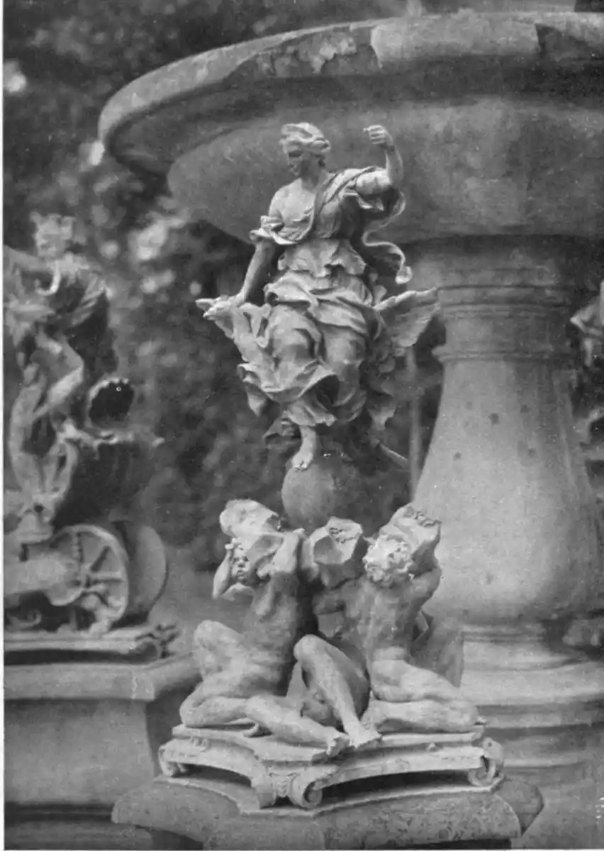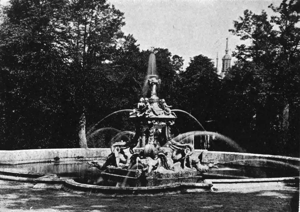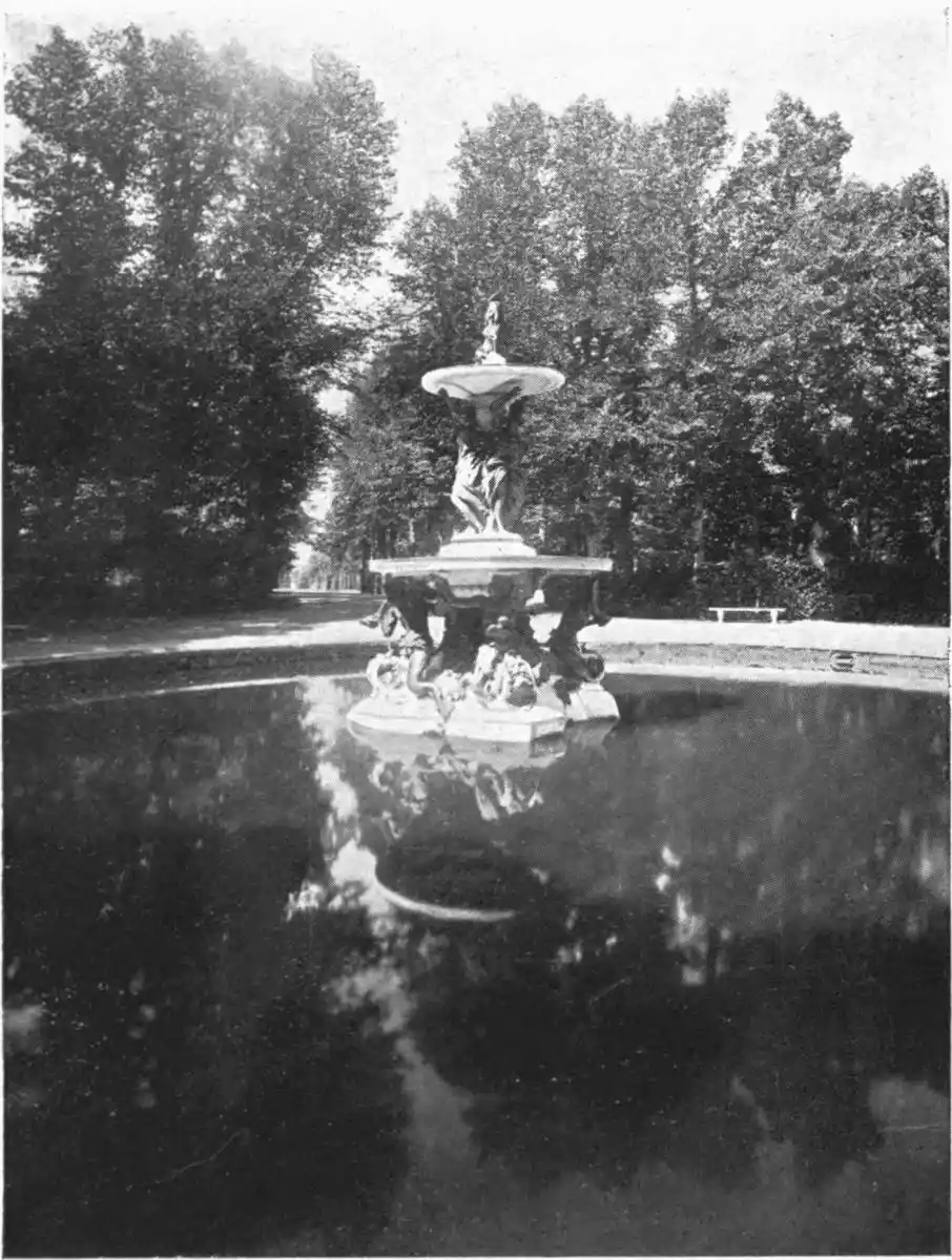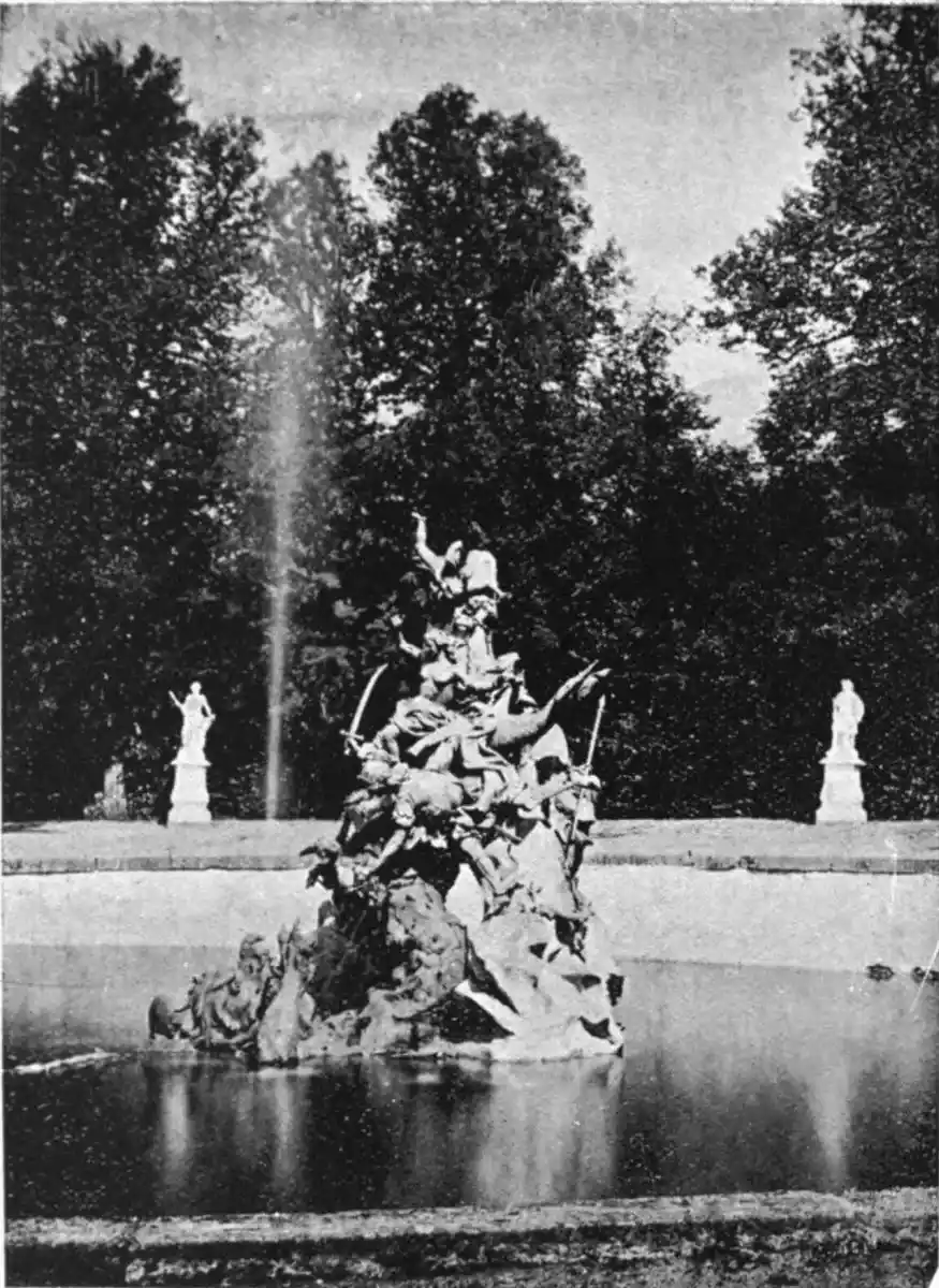 George Borrow loved Spain well, but he loved not the solitude in which Philip V. found respite from the cares of State and from the dominating personality of Elizabeth Farnese. ‘So great is the solitude of La Granja,’ he writes, ‘that wild boars from the neighbouring forests, and especially from the beautiful pine-covered mountain which rises like a cone directly behind the palace, frequently find their way into the streets and squares, and whet their tusks against the pillars of the porticos.’ But at the time this was written the country was overrun with Carlists. Candido lurked in the undergrowth, Garcia and his fellow-conspirators had driven Queen Cristina from the palace, and nine-tenths of the inhabitants of the town had fled. Even in the season La Granja may be described as solitary, but it is not desolate, to quote another word that{20} Borrow employed to describe it. Situated at an altitude of nearly four thousand feet above the sea, it has been styled, with much truth, a ‘castle in the air.’ Surrounded as it is by lovely woods, which extend for leagues in every direction, by gardens, lakes, and streams, the Palace of San Ildefonso, in the month of flowers, is a paradise and a miracle combined. For the site, although not exactly hit upon at random, was selected with a royal inconsequence of the difficulty and expense involved in the labour of transforming a monkish farmhouse into a palace rivalling the glittering creations of Versailles.
