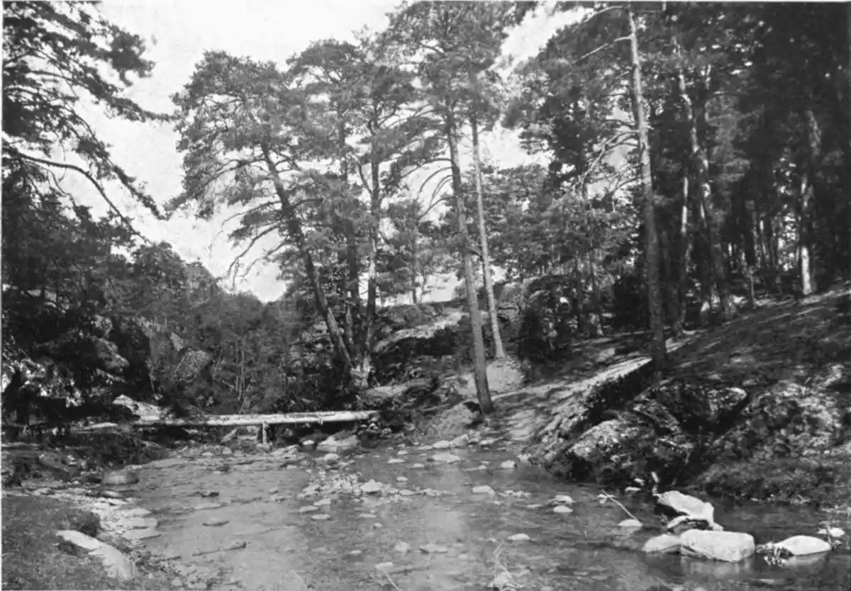 The palace, located in contiguity to the village, which consists of about two hundred houses whose inhabitants are employed on the Royal Patrimony, has a length of 432 feet and a depth of 192 feet. A tower commands each corner, and the entire building is surrounded by a moat, 30 feet wide, which once served the double purpose of irrigation and defence. The principal entrance to the estate is through the ancient and beautiful Puerta de Hierro (Iron Doorway), built about the year 1753 by Ferdinand VI. and distant about five miles from the town of El Pardo. From the doorway a wall of stout masonry, six feet high, runs right and left round the demesne for a distance of sixty-two miles. The property is intersected from north to south by the River{42} Manzanares. The stream enters on the Sierra side beneath a high stone bridge, the piers of which rest on the tall rocks that enclose the narrow pass of Marmota. From this bridge may be obtained a magnificent view of the country bounded and framed by the distant snow-clad Guadarrama Mountains. The rugged and broken ground is prolific in evergreen oaks, cork trees, and extensive areas of the cistus shrub. For purposes of defence the estate is divided into twenty departments, and the fifty warders who guard the royal residence are accommodated in twenty-six spacious and well-built houses.