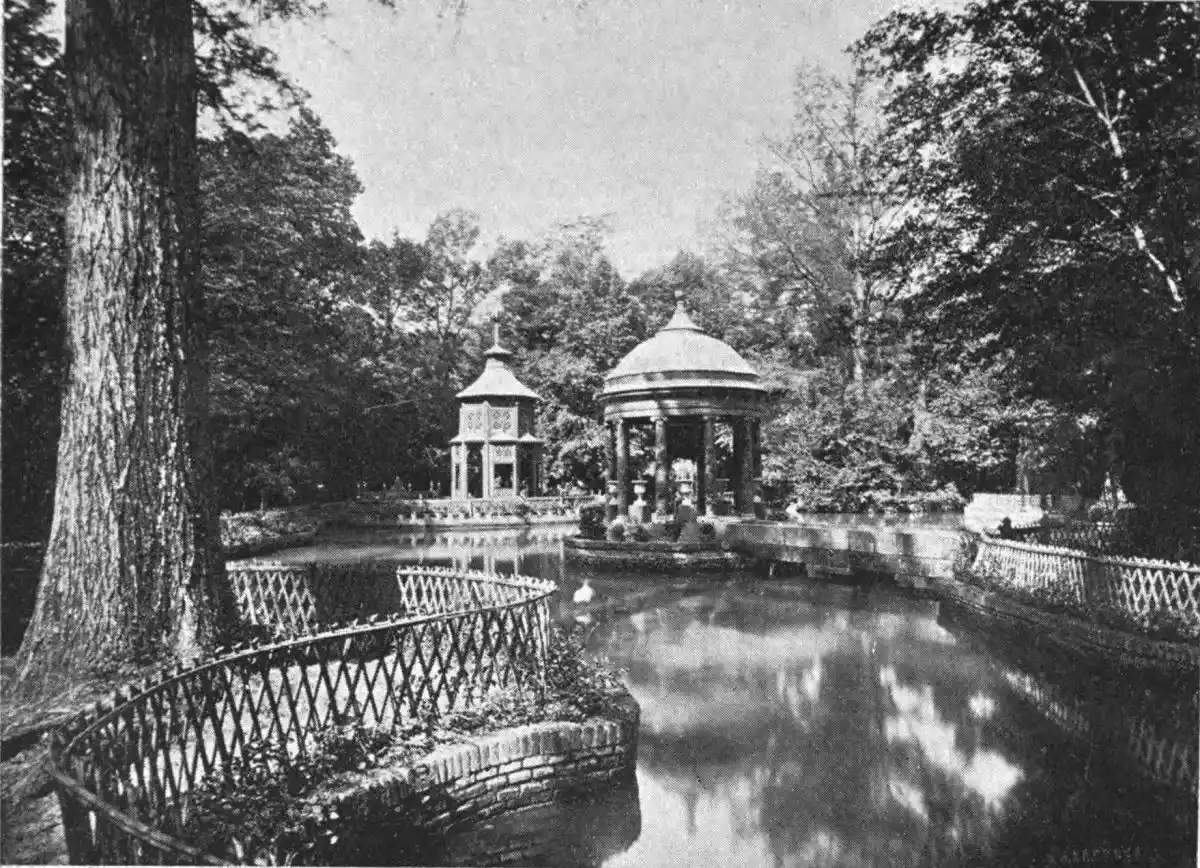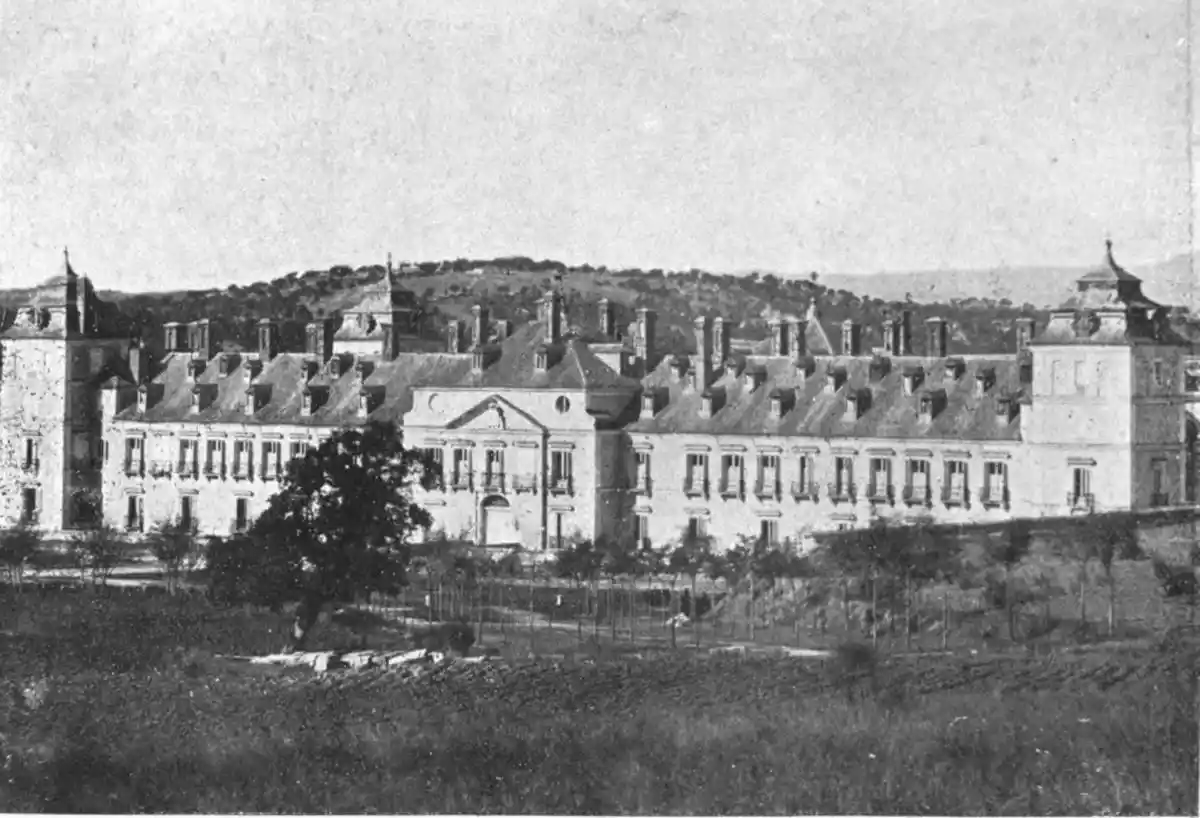 Still nearer to the city of Madrid, from which it is only divided by the River Manzanares, is the{47} royal shooting-box, called Casa de Campo, the grounds of which, abounding in beautiful scenery and stocked with well-preserved game, are twelve miles in circumference. A network of channels irrigate the estate, many fountains adorn the gardens, and the great pond is full of carp and other fish. The residence was built in the middle of the sixteenth century by Philip II., who characteristically gave orders that the house was to be surrounded by a forest. To this end a royal decree was issued on January 17, 1562, authorising the acquisition of some adjoining lands, and this tract was augmented by the king’s private purchase of the ancient and noble estate of the heirs of Fadrique de Vargas. Philip, in a fine moment, declined to have their coats-of-arms removed, saying that in a king’s palace the blazonry of the families that had rendered signal service to the State were well placed. In 1582, by order of the same monarch, additional land was purchased; and though his successors have made little alterations in the original demesne, Ferdinand VI., when Prince of the Asturias, increased it by the purchase of a tract of country valued at 1,250,211 reals, and still later a smaller area was purchased by the order of Charles III. The documents relating to{48} the acquisition of these properties have been carefully preserved, and are now in the archives of the royal house. The wall around the estate was commenced in 1736 and finished twenty-two years later; it is twelve feet high and about two feet thick, and is composed entirely of brick and solid masonry.{49}