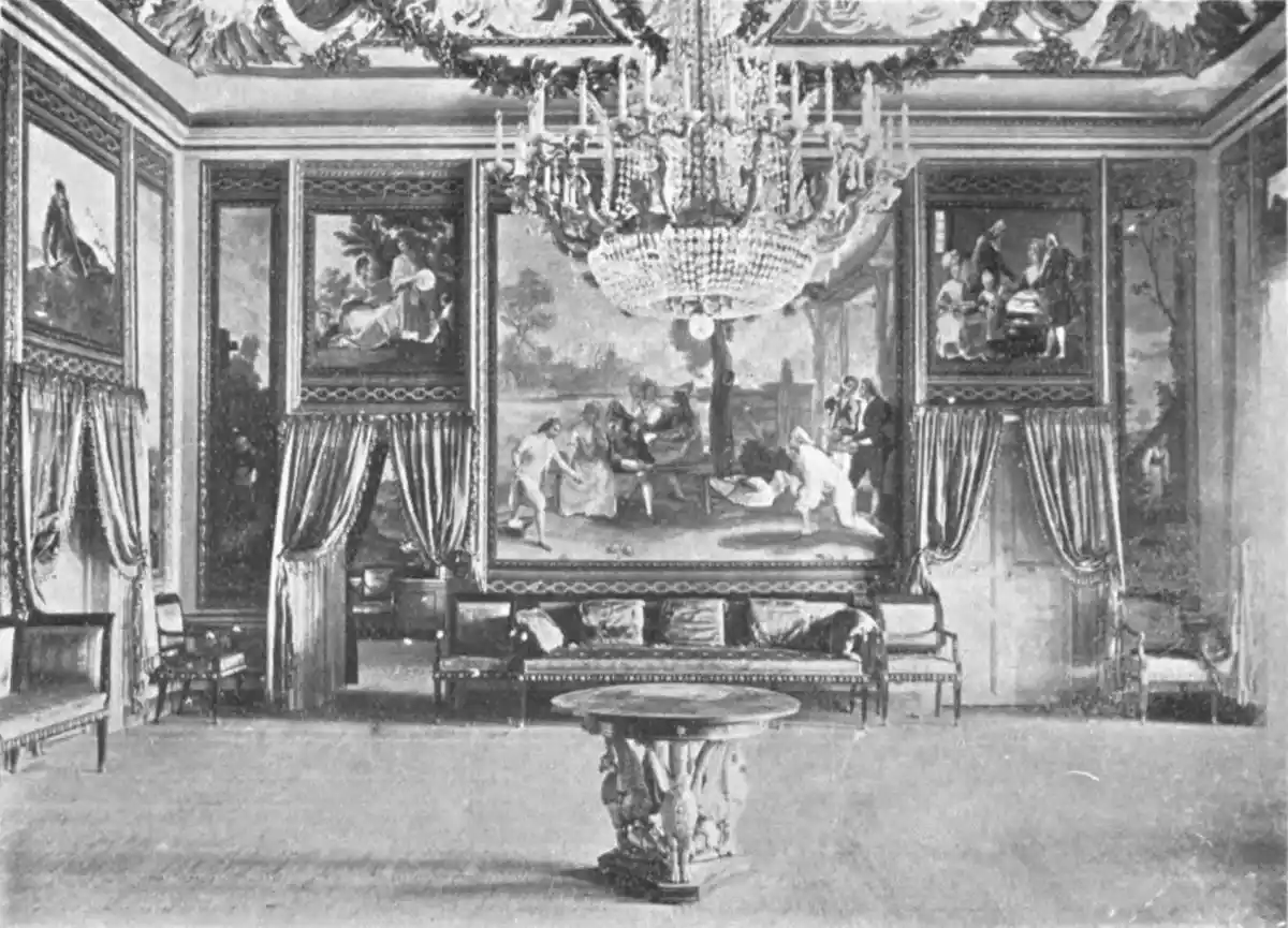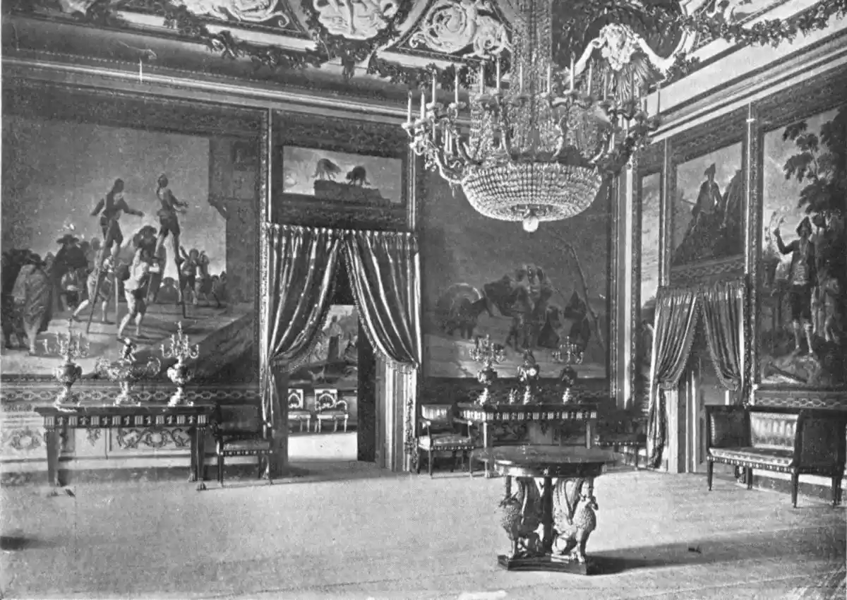 Many strange historical events have taken place in the Palace of San Ildefonso since Philip V. declared before the Baño de Diana that it had cost him three million pesetas and had amused him for three minutes. It was here, in{24} 1783, that the great king, Charles III., received the Count d’Artois when he started upon his fruitless mission to wrest Gibraltar from the English. Here, in 1796, Godoy, the notorious favourite of Charles IV. and the paramour of his wife—who in the previous year had earned the title of Prince of the Peace by negotiating the shameful surrender by which the war between Spain and France was concluded—signed the famous and fatal treaty by which Spain was dragged at the tail of France until such time as the French Emperor chose to annex it.