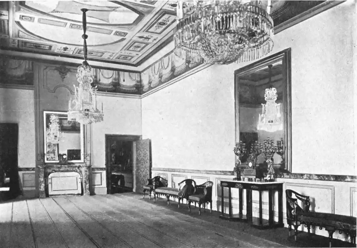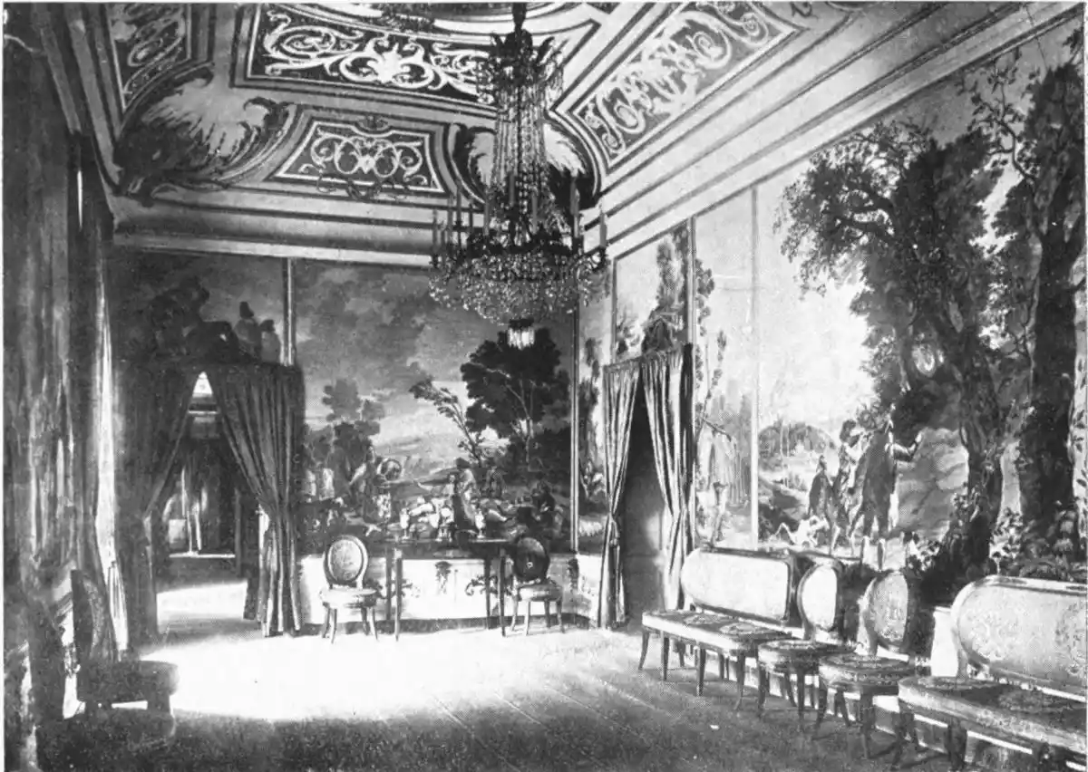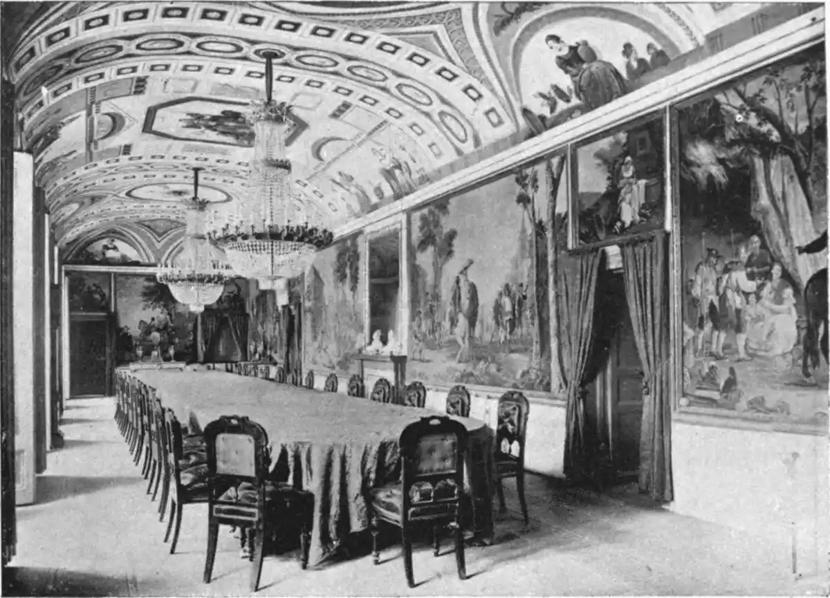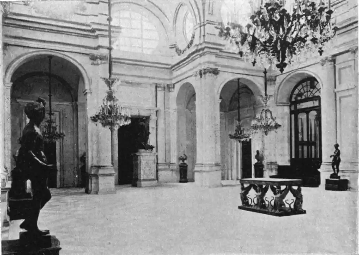 The palace is a structure of two stories. On the ground floor are the ‘Galeria baja de estatuas’ (lower gallery of statues), one of the rooms in which is the dining-room, the High Court of Halberdiers, the offices of the Lord High Steward, and other dependencies; while the upper floor consists of the ‘Galeria oficial’ (Official Gallery), used for receptions, audiences, and councils of ministers, and the private apartments of their Majesties and Royal Highnesses. The ‘Galeria de estatuas’ is open to any one provided with a permit supplied by the Administration Patrimonial when the Court is absent. The apartments are generally decorated in good style.{28} Most of the furniture is in the Empire style, especially that in the Official Gallery; but there is also some in Louis XIV., Regency, and Louis XV. style.