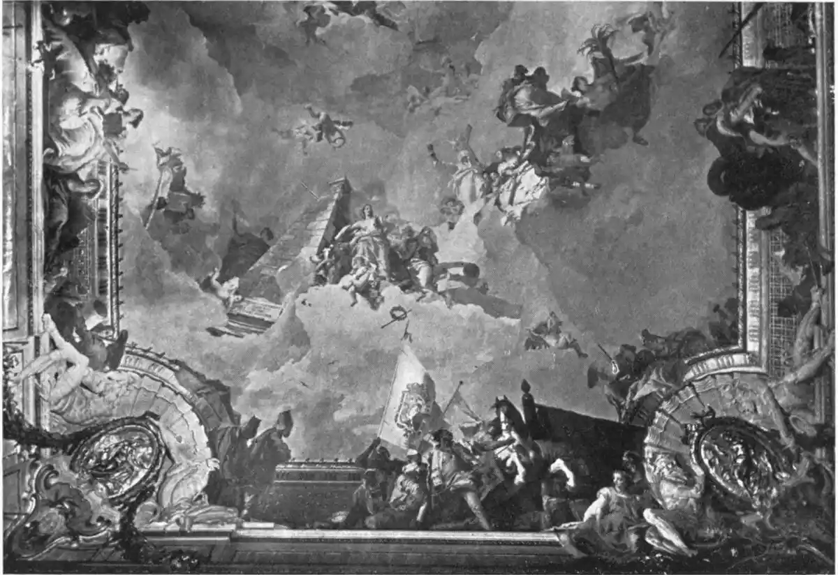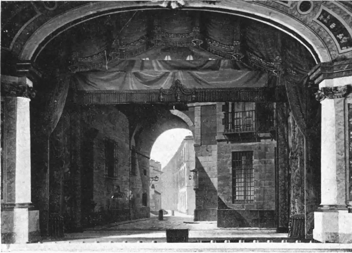 On Christmas night, 1734, the Royal Palace of the Alcazar was on fire, and the building and all its treasures were utterly destroyed. This disaster afforded Philip V. the opportunity to display his powers as a master builder. He had already created the Palace of San Ildefonso at La Granja, he had rebuilt the palace at Aranjuez, he had tinkered at the Alcazar at Seville. Now he would create a marble monument that should surpass the magnitude and magnificence of Philip the Second’s Escorial and outstrip in splendour the Versailles palace of Louis XIV. Such a work was beyond the art of the followers of Churriguera: he sent to the Court of Turin for the Abbé Felipe de Juvara, the Sicilian, and confided to him the scheme of the palace that he would raise on the heights of San Bernardino. It was to be a square edifice of the composite order, having four façades, each 1700 feet long, it was to contain twenty-three courts, approached by thirty-four entrances from the exterior, and be completed with gardens, churches, public offices, and a theatre. It was to be a collection of palaces under one roof, and the colossal model of the building, which is preserved in the Galeria Topografica of the Madrid Museum, conveys some idea of the marvel of architecture which the king{94} and his designer had conceived between them. But the palace on the San Bernardino hill was never begun. The ruling ambition of the masterful Elizabeth Farnese was to advance the interests of her children, and she begrudged the expense which the colossal building would entail. She raised so many difficulties and delayed so long the adoption of the plans that Juvara died of hope deferred, and Giovanoni Battista Saccheti came from Turin to carry on the work. The queen by this time had exhausted Philip’s resistance to her will, and Sacchetti’s less pretentious design, traced among the still smouldering ruins of the ancient Alcazar, was adopted on 7th April 1737.