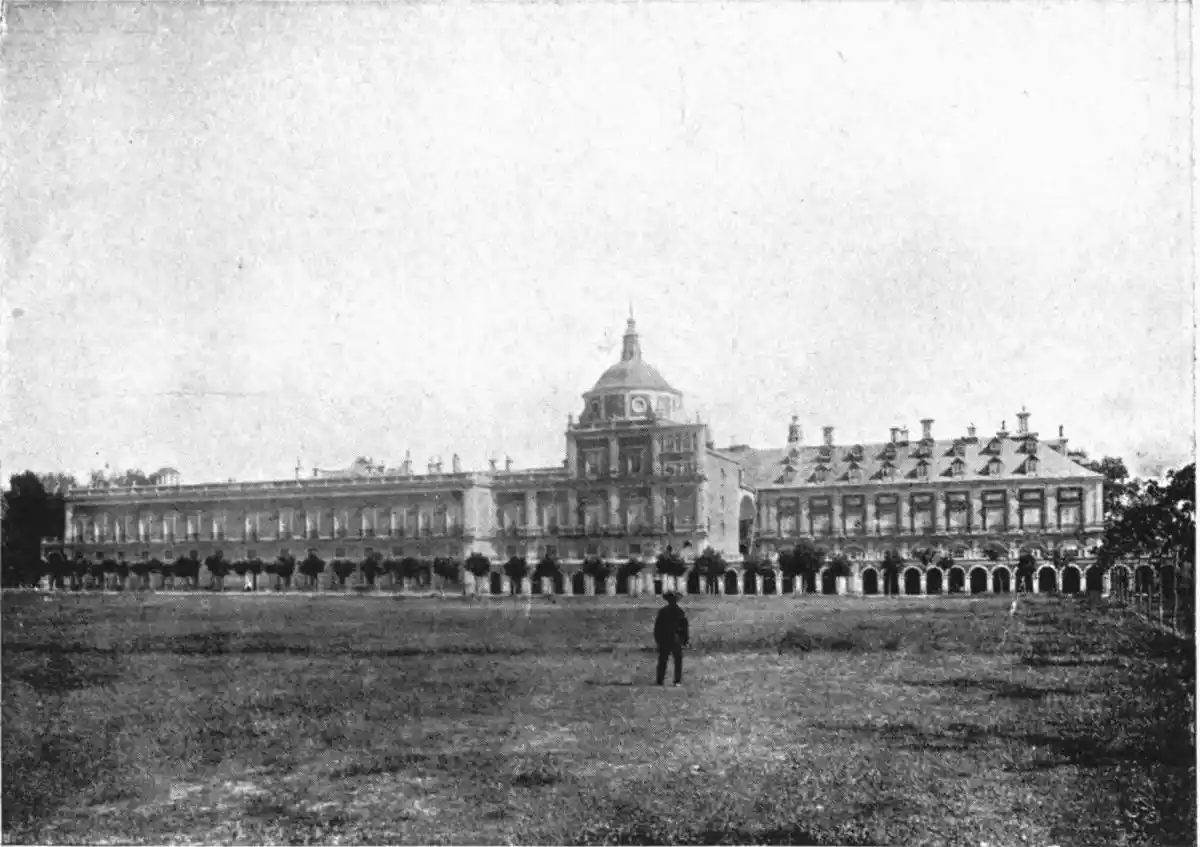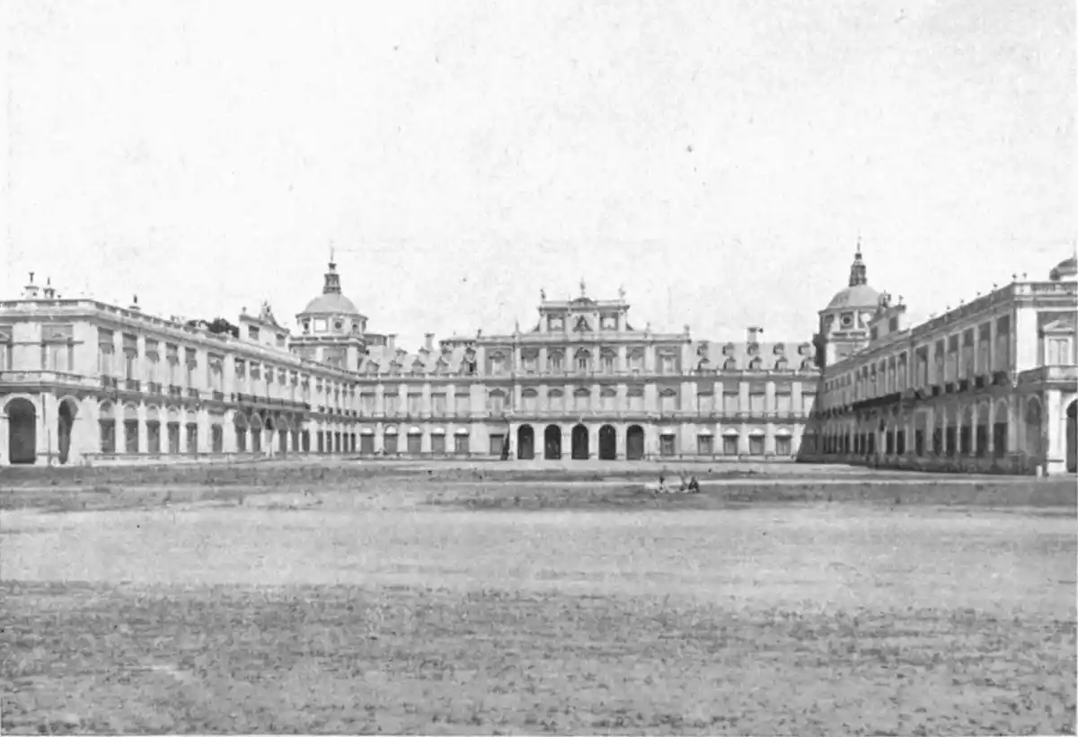 Philip V. was better advised when he decided to erect a palace on the site of the master of the Order of Santiago’s summer residence than when he wrested a foothold for La Granja from the side of the mountains of Segovia. The royal home at Aranjuez is charmingly situated in the midst of avenues of stately elms and sycamores at the confluence of the Tagus and Jarama—a verdurous oasis in the midst of treeless, waterless Castile. He constructed the palace and the public chapel from stone taken from a quarry in the district{51} of Colmenar, which he bought for the purpose. The timber he procured from the mountains of Cuenca, and the lead for the roofing from some mines that existed near Consuegra. Philip III. enriched the gardens with many of the fine bronzes and marbles that are to be seen there, and some of the splendid fountains were also added by his orders; but the Parterre department which Philip II. laid out was completed by the art-loving Philip IV., who furnished the busts of the Roman emperors, the statues, and the beautiful medallions. In 1748 the palace was again on fire, and the principal façade was restored by Ferdinand VI. in its present more elegant form.