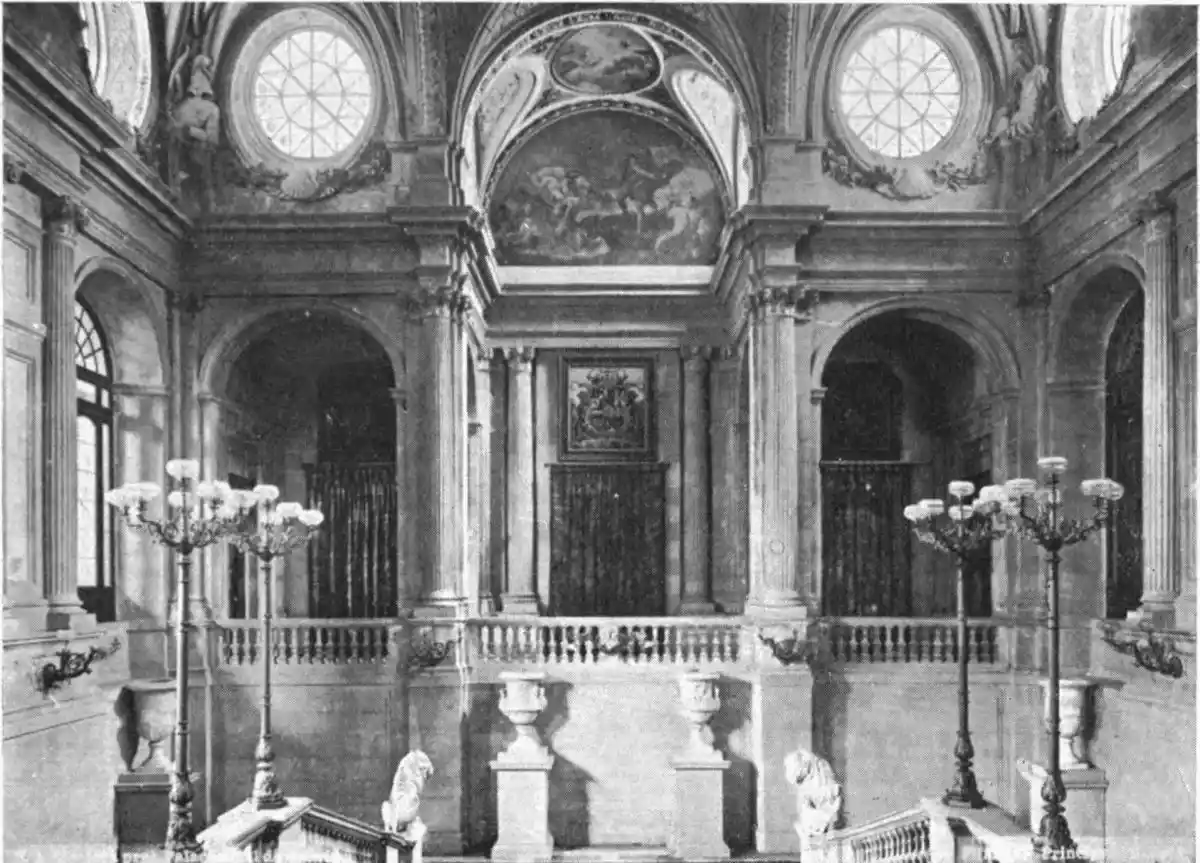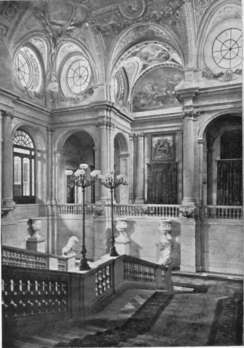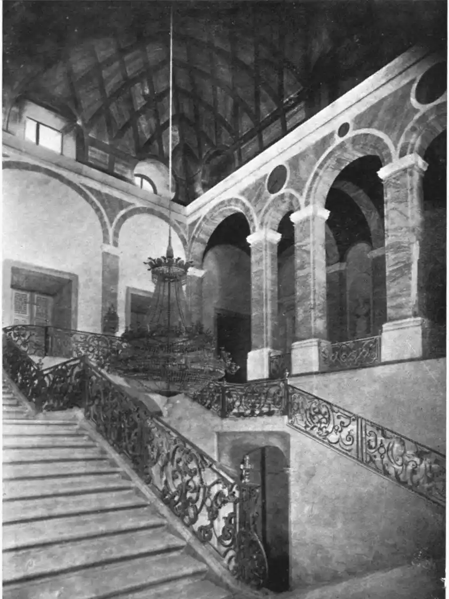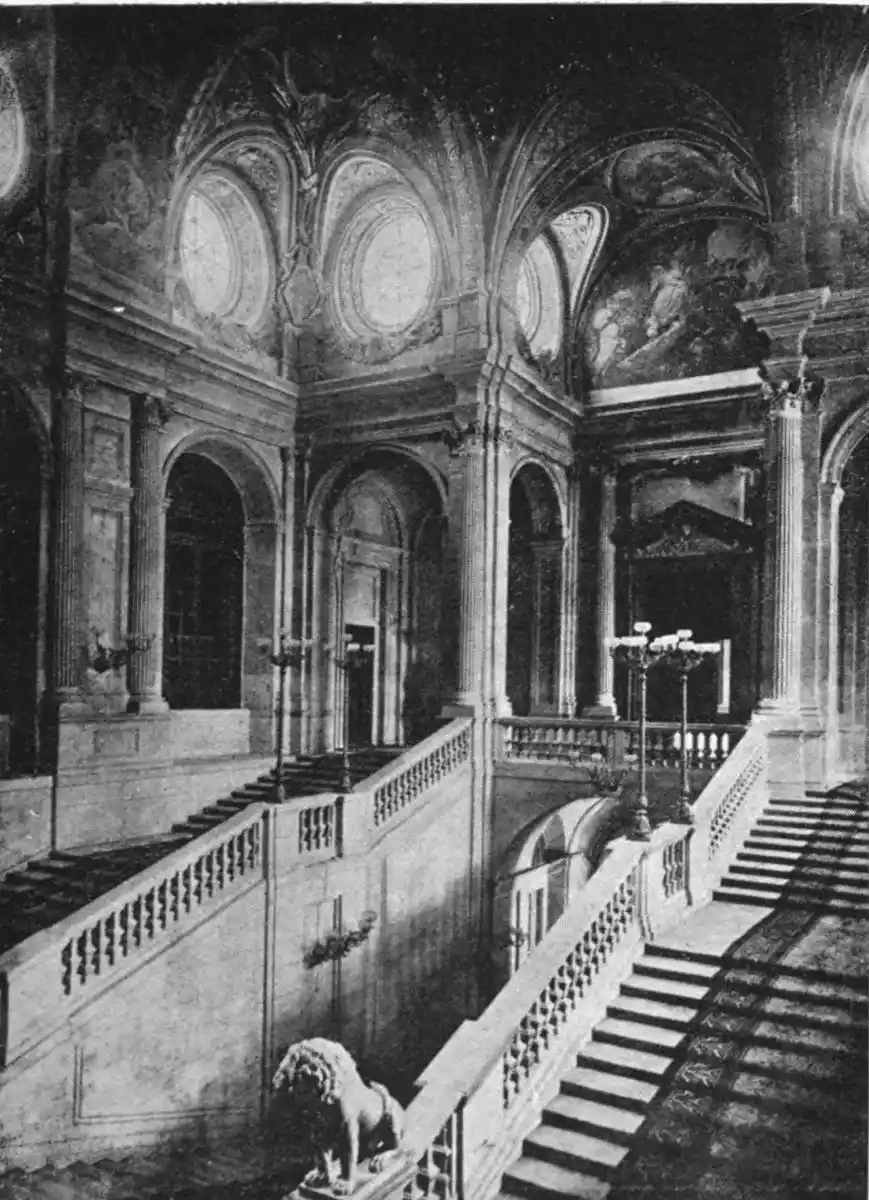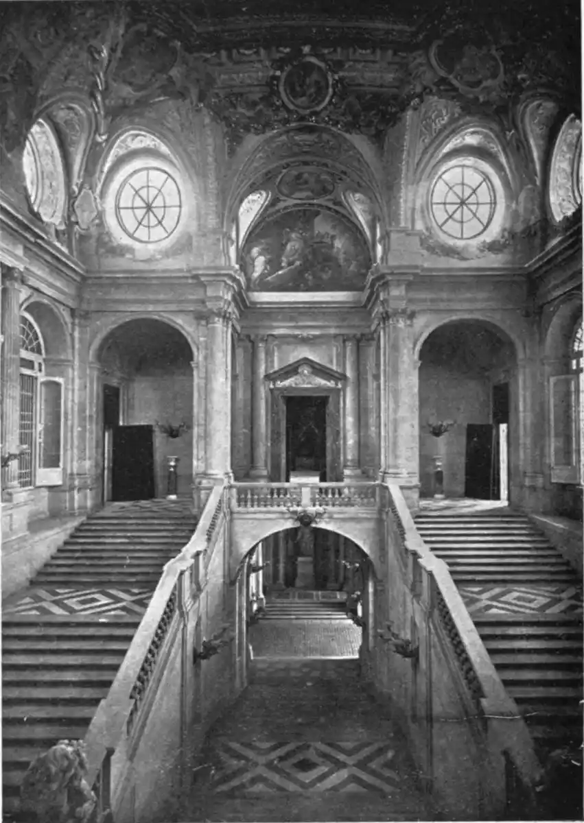 Still more recently, it will be remembered, Alfonso XIII. carried his English bride from the wedding festivities of Madrid to spend their honeymoon amid the natural beauties of the scenery of Segovia. The Royal Palace consists of a large rectangular building, in the centre of which is preserved the ancient cloister of the friars’ hospitium, now called the Patio de la Fuente. The idea for the central façade of the palace originated with the Abbé Juvara, the Italian architect who was summoned to Spain to assist Philip V. in his palace-building operations, but it was his pupil, Sachetti, who prepared the finished designs. It was carried out in 1739 at a cost of 3,360,000 reals. The general façade of the edifice at the back, overlooking the Palace Square, recalls the Roman-Spanish style created at the Escorial by Herrera. One of the best views of the palace is from the back, where the building with its slate-covered towers at the sides, and the Collegiate Church in the centre, surmounted by its elevated cupola and the simple towers accompanying it, compose an agreeable picture. The principal entrance to the edifice is in this façade facing the Palace Square, and leads{27} to the vestibule of the principal staircase. This is of simple construction, and is composed of two flights of stairs which meet at the top landing-place. The steps are of granite, as well as the pillars of the balustrade which support a small iron banister painted white and gold. The whole well of the staircase is surmounted by a semicircular vault finished by a lantern, in which are the windows. This staircase did not exist in the time of Charles IV., as may be ascertained by examining the plans of the palace made at that time, and its construction should be attributed to Ferdinand VII.