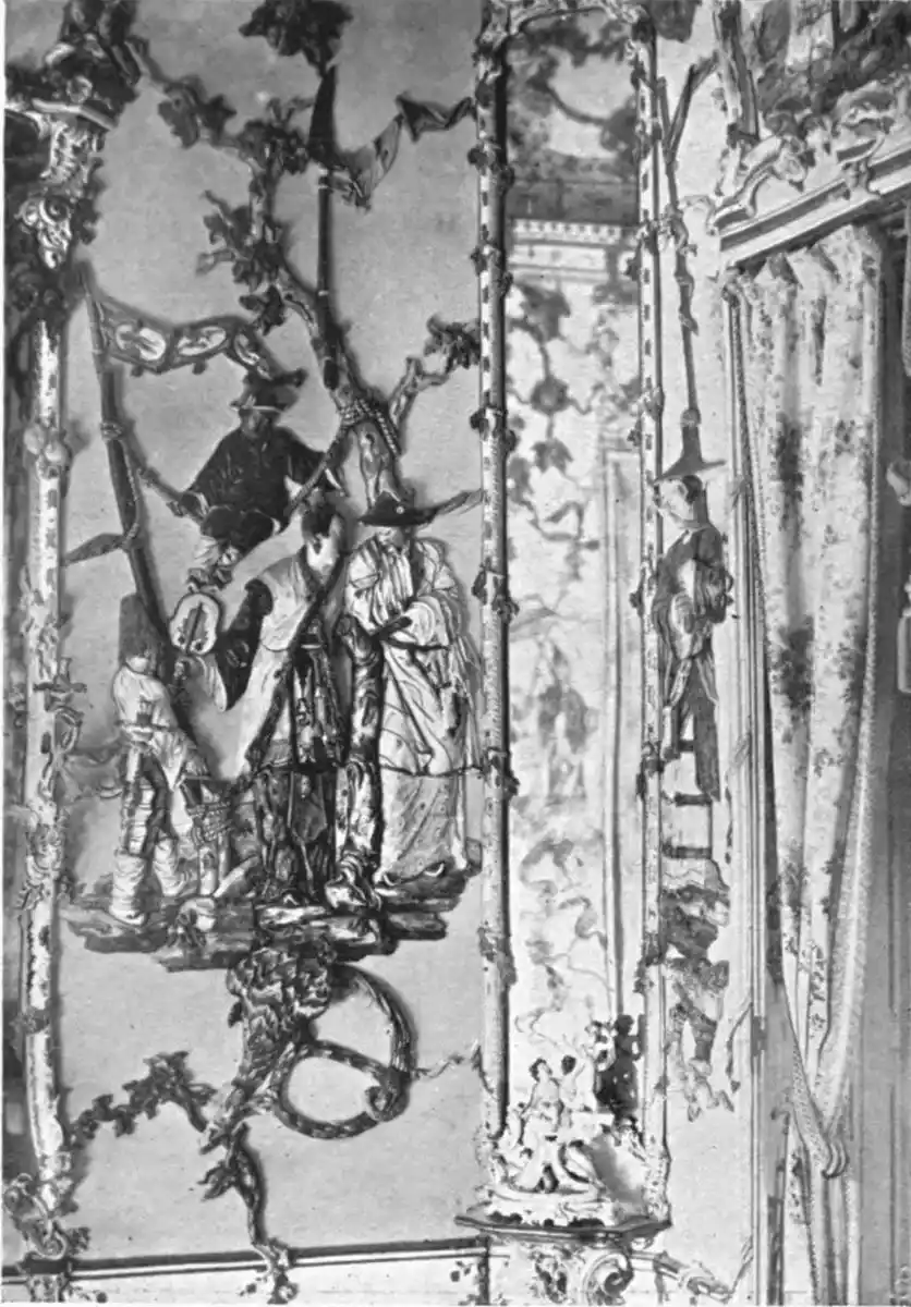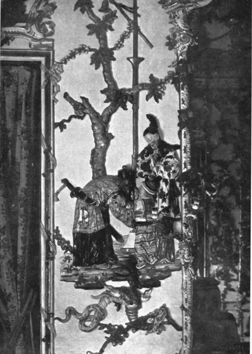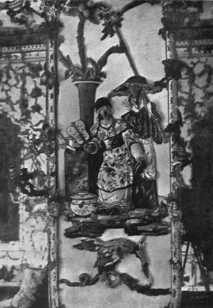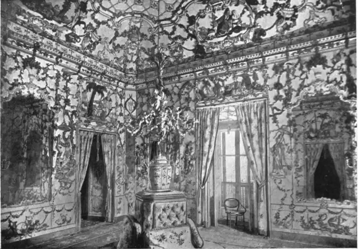 The ball-room and the dining-room, even the Moorish room, in which Rafael Contreras has revived the beauties of the Alhambra, are surpassed by the music-room, which is the finest saloon in the palace. Here all the decorations are Chinese in character, worked out and enamelled with great skill; and the chandelier, which is in one piece, is an exquisite specimen of workmanship. The walls of this room are entirely covered with large porcelain plaques, representing in high relief groups of beautifully modelled Oriental figures. The looking-glasses,{57} made at La Granja, with their frames composed of fruits and flowers, enhance the effect. Joseph Gricci, who modelled and painted the music-saloon, was one of the artists brought over from Naples by Charles III. in 1759, when he established in Madrid the factory of Buen Retiro. In addition to this superb porcelain, the palace boasts a bedstead of splendidly carved lignum-vitae, and some pictures by Bosch (Jerome van Aeken), a painter of the sixteenth century, who is almost unknown outside Spain. These canvases represent fantastic subjects and allegories in the style of Breughel, and were highly praised by the critics of his time.