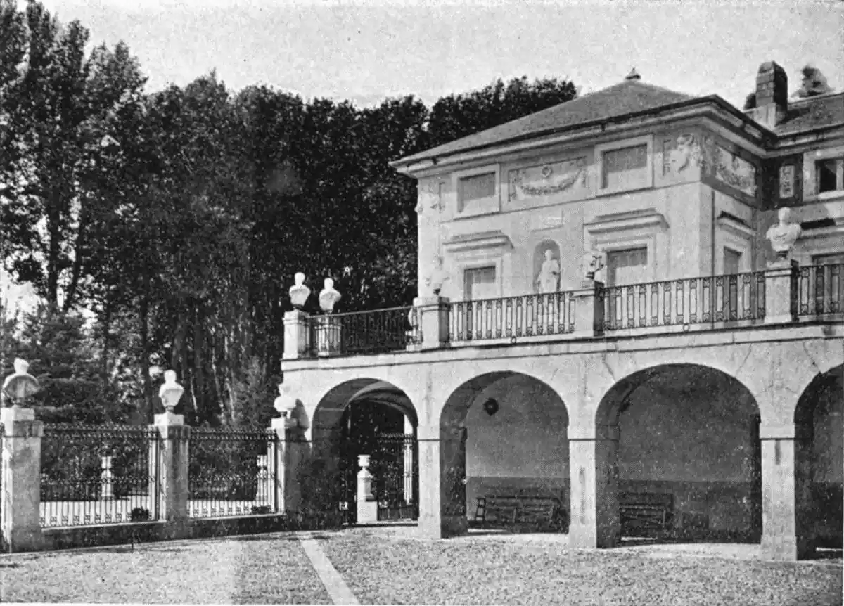 The Casa del Principe was built in 1772 by order of Charles IV., when Prince of the Asturias. When the War of Independence broke out the treasures that adorned it were taken to Madrid and many of them disappeared. It was redecorated and embellished in 1824, and carefully restored some years later. It is entirely built of stone and is called ‘Casita de Abajo,’ to distinguish it from another called ‘Casita de Arriba,’ built by the Infante Gabriel. The curiosities and works of art in this pleasant edifice are innumer{17}able. Of the ceilings twenty are of great merit, painted by Duque, Gómez, Gerroni, Maella, Briles, Pérez, Japeti, and López. In the nineteen rooms, of which the two floors of the edifice consist, there are over two hundred oil-paintings and prints, the subjects for the most part religious, some of them of real merit. There is also a fine collection of ivory reliefs consisting of thirty-seven pictures, representing mythological and sacred and profane scenes, and a beautiful collection of two hundred and twenty-six pieces of porcelain made at the Buen Retiro factory. In the time of Ferdinand VII. the house was valued at thirty-seven million pesetas, and it is at present a veritable museum of curiosities.