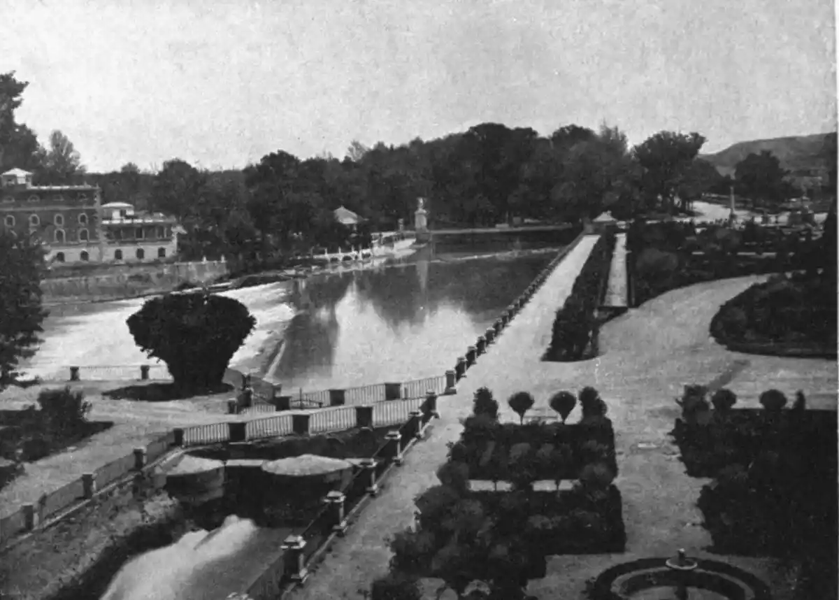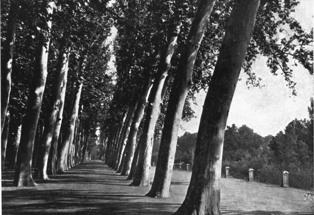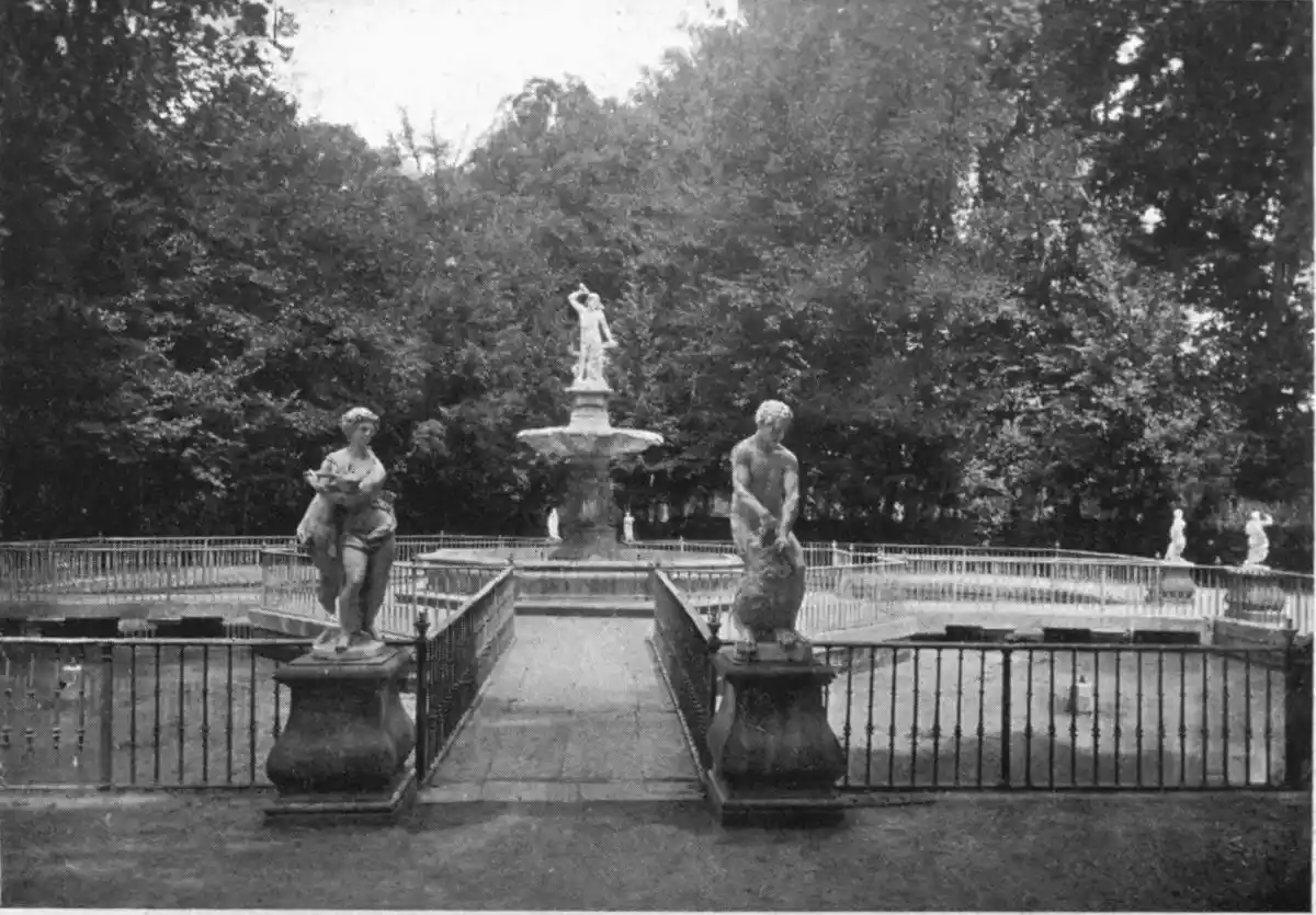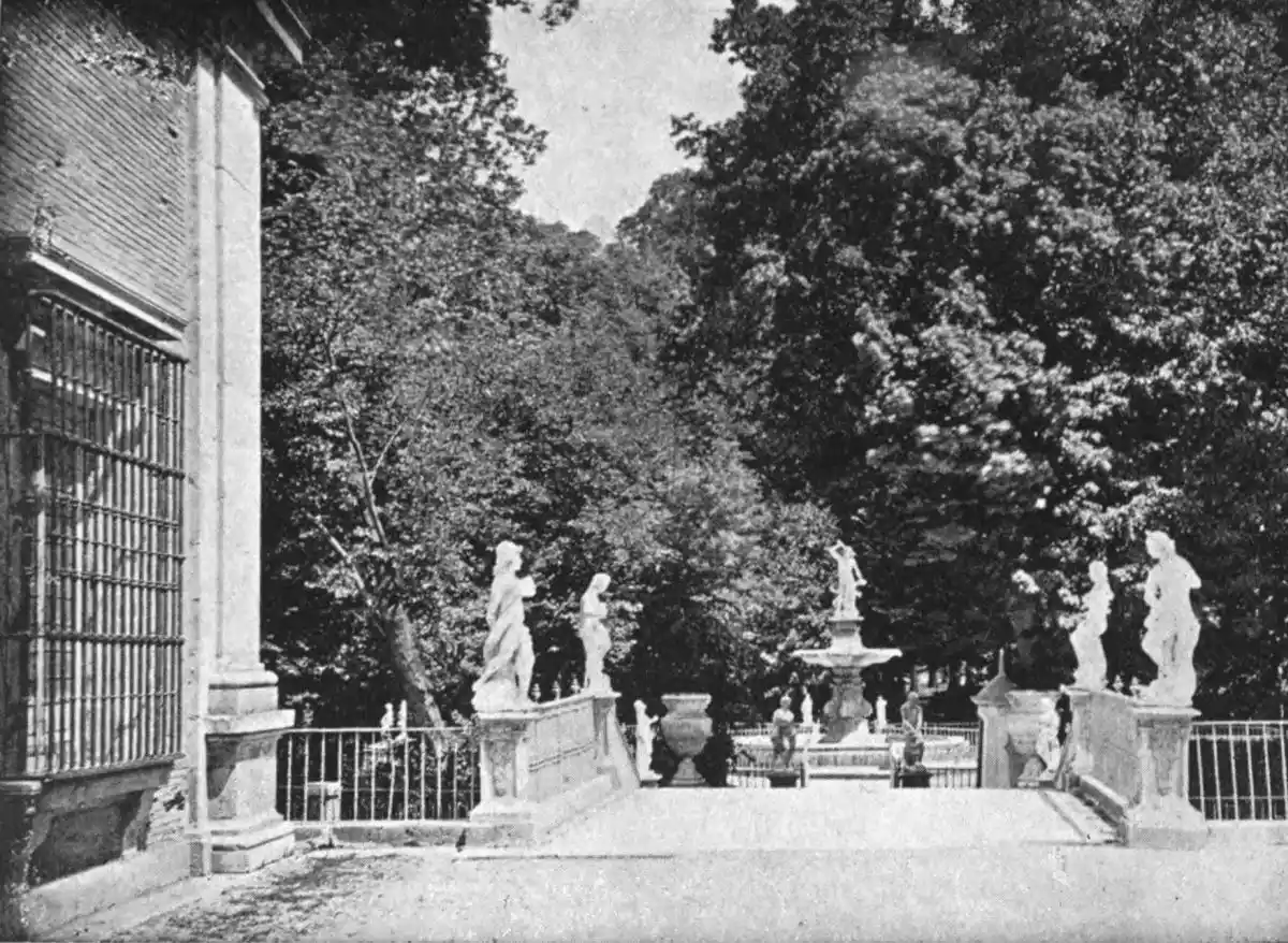 ‘The interior of the royal building is superb, but all the riches of the palace do not compare with the view of the gardens, which seem to have been laid out for the family of a Titanic king, to whom the parks and{60} gardens of our kings must appear like terrace flower-beds or stable-yards. There are avenues as far as the eye can reach, flanked by immensely high trees, whose branches interlace as if bent by two contrary winds, which traverse in every direction a forest whose boundaries one cannot see; and through this forest the broad and rapid Tagus describes a majestic curve, forming here and there cascades and basins. A luxurious and flourishing vegetation abounds between a labyrinth of small avenues, cross roads, and openings; and on every side gleam statues, fountains, columns, and sprays of water, which fall in splashes, bows, and drops, in the midst of every kind of flower of Europe and America. To the majestic roar of the cascade of the Tagus is joined the song of innumerable nightingales, who utter their plaintive vibratory notes in the mysterious shade of the solitary paths. Beyond the palace, and all around the shrubberies, extend vineyards, olive-groves, plantations of fruit trees, and smiling meadows. It is a genuine oasis, surrounded by a desert, which Philip II. chose in a day of good humour, almost as if to temper with the gay picture the gloomy melancholy of the Escorial, and in which one still breathes the atmosphere, so to speak, of the private life of the kings of Spain.’