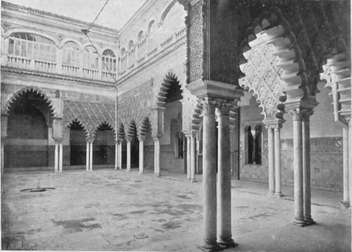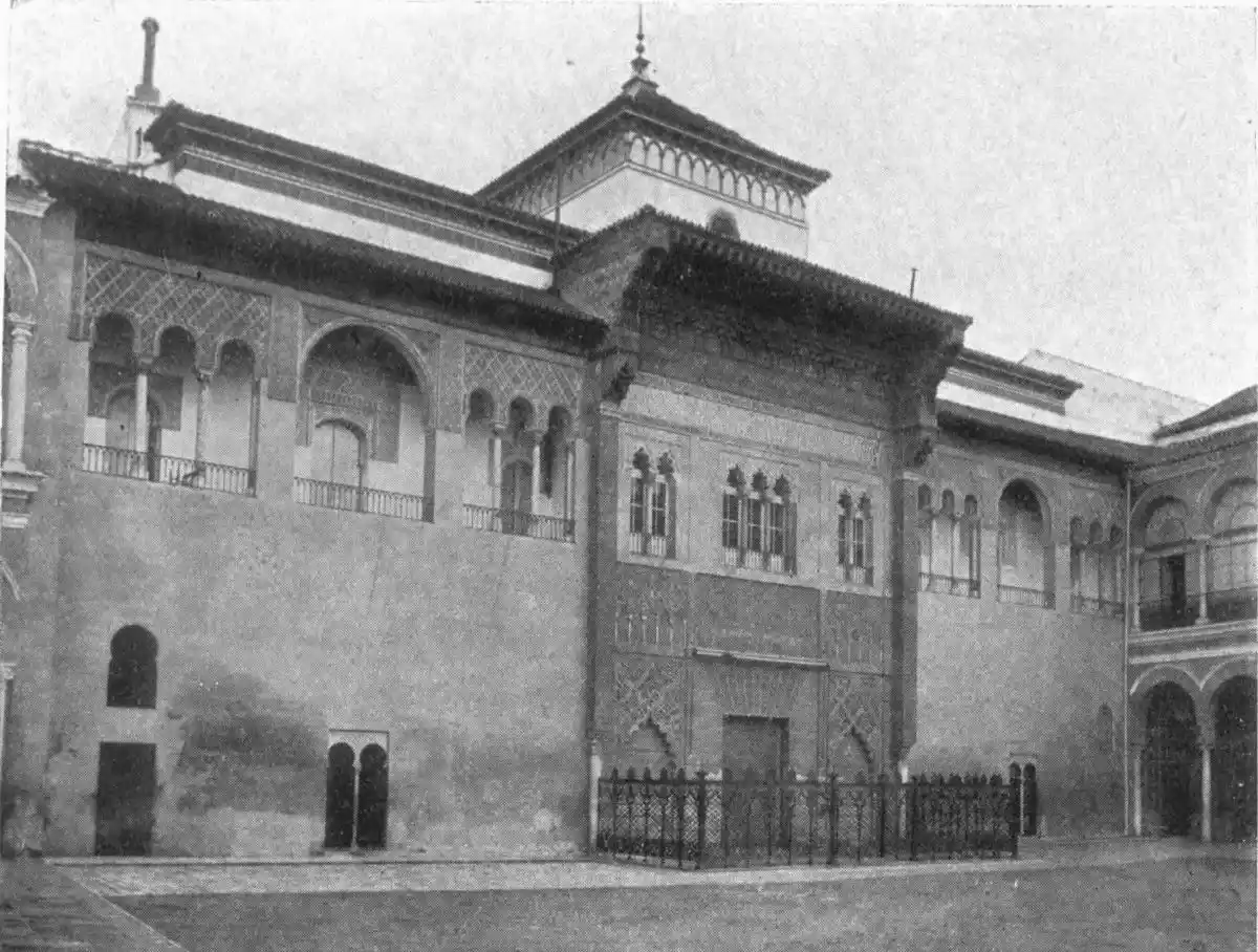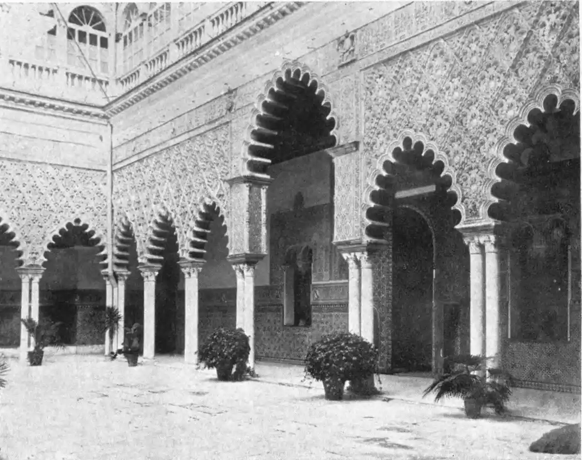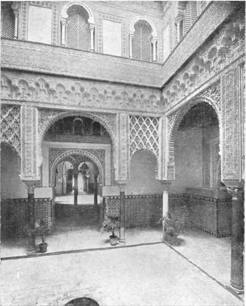 The beautiful Moorish palace of the Alcazar at Seville, unlike the more famous Alhambra of Granada, is still a royal palace, though only occasionally the residence of their Catholic Majesties. The upper floor, containing the royal apartments, is always kept ready for these illustrious tenants, and in consequence is rarely accessible by the tourist and sight-seer. The palace proper is one of a group of buildings known as the Alcazares, which is surrounded by an embattled wall, and includes several open spaces and numerous private dwellings. Immediately inside the wall are two squares called the Patio de las Banderas and Patio de la Monteria. At the far end of the former is the office of the governor of the palace, and to the right of this is an entrance whence a colonnaded passage called the Apeadero leads straight{75} through to the gardens, or, by turning to the right, to the Patio del Leon. On one side this latter square communicates with the Patio de la Monteria; on the other side is the palace of the Alcazar itself. I hope this will make the rather puzzling topography of the place a little more intelligible.