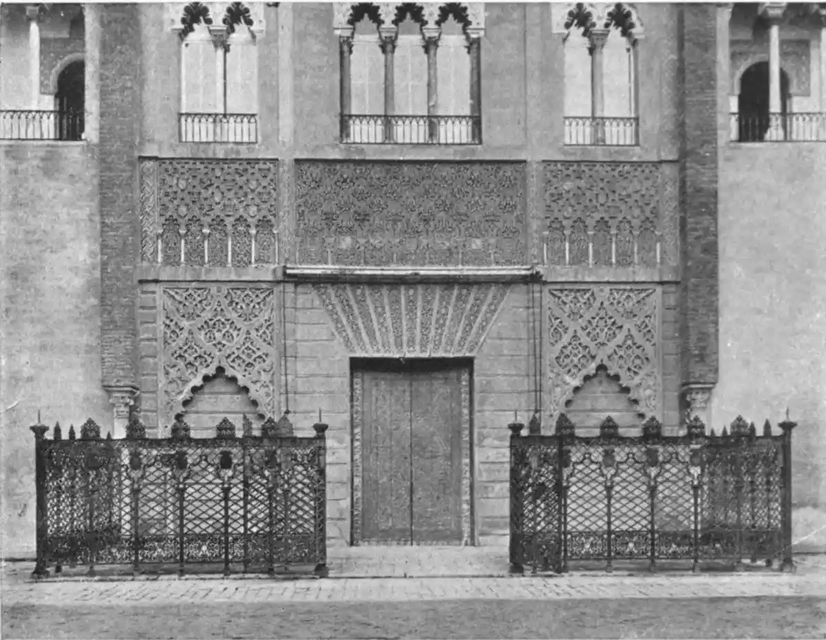 Passing through the colonnaded Apeadero, built by Philip III. in 1607, and once used as an armoury, we reach the Patio del Leon, where tournaments used to be held, and stand in front of the Palace of the Alcazar. The façade is gorgeous yet elegant, of a gaudiness that in this brilliant city of golden sunshine and white walls is not obtrusive. Yet, despite the Moorish character of the decoration, the Arabic capitals and pilasters, and the square entrance ‘in the Persian style,’ the front is not that of an eastern palace; and it is without surprise that we read over the portal, in quaint Gothic characters, the legend: ‘The most high, the most noble, the most powerful, and the most victorious Don Pedro, commanded these Palaces, these Alcazares, and these entrances to be made in the year (of Cæsar) 1402’ (1364). Elsewhere on the façade are the oft-repeated Cufic inscriptions: ‘There is no con{81}queror but Allah,’ ‘Glory to our lord the Sultan’ (Don Pedro), ‘Eternal glory to Allah,’ etc., etc.