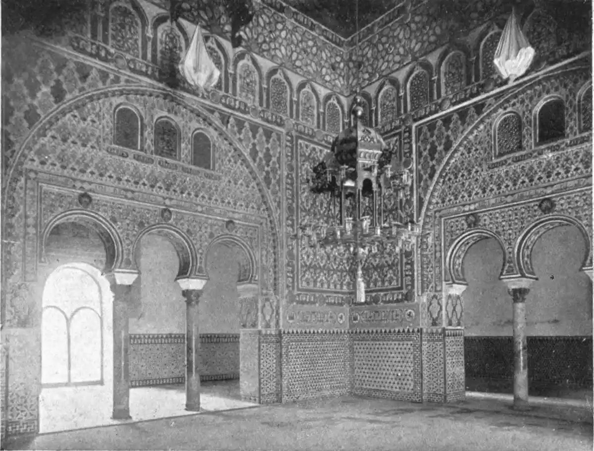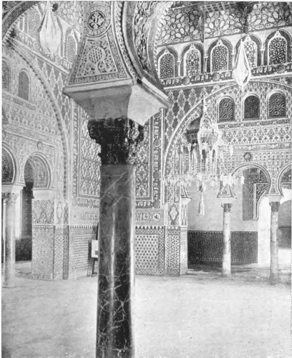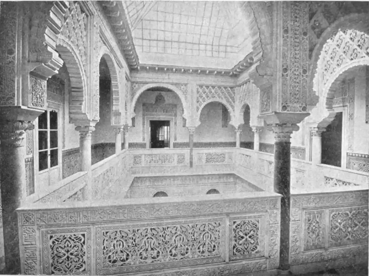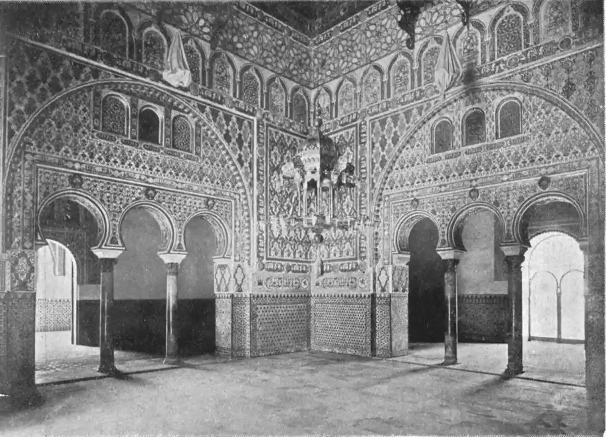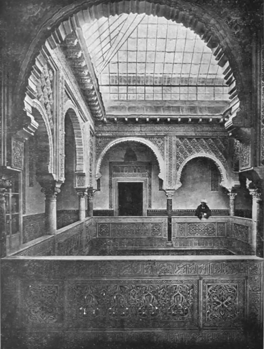 Crossing the Plaza del Triunfo, which lies{79} between the Cathedral and the old Moorish walls, we enter the Patio de las Banderas, so called either because a flag was hoisted here when the royal family was in residence, or on account of the trophy, composed of the arms of Spain with crossed flags, displayed over one of the arches. Pedro was accustomed to administer justice, tempered with ferocity, after the Oriental fashion, seated on a stone bench in a corner of this square. The surrounding private houses occupy the site of the old Palace of the Almohades, and one of the halls—the Sala de Justicia—is still visible. It is entered from the Patio de la Monteria. Contreras assigns an earlier date to this room even than the advent of Almohades. It is square, and measures nine metres across. The stucco ceiling is adorned with stars and wreaths, and bordered by a painted frieze. The decorations consist chiefly of inscriptions in Cufic characters. The right-angled apertures in the walls were closed either by screens of translucent stucco or by tapestries, ‘which must,’ says Gestoso y Perez, ‘have made the hall appear a miracle of wealth and splendour.’ It was in this hall, often overlooked by visitors, that Don Pedro overheard four judges discussing the division of a bribe they had received. The question was{80} abruptly solved by the division of the disputants’ heads and bodies. Thanks to its isolation, the Sala de Justicia escaped the dreadful ‘restoration’ effected in the middle of the nineteenth century by the Duc de Montpensier. The house No. 3, Patio de las Banderas, formed part, in the opinion of Gestoso y Perez, of the Palacio del Yeso, or Stucco Palace, of Don Pedro.