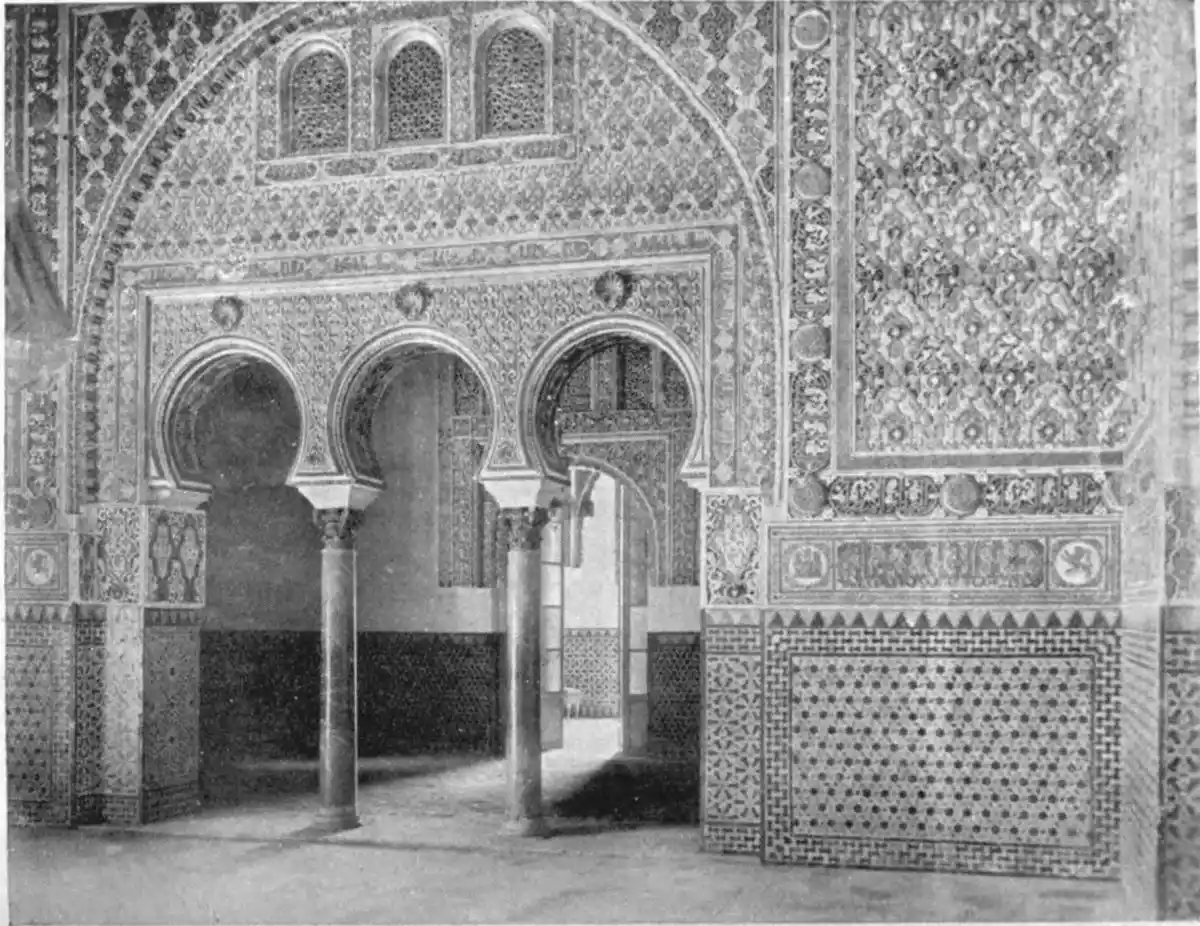 East of the Patio de las Muñecas, and occupying the north side of the Patio de las Doncellas, is the long room called the Dormitorio de los Reyes Moros. All the apartments in the Alcazar are fancifully named, but the designation of none is quite so stupid and misleading as this. The columns of the twin windows on either side of the door appear to date from the time of the Khalifate. The doors themselves are richly inlaid and painted with geometrical patterns. The three horseshoe arches leading to the al hami, or alcove, also seem to belong to the early period of Spanish-Arabic art. The room is so richly decorated that scarce a handbreadth of the surface is free from ornament.{88}