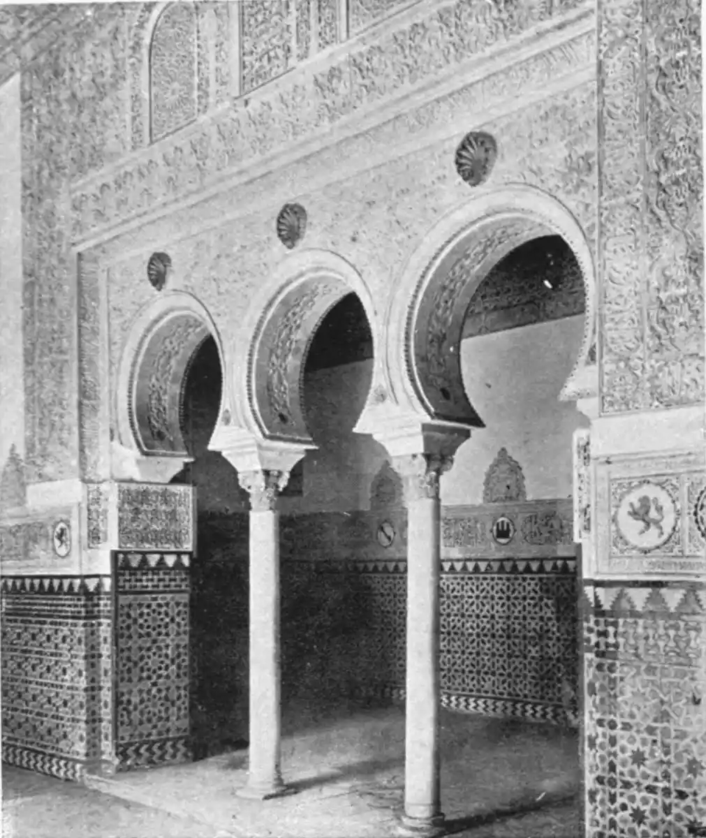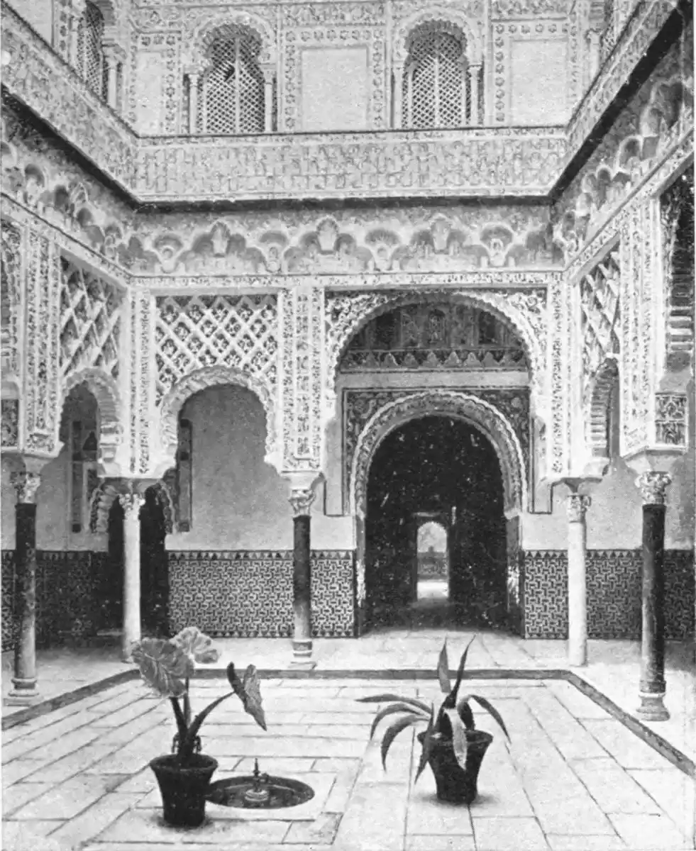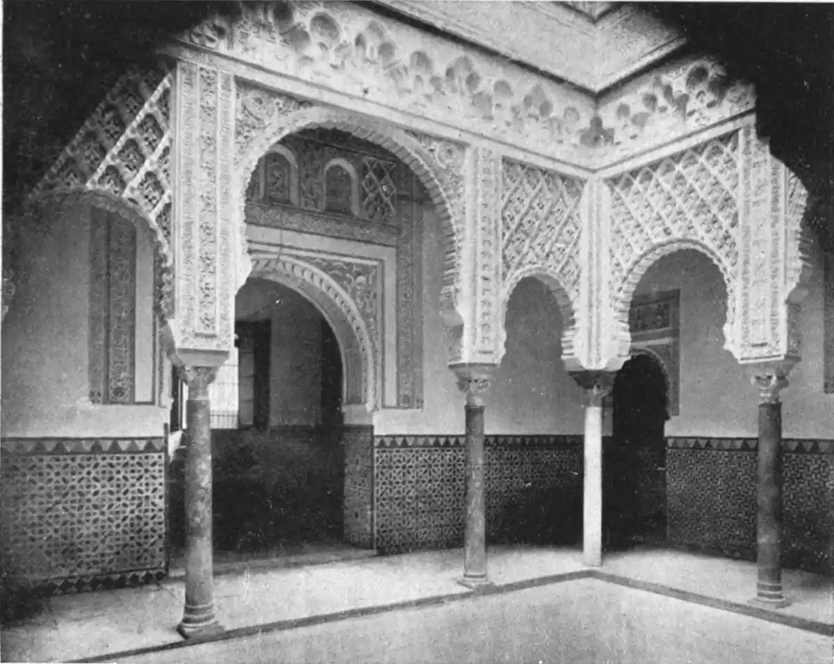The Patio de las Doncellas is an oblong, and surrounded by an arcade of pointed and dentated arches which spring from the capitals of white marble columns placed in pairs. The middle arch on each side is higher than the others, and springs from oblong imposts resting on the twin columns and flanked by the miniature pillars characteristic of the Grenadine architecture. The spandrels are beautifully adorned with stucco work of the trellis pattern. On the frieze above runs a flowing scroll with Arabic inscriptions, among them being ‘Glory to our lord, the Sultan Don Pedro,’ and this very remarkable text: ‘There is but one God; He is eternal; He was not begotten and has never begotten, and He has no equal.’ This inscription, opposed to the tenets of Christianity, was evidently designed by a Moslem artificer, who relied (and safely relied) on the ignorance of his employers. The frieze is decorated also, at intervals, by the escutcheons of Don Pedro and of Ferdinand and Isabella, and by the well-known devices of Charles V., the Pillars of Hercules with the motto ‘Plus Oultre.’ The inside of the arcade is ornamented with a high dado of glazed tile mosaic (azulejo), brilliantly coloured, and with the highly prized metallic{83} glint. The combinations and variations of the designs are very ingenious and interesting. This decoration probably dates from Don Pedro’s time. Behind each central arch is a round-arched doorway, flanked by twin windows. These are framed in rich conventional ornamental work. Through little oblong windows above the doors light falls and illumines the ceilings of the apartments opening into the court. The ceiling of the arcade dates from the reign of Ferdinand and Isabella, but was restored in 1856. A deep cornice marks the division of the lower part of the court from the upper story, the front of which, with its white marble arches, columns and balustrades, was the work of Don Luis de Vega, a sixteenth-century architect.