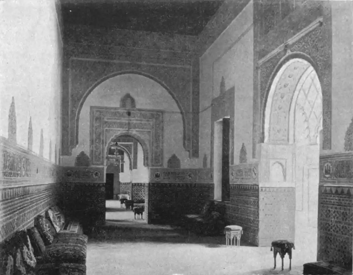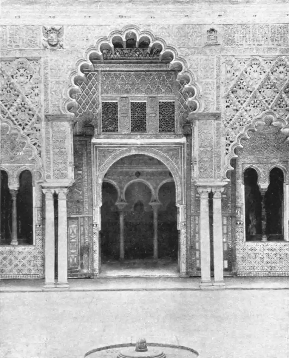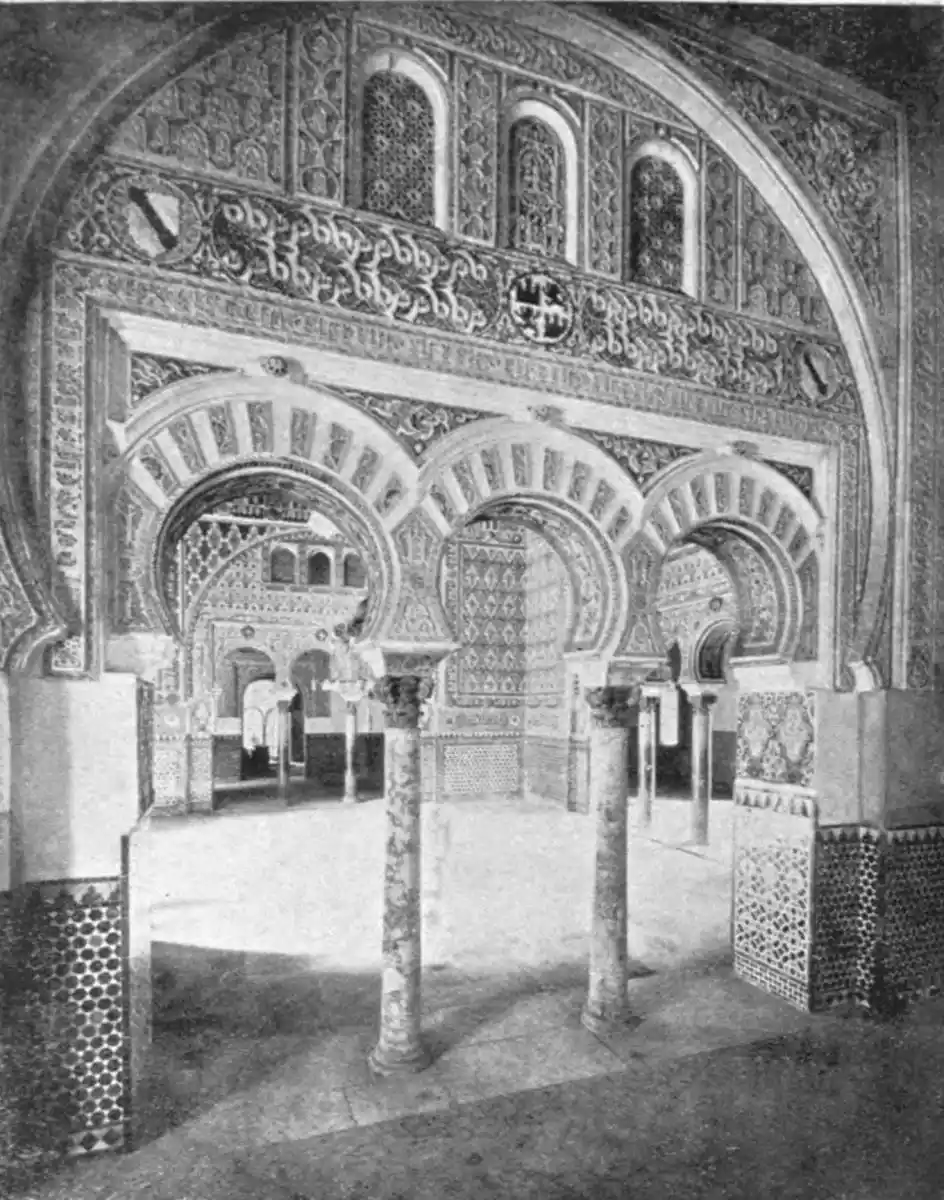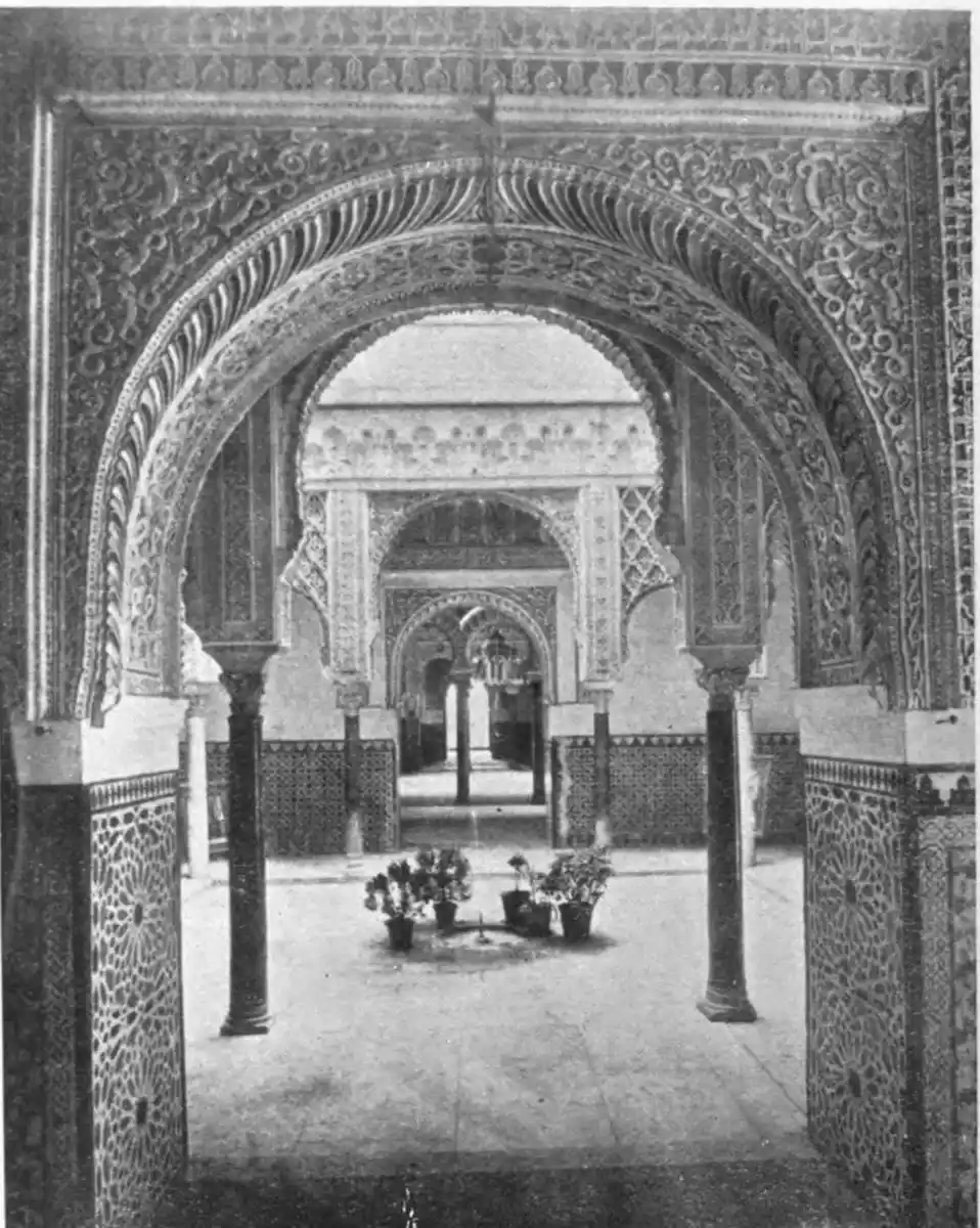 The Patio de las Doncellas is an oblong, and surrounded by an arcade of pointed and dentated arches which spring from the capitals of white marble columns placed in pairs. The middle arch on each side is higher than the others, and springs from oblong imposts resting on the twin columns and flanked by the miniature pillars characteristic of the Grenadine architecture. The spandrels are beautifully adorned with stucco work of the trellis pattern. On the frieze above runs a flowing scroll with Arabic inscriptions, among them being ‘Glory to our lord, the Sultan Don Pedro,’ and this very remarkable text: ‘There is but one God; He is eternal; He was not begotten and has never begotten, and He has no equal.’ This inscription, opposed to the tenets of Christianity, was evidently designed by a Moslem artificer, who relied (and safely relied) on the ignorance of his employers. The frieze is decorated also, at intervals, by the escutcheons of Don Pedro and of Ferdinand and Isabella, and by the well-known devices of Charles V., the Pillars of Hercules with the motto ‘Plus Oultre.’ The inside of the arcade is ornamented with a high dado of glazed tile mosaic (azulejo), brilliantly coloured, and with the highly prized metallic{83} glint. The combinations and variations of the designs are very ingenious and interesting. This decoration probably dates from Don Pedro’s time. Behind each central arch is a round-arched doorway, flanked by twin windows. These are framed in rich conventional ornamental work. Through little oblong windows above the doors light falls and illumines the ceilings of the apartments opening into the court. The ceiling of the arcade dates from the reign of Ferdinand and Isabella, but was restored in 1856. A deep cornice marks the division of the lower part of the court from the upper story, the front of which, with its white marble arches, columns and balustrades, was the work of Don Luis de Vega, a sixteenth-century architect.