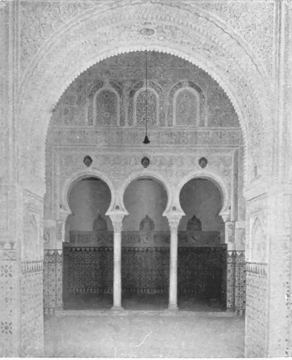 Through the arch facing the entrance from the{85} patio we pass into a long narrow apartment, known as the Comedor, where the late Comtesse de Paris was born in 1848. To the north of the salon is a small square chamber, called the ‘Cuarto del Techo de Felipe Segundo,’ with a coffered ceiling dating from the time of that king. North of this room is the exquisite little Patio de las Muñecas (Court of the Dolls) purely Grenadine in treatment. The rounded arches are separated by cylindrical pillars—I call them so for want of a better word—which rest on slender columns of different colours, reminding one of the early or Cordovan style. The capitals are rich, the pillars they uphold decorated with vertical lines of Cufic inscriptions, many of which, says Contreras, are placed upside down. The walls and spandrels are tastefully adorned with stucco work of the trellis pattern, tiling and mosaic. This court, though still harmonious and beautiful, suffered rather than benefited by its restoration in 1843; but the architecture has been not unsuccessfully reproduced in the upper story.