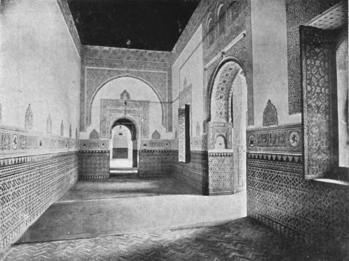 The Alcazar, I think, disappoints most foreigners. The architectural and decorative work of the Spanish Moors and their descendants pleases people quite inexperienced in the arts by its mere prettiness, its brilliance, its originality, and its colour; and it delights still more those who are able to appreciate its marvellous combinations of geometrical forms, its exquisite epigraphy, and all its subtle details. But the average traveller stands between these two classes of observers. He looks for grandeur where he should expect only beauty, and his eye is wearied by the wealth of conventional ornamentation. What I think is conspicuously lacking in the Alcazar, and to a much less extent in the Alhambra, is atmosphere. Memories do not haunt you in these gilded halls. There is nothing about them to suggest that anything ever happened here. The legends tell us the contrary; but assuredly no one was ever less successful in impressing his personality on his abode than were the founders and inhabitants of the Alcazar.{91}
