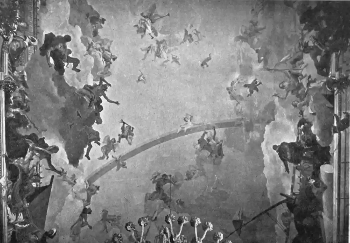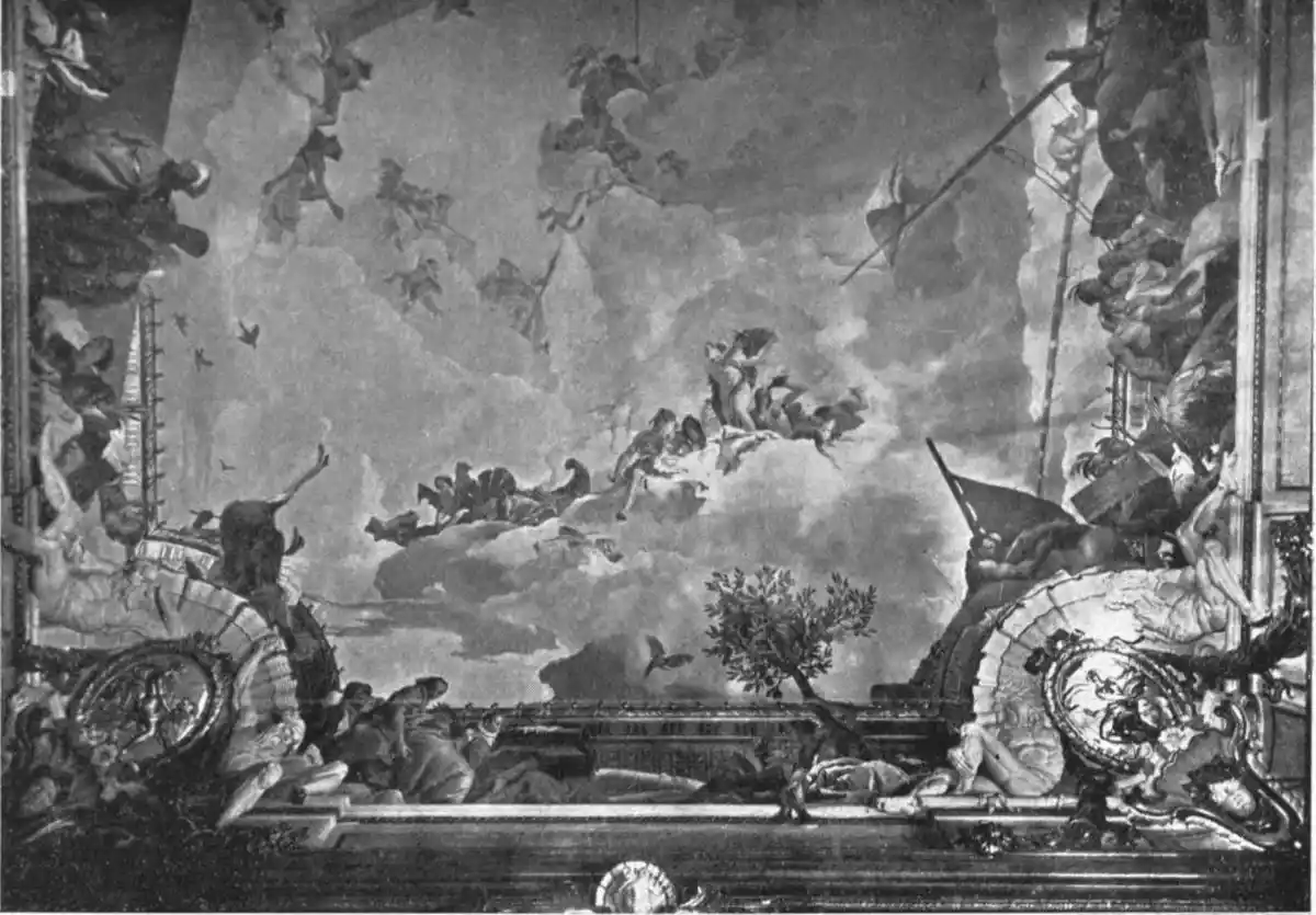 The ground area of the palace is divided into thirty salons, magnificently furnished and adorned with a profusion of precious marbles and fresco{98} paintings by Ribera, Gonzalez, Velazquez, Maella, Mengs, Bayeu, and Lopez. It would be going outside the province of this sketch to describe each apartment in detail, but special reference must be made to the Hall of Ambassadors. This magnificent apartment, the largest and richest in the Palace, occupies the centre of the principal façade, in which it has five balconies. The whole apartment glows with rich colouring, and scintillates with a lavish display of precious metals. The rock-crystal chandeliers, colossal looking-glasses cast at San Ildefonso, the marble tables, the crimson, and the gilding compose a spectacle of royal magnificence. Here is the splendid throne of silver, made for the husband of Mary of England, and mounting guard on either side are the huge lions of the same metal. The ceiling, painted by Juan Bautista Tiépolo, represents the Spanish Monarchy, exalted by poetic beings, accompanied by the Virtues, and surrounded by its dominions in both hemispheres. On a throne, at the sides of which are Apollo and Minerva, the Monarchy is majestically seated, supported by the allegorical figures representing the science of Government, Peace and Justice and Virtue. Another group, on clouds, is formed by Abundance, Mercy, and other figures. A{99} rainbow crosses the whole ceiling, and between this and the great circle of clouds circled by angels covering is the Monarchy. In the same salon is an allegory in praise of Charles III., which is formed by Magnanimity and Glory, Affability and Counsel. Faith, enthroned on clouds, has an altar of fire, and is accompanied by Hope, Charity, Prudence, Strength, and Victory; and an angel carries a chain with a medal to reward the Noble Arts. Between the cornice Tiépolo displayed his masterly hand by delineating the provinces of the Spanish Monarchy. Roberto Michel executed in the angles four gilded medallions, representing Water and Spring, Air and Summer, Fire and Autumn, and Earth and Winter. Over the doors are two ovals, one representing Abundance, and the other Merit and Virtue. All the walls of this regal hall are covered with crimson velvet bordered with gold. On the right is the statue of Prudence, on the left that of Justice, and in the two angles traced by the steps are four gilded bronze lions. Before the superb mirrors in this apartment are costly tables, and on these marble busts and other no less beautiful objects, the whole constituting the most beautiful room in the palace, and one of the first in Europe.{100}