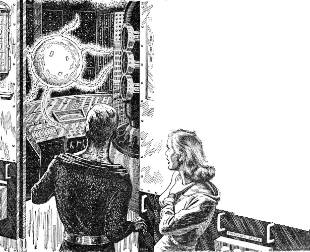 "But I don't want to make the big hop. I don't want to go—" Her voice went into silence as Captain Martin fell into step beside them. The Captain's face was utterly blank. He walked like a man in a deep daze, like a zombie, like a man in a trance. Once his eyes flicked toward the wall. Following the direction in which the captain had glanced, Craig caught the vague outline of a door covering an alcove. Craig shuddered. Now he understood one reason why Captain Martin might be walking like a man in a trance. But were there other reasons?