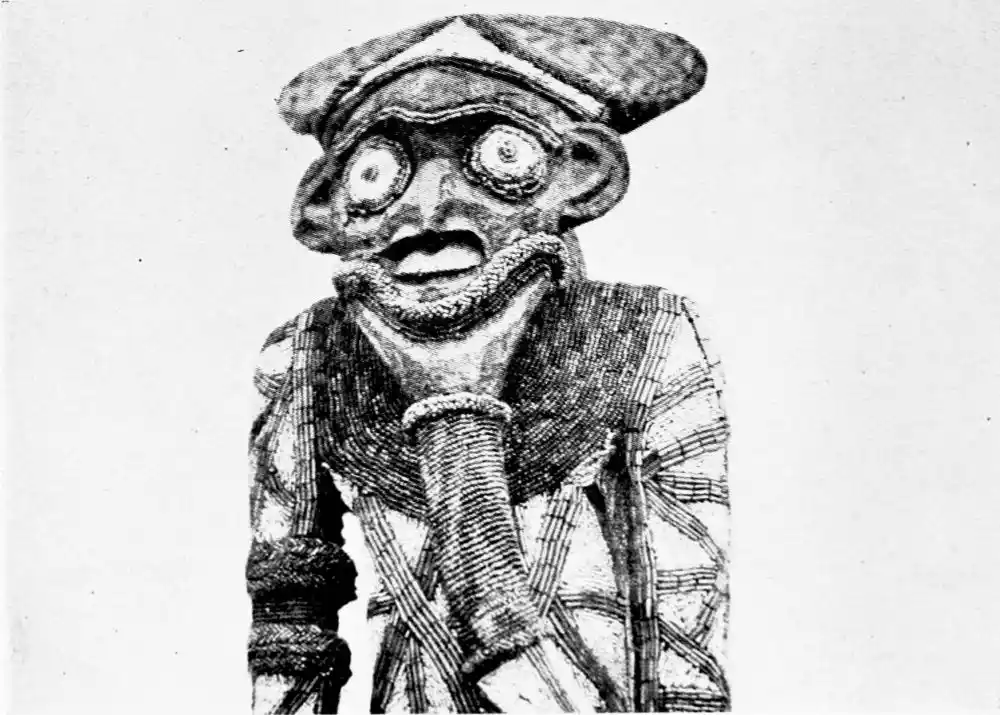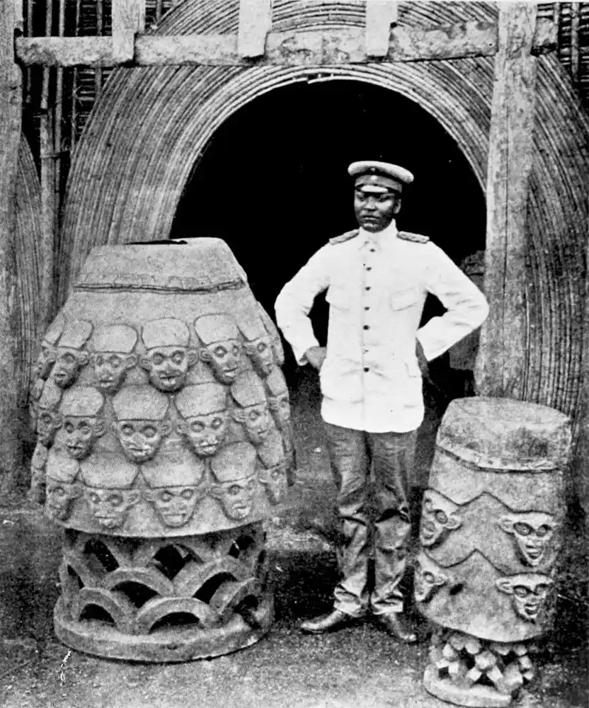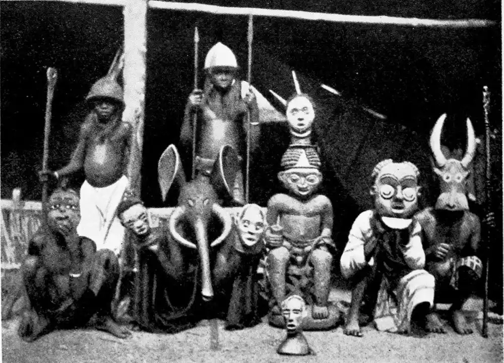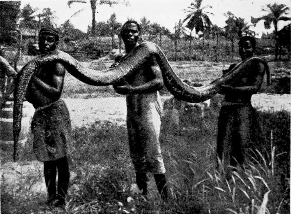 “The country between the Gamana and Katsena Rivers is inhabited by Zumperi pagans, who are cannibals and live on hill-tops. They are of small stature and of remarkably repulsive appearance. Every other man appeared to be suffering from goitre or elephantiasis—whether the legacy of cannibalism, or the effect of drinking infected water, it is difficult to say. The people are industrious, and besides corn, grow large quantities of cotton and tobacco on the hillsides. They breed dogs for eating purposes, and all the villages are full of yelping curs, covered with sores like their owners. In one village a large deposit of human skulls was seen. The villages are well built and surrounded by mud walls and ditches. Among the numerous ‘ju-jus’ found in the deserted huts was a grotesque mask, which was apparently kept to frighten the women. Any woman seeing it must die at once. When the community is short of meat, the local witch doctor puts on the mask and runs about the hills until he meets a likely looking victim, who is then killed and eaten. The Zumperis are great hunters, and have killed off nearly all the game in their country except leopards.{74}”