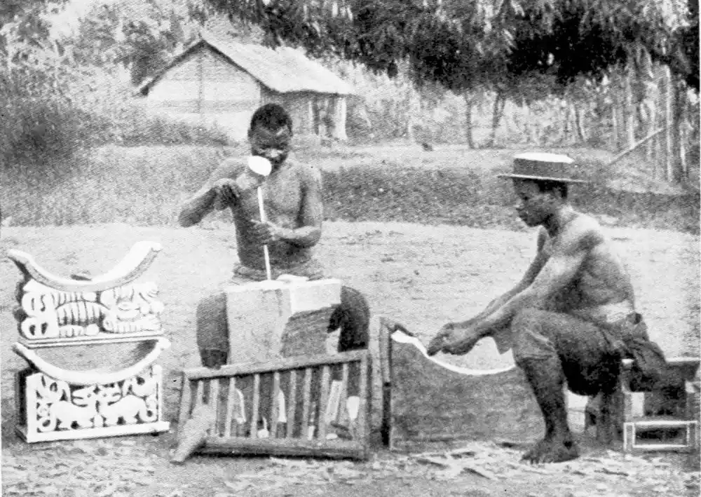 “In the olden days one of the chief occupations of slaves was that of cracking palm nuts; now this{39} work is left to boys and women. After the nuts have been dried in the sun, they are heaped up under little sheds to protect them from the rain. In places where rocks are plentiful the nuts are taken there and cracked on them by a stone held in the hand of the cracker. In other places the nuts are put on a block of wood resting on the ground between the cracker’s legs and struck with a piece of iron held in the cracker’s right hand. In this way one worker will crack from 15 lbs. to 25 lbs. of kernels per day. The kernels are then packed in different kinds of baskets and taken to markets near rivers, where they are bought by native middlemen. Competition is very keen, and so these middlemen are tempted to adulterate the kernels by adding shells to them or by soaking them in water for two or three days. Finally, they are taken in canoes down rivers or by rail to the European traders and sold by measurement at so much a bushel.... Think of it! 241,000 tons of palm kernels shipped to Hamburg in 1913, and nearly every nut containing one kernel is cracked by hand.”