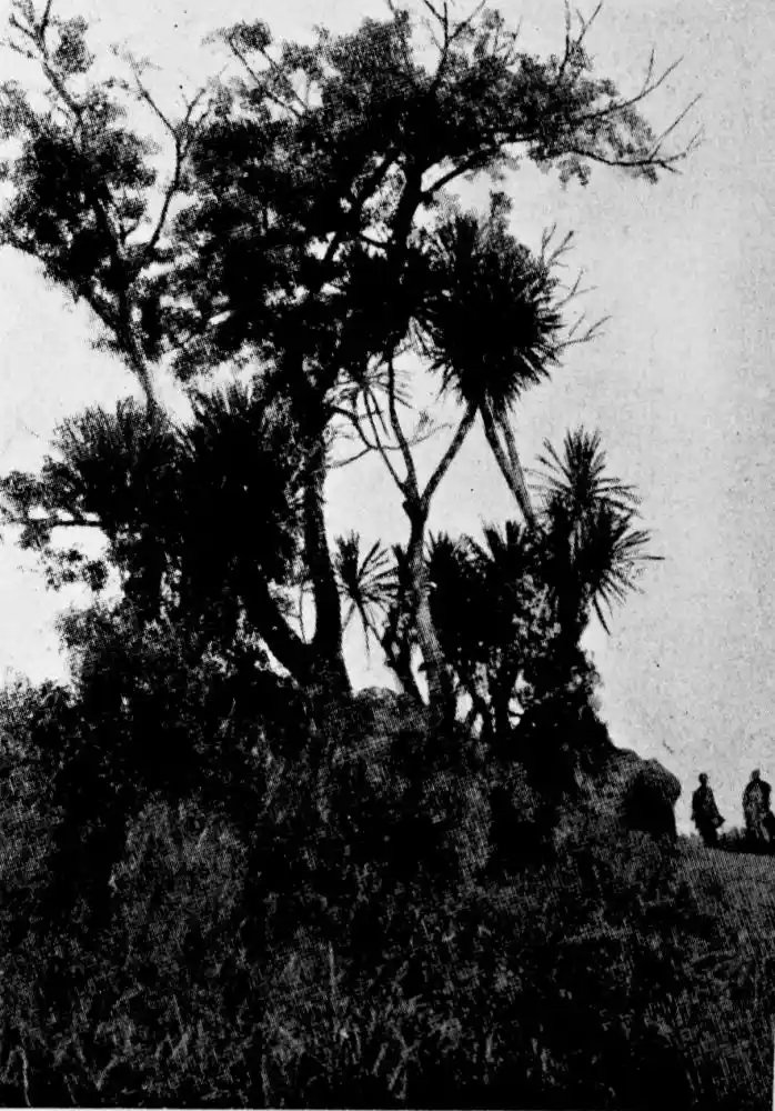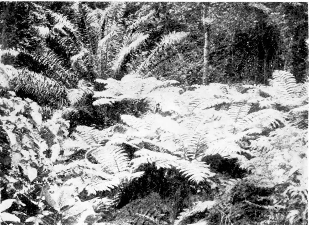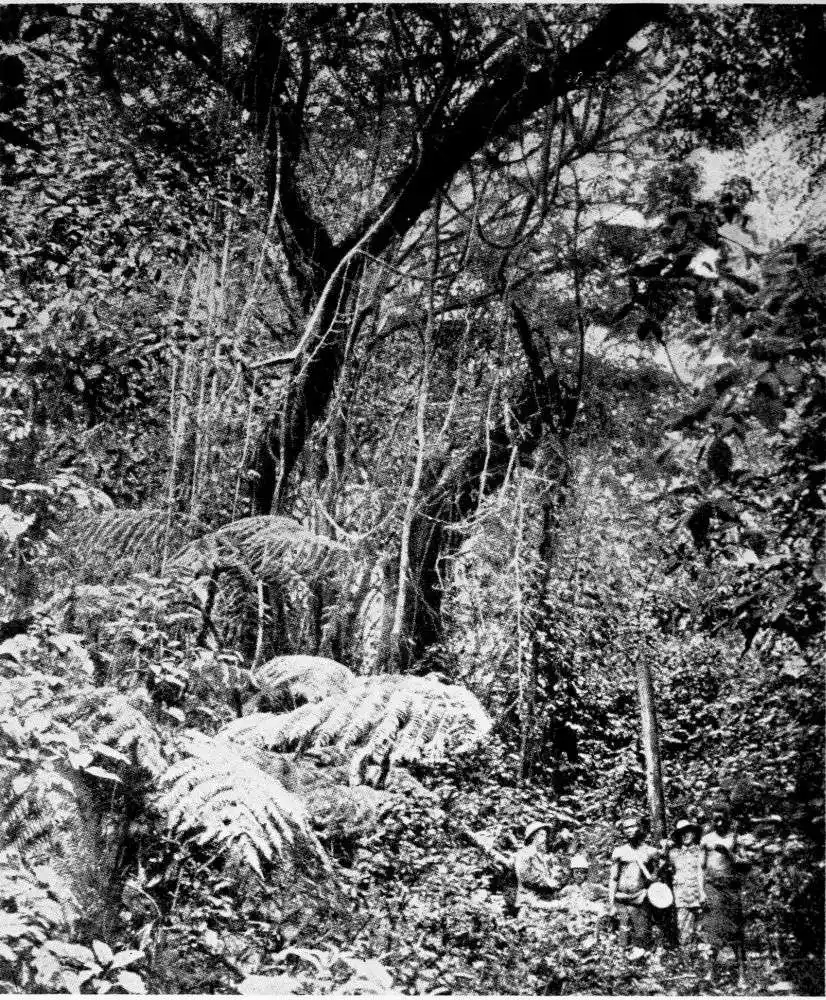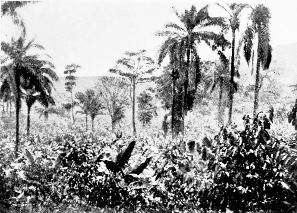 The combination of tropical heat and rain in the alternate regions of forests and brushwood swamps produces a tropical growth of cocoa palms, cotton plants, flax and fibrous trees, and rubber vines in{15} prodigal luxuriance and variety. The virgin forests are tropical to a height of about 1,000 m., when they become less dense, and the oak ferns make their appearance. Between 1,500 and 1,800 m. the wild coffee shrub grows abundantly, the oak ferns disappear, and are succeeded by glades and brushwood. At an altitude of 2,200 m. the forest suddenly comes to an end and the grass land begins. Only in the ravines, in which the soil is moist and sheltered from the winds, the forest continues to the 2,700 m. level. The high forest—the most magnificent of all tropical forest formations—is characterised by its amazing variety of entirely different trees, including, among others, the great wool tree, the mahogany tree, the yellow and red wood trees, the oil-palm, and rubber. Among the trees of the brushwood districts the principal are acacias and the oil-palm, which to a height of from 700 to 900 m. covers the slopes of the Cameroon plateau to the coast.