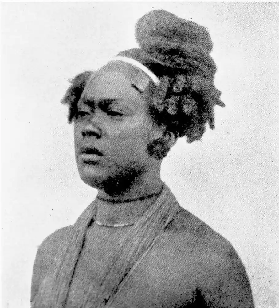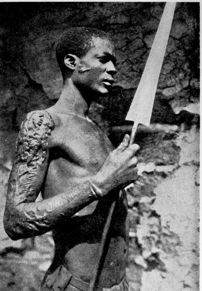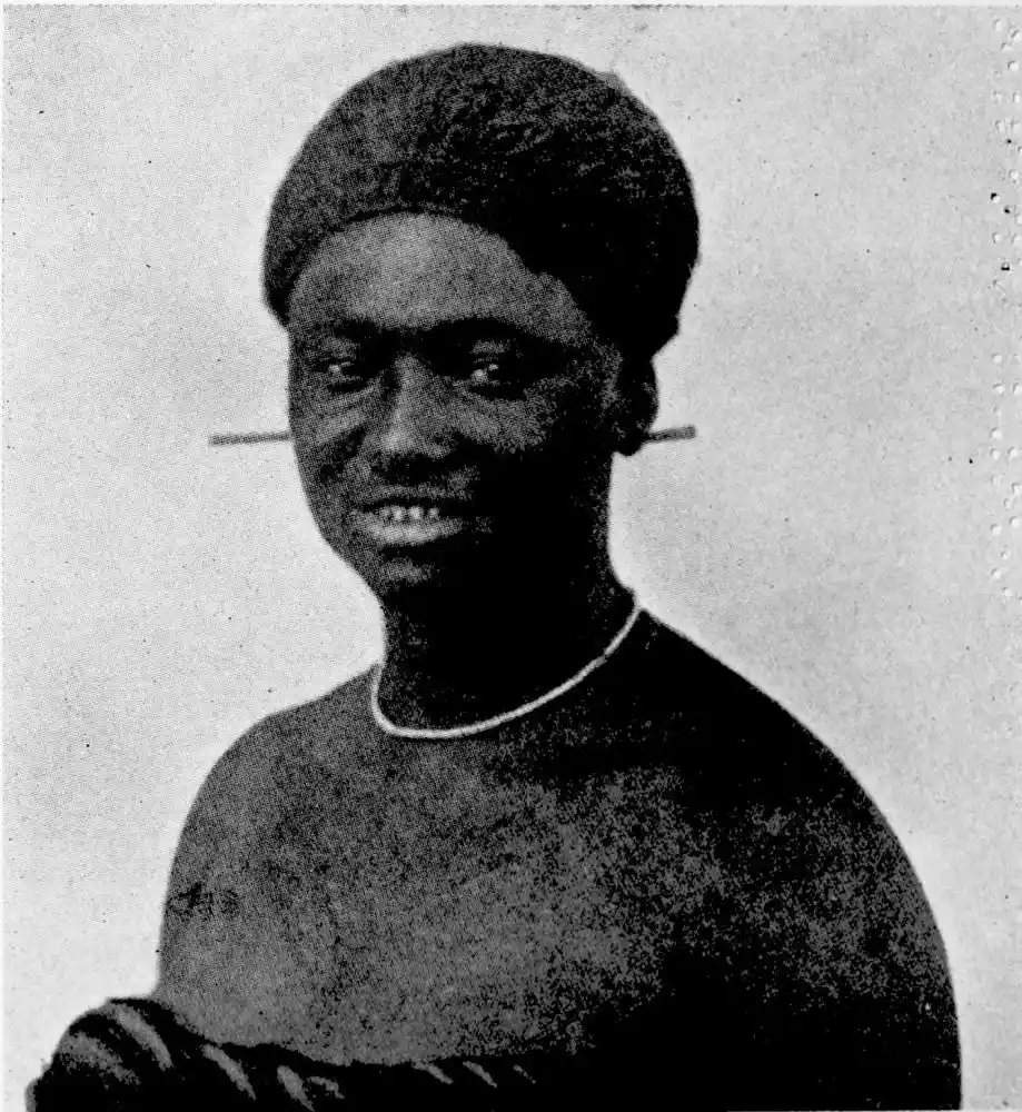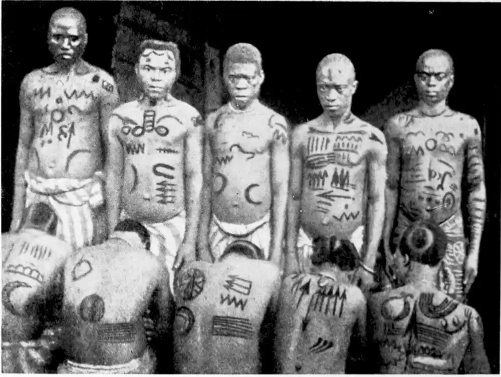 “The Munchis are of striking appearance. Those near the boundary are poor and wear few clothes. They go in for extravagant hairdressing, the most popular coiffure being a shaven head with one or two balls of hair left growing. Others wear their hair in beaded strands, falling over the side of the face. The tribal markings are a number of raised tattoo marks, in the form of a crescent, on both sides of the temple. These are universal, and are compulsory for both sexes, but the marks disappear in old age. Other markings are tattoed stars and rings on the forehead, chest and back, but these are all optional. The two front teeth of the upper jaw are filed into V-shape.