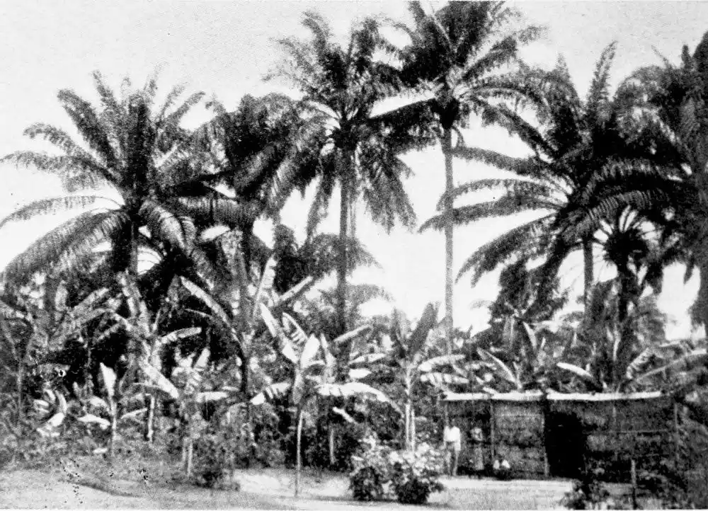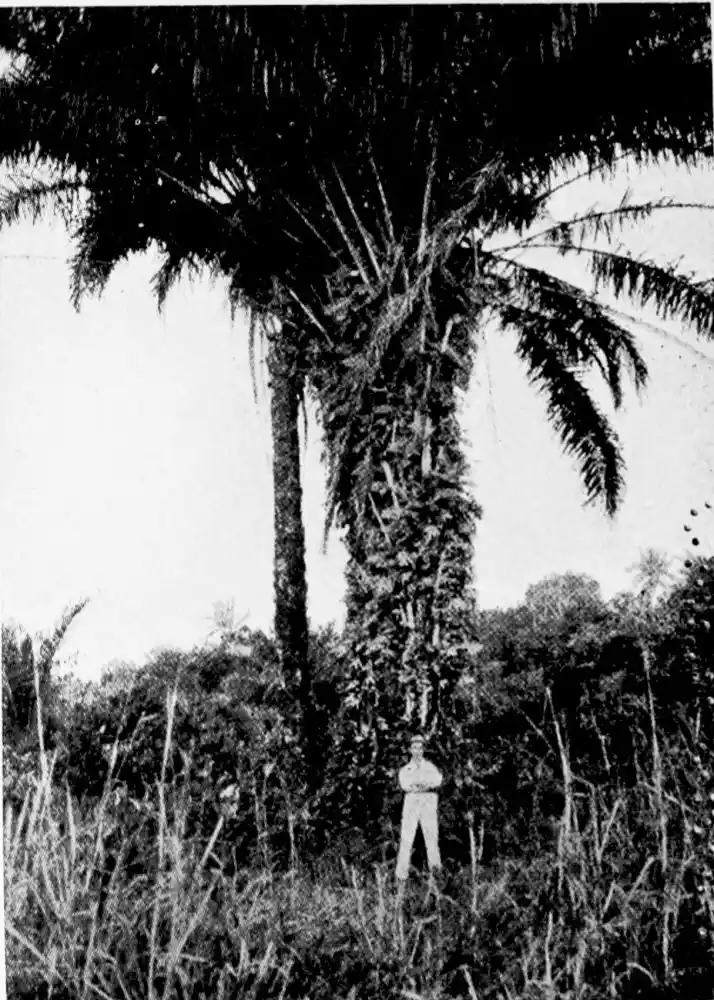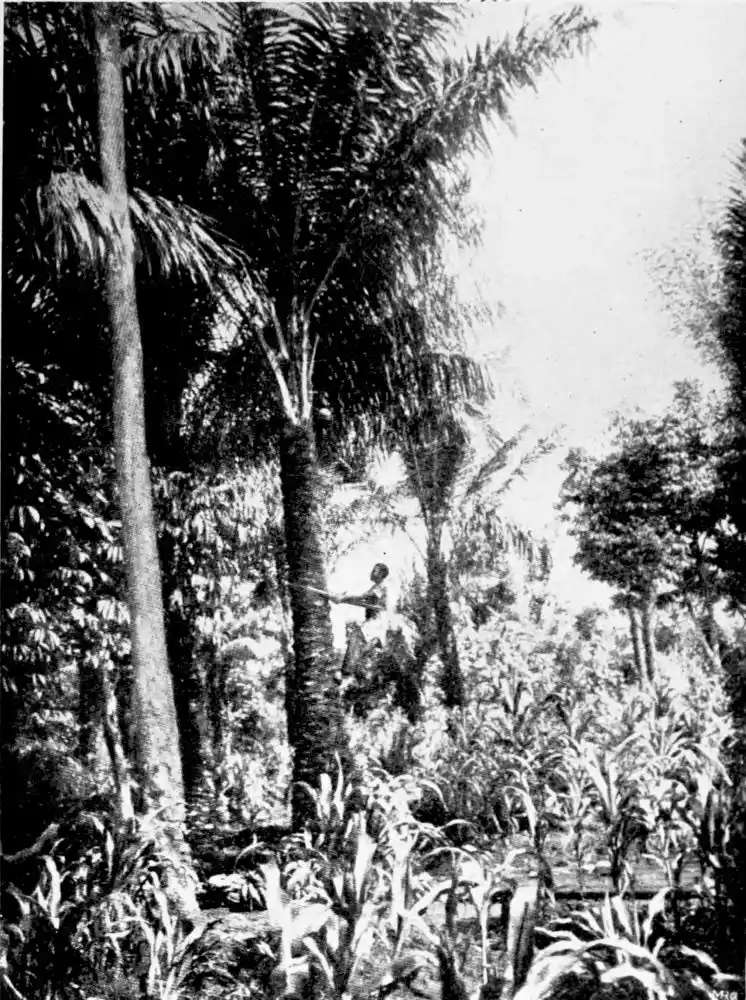 “The uses of the palm oil tree are various. It yields the palm oil and kernels of commerce. It gives the native a drink he is very fond of, called palm wine, which, when fermented, gives our cooks yeast for bread-making. The shells of the nuts are used by blacksmiths as fuel, as they give off great heat. At the present time there are three methods of making palm oil: (a) from the fresh fruit, (b) from partially fermented fruit, and (c) from well fermented fruit.