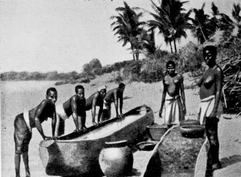 “Bunches of fruit having been severed from the parent tree, are sliced and hammered by natives, using long poles, until the fruit becomes detached from the bunch. The fresh fruit is either prepared at once into what is called soft oil, or allowed to ferment, or partially ferment, and made into hard oil. The procedure followed in making either of these{38} kinds of oil is much the same. The fruit is placed either into canoes or clay troughs, water is poured over them, and then, by treading or beating, the fibrous matter containing the oil is separated from the nuts. The nuts are then taken out and placed in the sun to dry, while the fibrous matter, by further beating or treading, is made to yield the oil which floats to the surface of the water. This oil is ladled out into pots and boiled, and then allowed to rest, so that all dirt or sediment falls to the bottom of the pot. This clean oil, soft or hard, is the palm oil of commerce. This oil is taken in calabashes or tins to the traders’ factory, which, generally speaking, is near to a river or a railway, and there put into casks and sent to the nearest port for shipment to Europe.