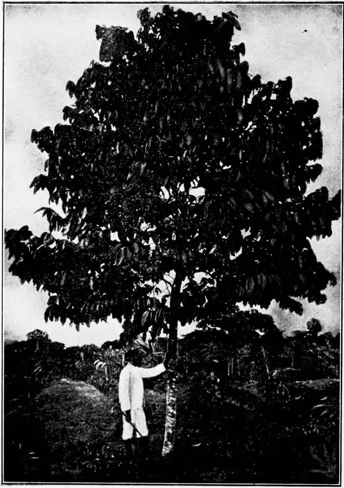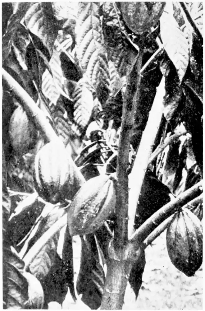 The cultivation of cocoa prospers on the slopes{25} of the Cameroon Mountain, where the climate and soil resemble those of the adjacent Islands of St. Thomas and Fernando-Po, and its cultivation is almost confined to the Cameroon Mountain and to some plantations in Sanaga and Kampo. It is to be hoped that with the further opening up of the country, many districts will be found suitable for its cultivation. In this case the many years’ experience on the Cameroon Mountain will facilitate the spreading. The cocoa-tree is, on an average, six to eight m. high, with a trunk diameter of about fifteen to twenty-five cm., and it begins to produce after four or five years. At harvest time the fruit must be carefully gathered, to avoid injuring the tree. The opening of the fruit to obtain the seeds is done with a cane, or by beating open the fruit on a stone. When the seeds are taken from the fruit, they undergo the important process of fermentation. It would take too long to relate the different methods employed, but it may be mentioned that the fermentation process affects the taste and aroma of the cocoa very much, drawing away the bitterness of the bean, modifying its sharp taste, and developing the aroma and the red-brown colour.
