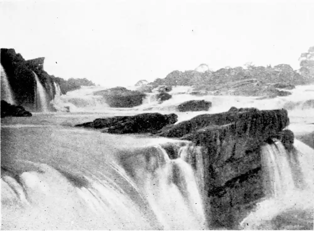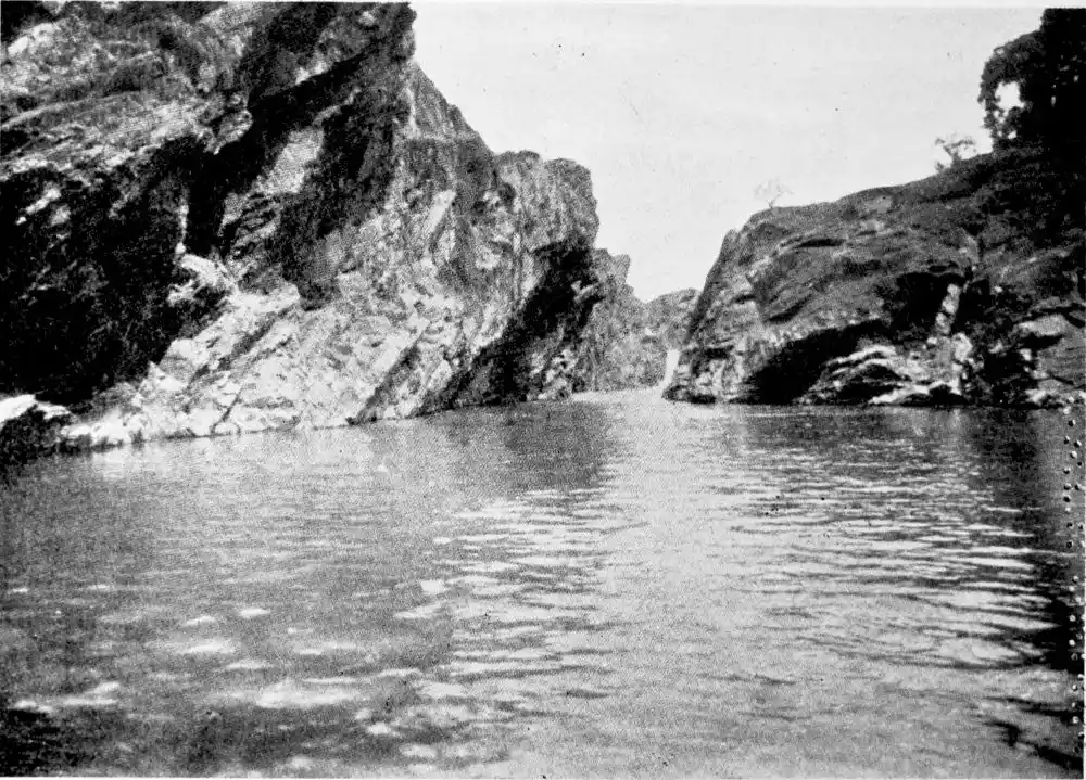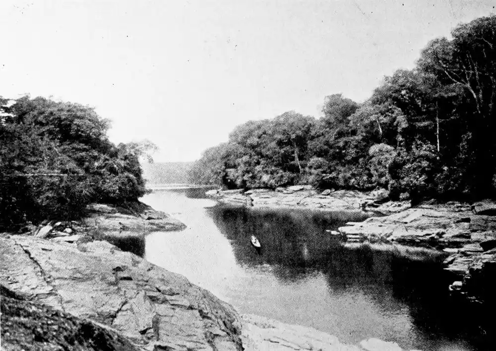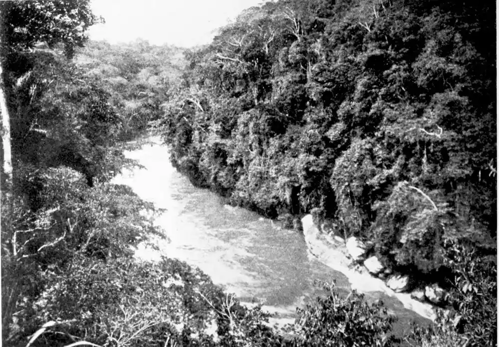 “Fifteen miles above Karbabi the river bends sharply at right angles, forming noisy rapids. Above the rapids the bed is rocky with deep pools. Under the tall trees along the banks are open glades like an English beech wood, entirely free from undergrowth, the ground being carpeted with soft moss. There are the feeding-grounds of huge herds of hippopotami, who live in the pools in the daytime. The river is here 200 to 300 yards wide, with high banks; the channel winds among huge boulders, forming a chain of pools, but leaving a narrow deep waterway among the larger rocks. The pools are like dark mirrors, silent and stagnant, yet bright and clear, reflecting the trees on the opposite bank in full detail. Wild geese and ibis fly overhead, whilst large alligators move about like torpedoes, with their noses out of the water, leaving long trails of bubbles on the surface.