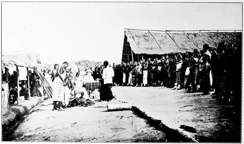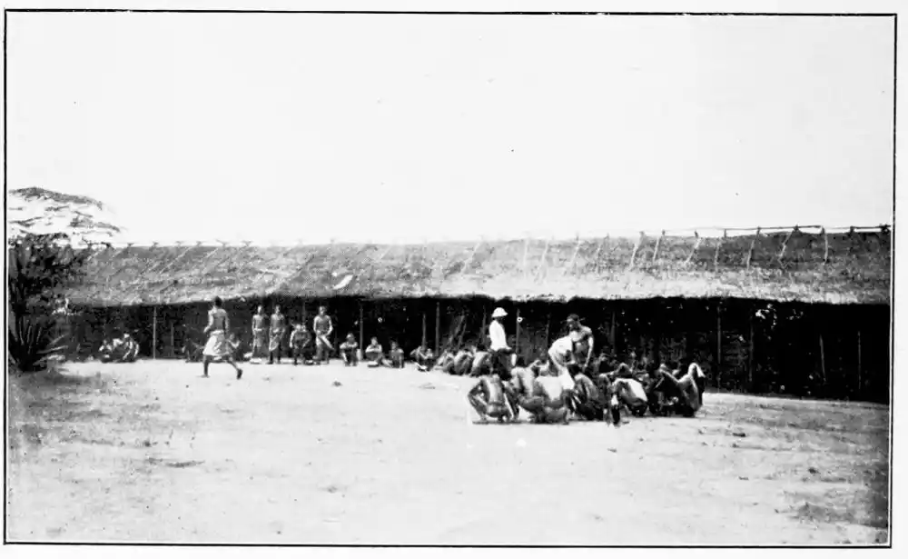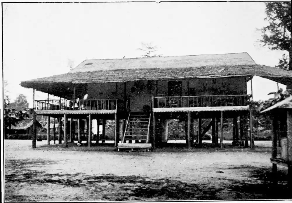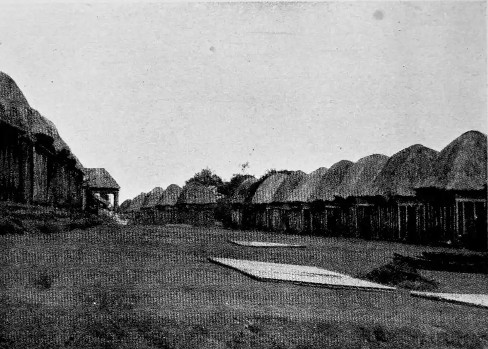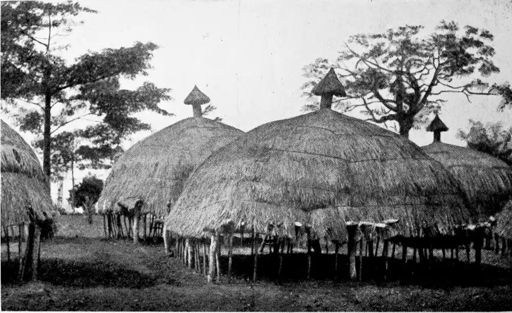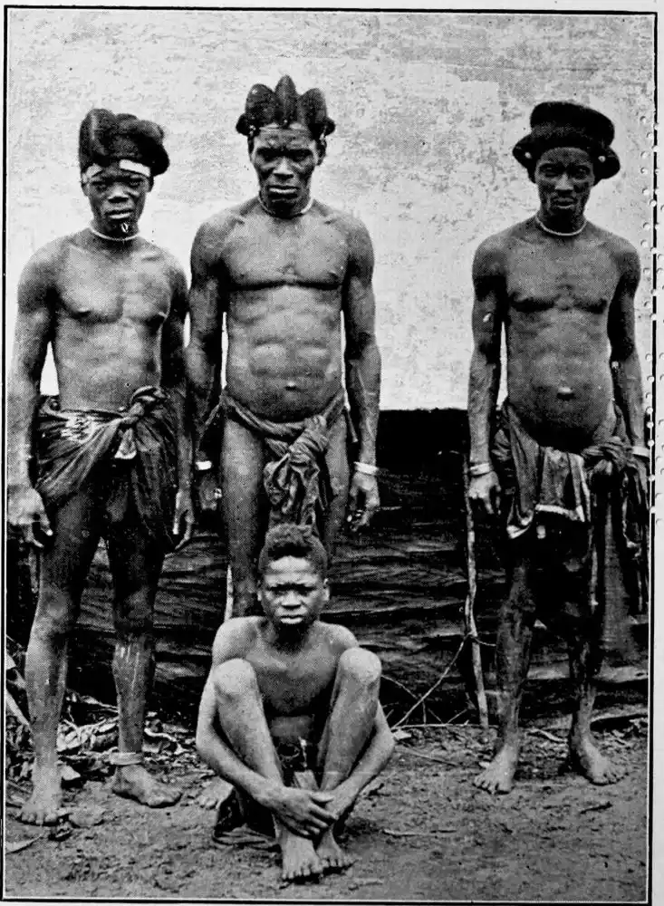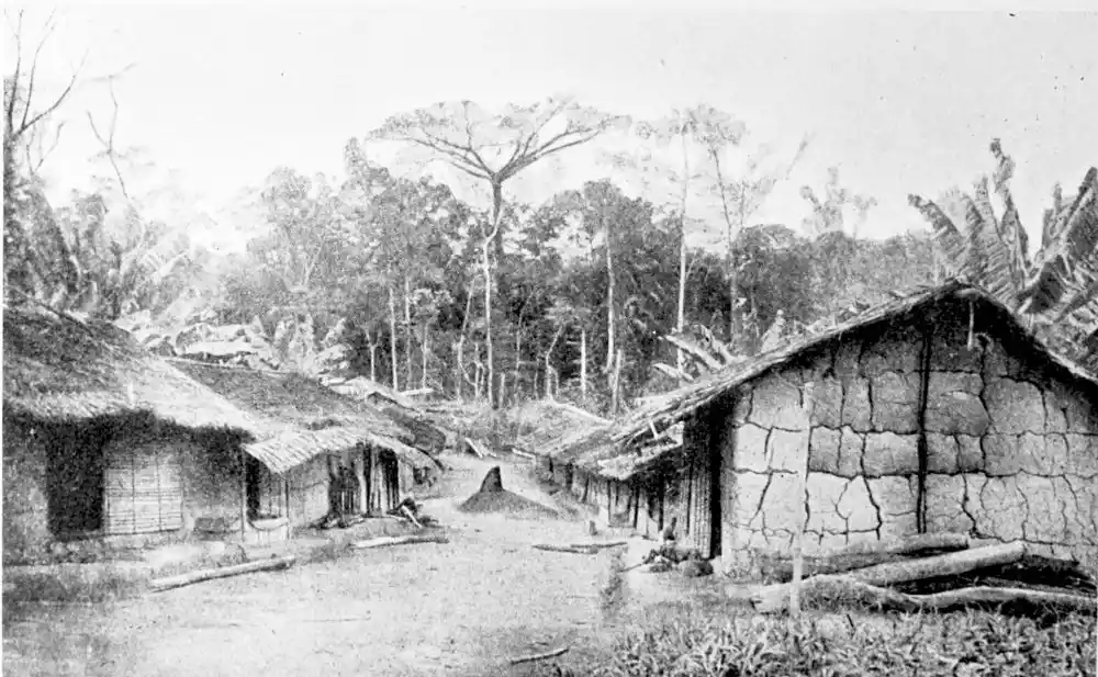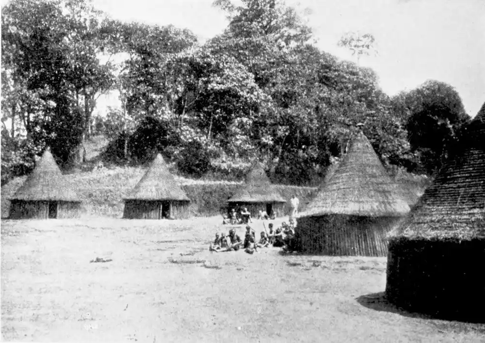 Descending from the main plateau, which is covered with thick short grass and appears to be an ideal district for cattle raising, the Commission came to the first villages of the Anyangs, who are almost invariably at war with the grass land people. “Their villages are hidden away in the forest, and consist of long, low, rectangular mud houses with roofs of palm-leaves, on either side of a squalid street. The people are very poor, and live almost entirely on plantains, their farms being in small clearings, widely separated. Pigs are kept in large numbers in the villages. Further south, the people met with are Bokis, who extend to the Cross River.... The village boundaries, although in dense forest, are well known to the{79} natives, who are extremely jealous of their rubber-collecting rights.”