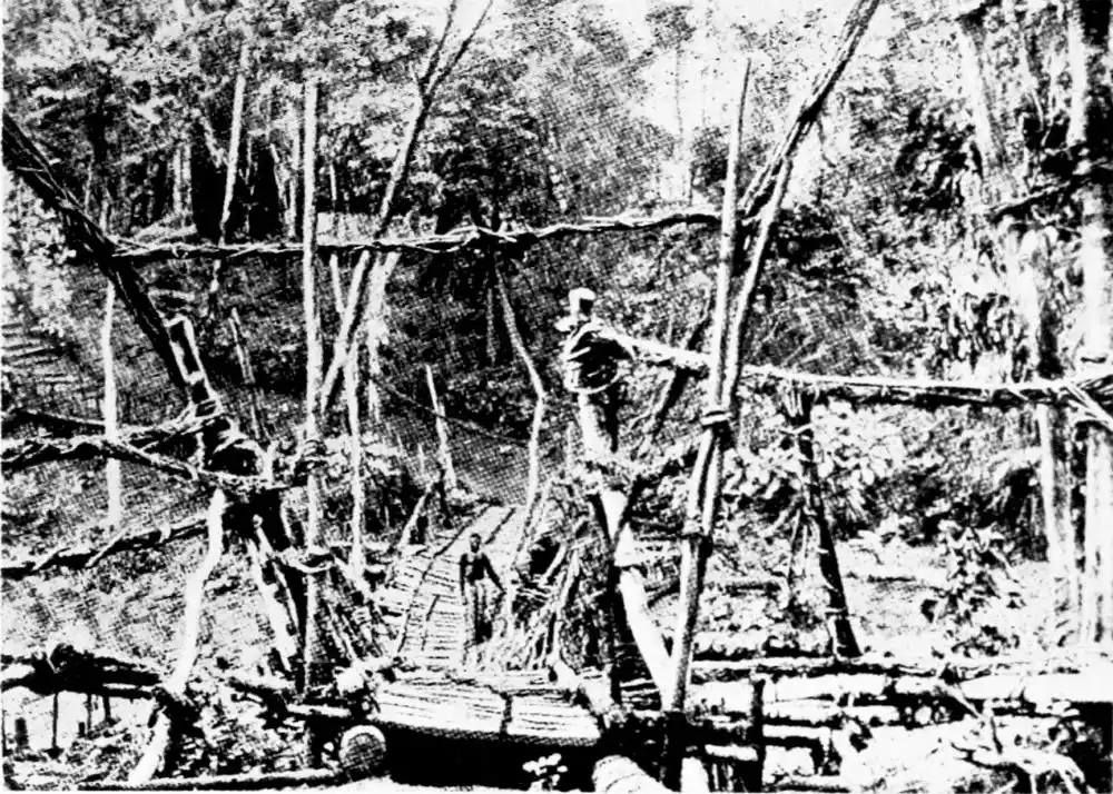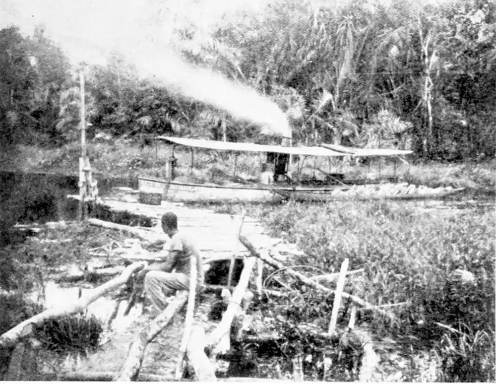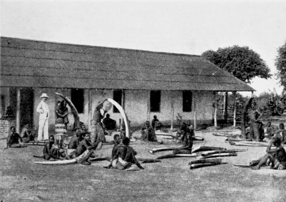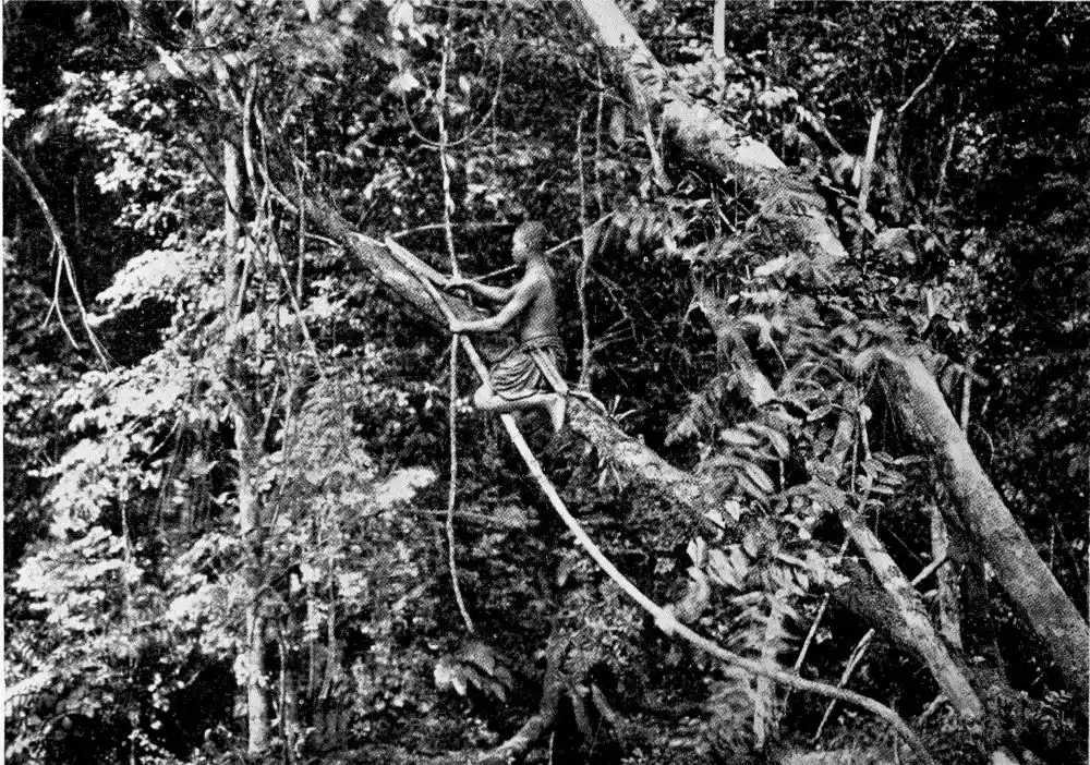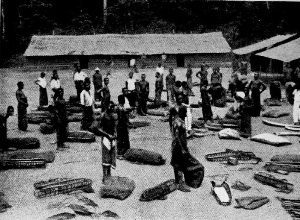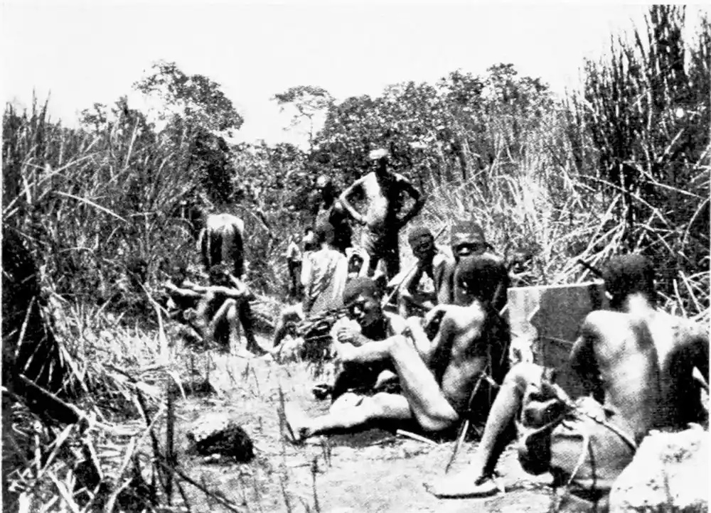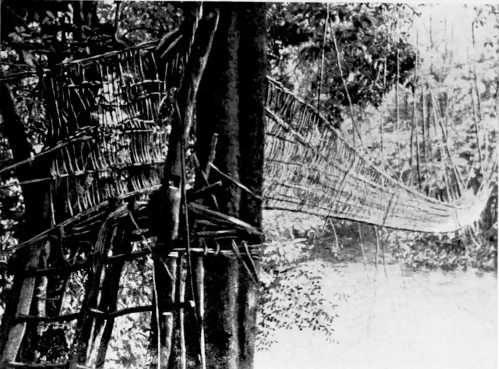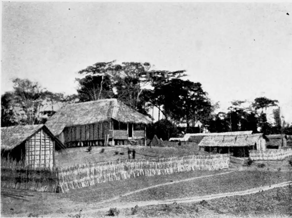 Descending from the main plateau, which is covered with thick short grass and appears to be an ideal district for cattle raising, the Commission came to the first villages of the Anyangs, who are almost invariably at war with the grass land people. “Their villages are hidden away in the forest, and consist of long, low, rectangular mud houses with roofs of palm-leaves, on either side of a squalid street. The people are very poor, and live almost entirely on plantains, their farms being in small clearings, widely separated. Pigs are kept in large numbers in the villages. Further south, the people met with are Bokis, who extend to the Cross River.... The village boundaries, although in dense forest, are well known to the{79} natives, who are extremely jealous of their rubber-collecting rights.”