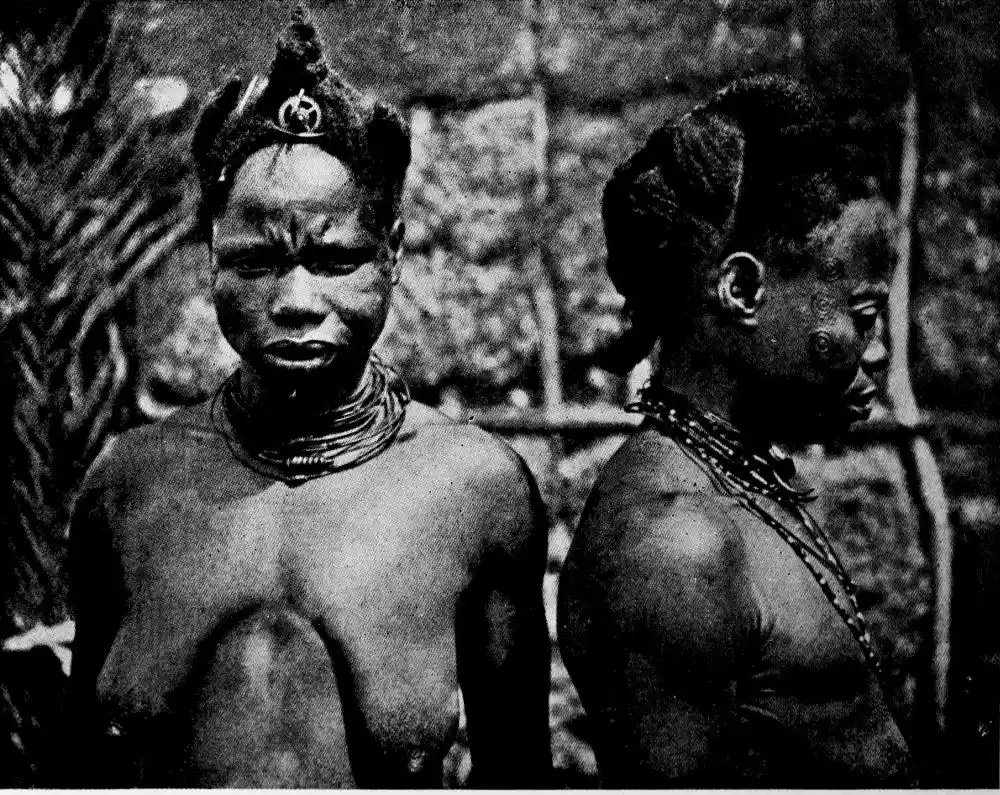“They are clever workers in wood and iron, making chairs and stools, in the carving of which they display{76} some art and much ingenuity. The iron ore found locally used to be smelted in large quantities, and the remains of old workings can be seen in many places, but trade iron bars are now more generally used: from these spears and arrow-heads, hoes, knives, and daggers are constructed. The small knives are curious in shape, the handles being iron loops, which fit over the palm of the hand. The hoes have broad, heavy blades, fitted with short, crooked wooded handles, and are most effective agricultural implements. The principal weapons of offence are bows and arrows, the arrows being poisoned with a compound of crushed and boiled strophanthus seeds, snakes’ heads, and poisonous plants, &c., which when freshly made is very potent, the slightest scratch causing a man to die in agony in twenty minutes. The fumes from this poison, when it is being boiled, are very deadly, even in the open air. The mixing is always done by one of the numerous ju-ju men, who profess to have antidotes, both external and internal, but there is no authenticated case of a cure having been seen by any European up to date.