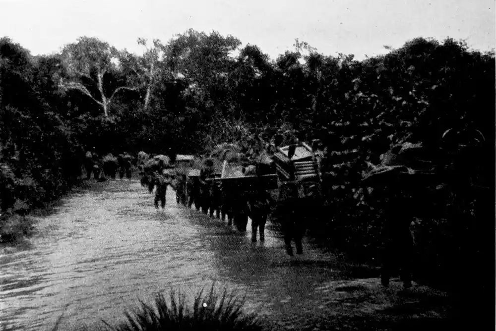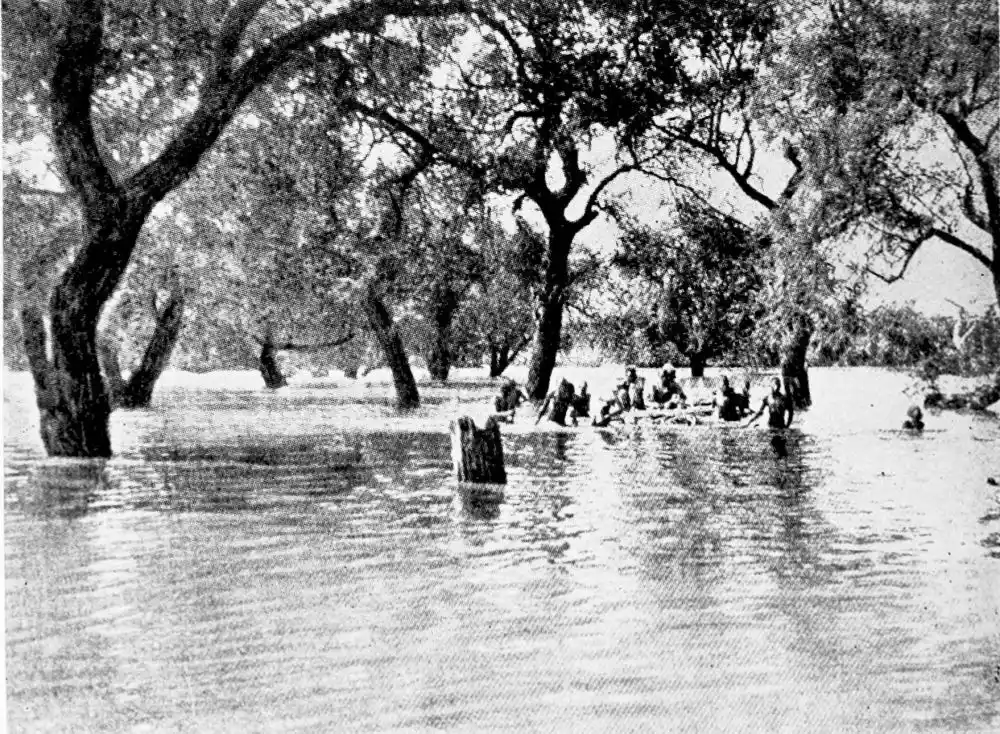 The geological structure of the boundary zone, taken as a whole, is said to present few features of interest. Traces of tin were found in some of the rivers flowing north from the watershed of the Cross River and Benue system, and nearly all the rivers crossed by the Commission contained traces of monazite. The occasional belts of forest along the streams in the open bush country, north of the watershed between the Benue and Cross River systems, are mostly full of vine rubber (Landolphia). The forest line to the south of the Benue-Cross River watershed extends without a break to the Cross River, and from there to the sea. The trees grow to a great height, and the whole forest abounds in ebony, mahogany and other valuable timbers. The rains in the boundary districts begin in March with a few violent tornadoes, which become more frequent and less violent until May, and from that month till September heavy rain falls almost every day. By the end of September the rivers are in full flood, and the low-lying country is under water. In October the steady rain ceases, and at the end of the month the dry season sets in.{80}