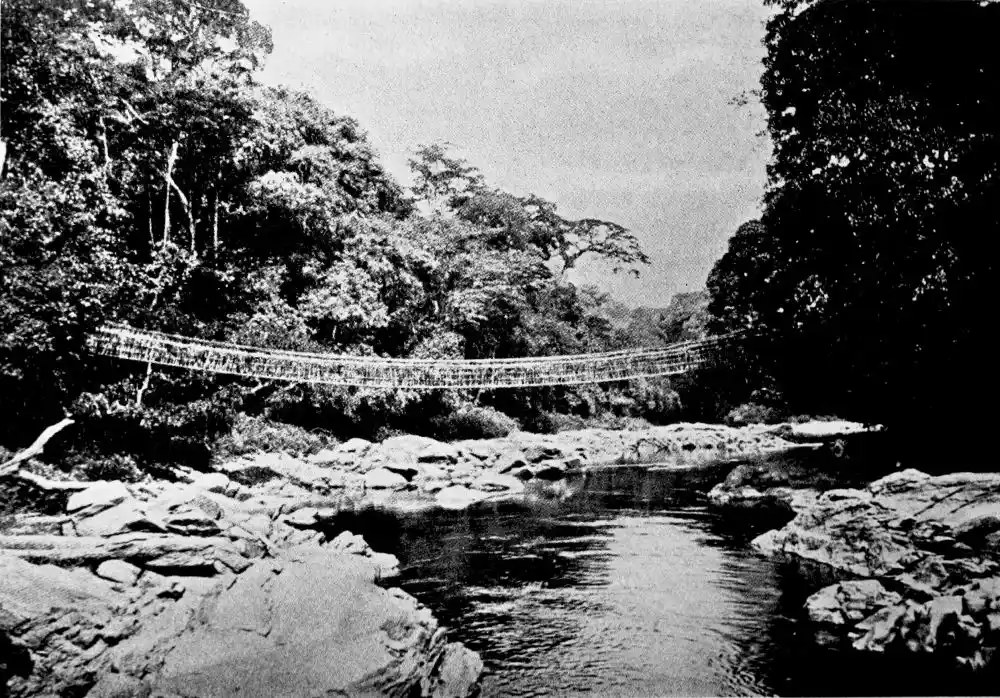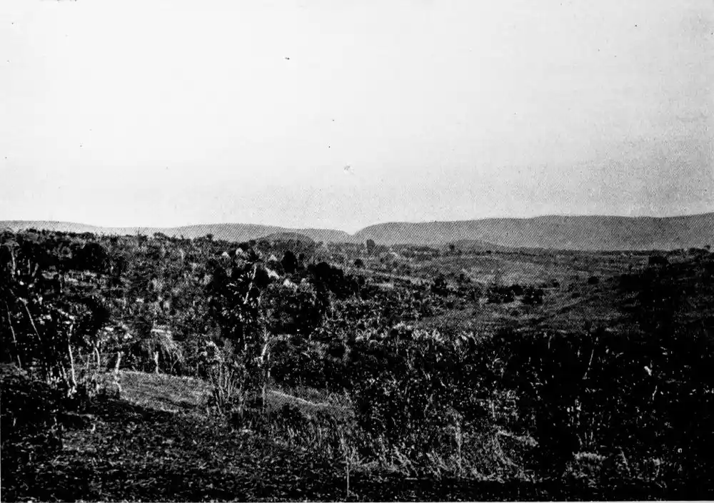 “Leaving the Munchis’ country, the Commission came to the junction of the Amiri and Mahana Rivers—whose steep banks are lined with magnificent trees, from which hang long ribbon orchids over a series of deep clear pools full of large fish—in a region of open grass land. The road up the Amiri Valley passes through extensive yam fields and Olitti and Atcho villages, composed of roomy, massive houses in small stone-walled compounds, protected with loop-holed thorn palisades. Grass land is reached at a height of 4,000 feet, and the path after crossing five separate peaks of 2,000 feet reaches the main ridge about 5,000 feet above sea level. To the north and{78} east, as far as the eye can see, stretches open grass land, with range upon range of blue mountains in the distance. Across the plain sweep parallel shining rivers, disappearing through gaps in the hills to the north. To the south and west, the great forest-clad plain extends to the Cross River, whose valley forty miles away is marked by a long bank of clouds. All around is high tableland, cut up into small plateaux by numerous ravines, down which countless streams tear headlong to the plains.”
