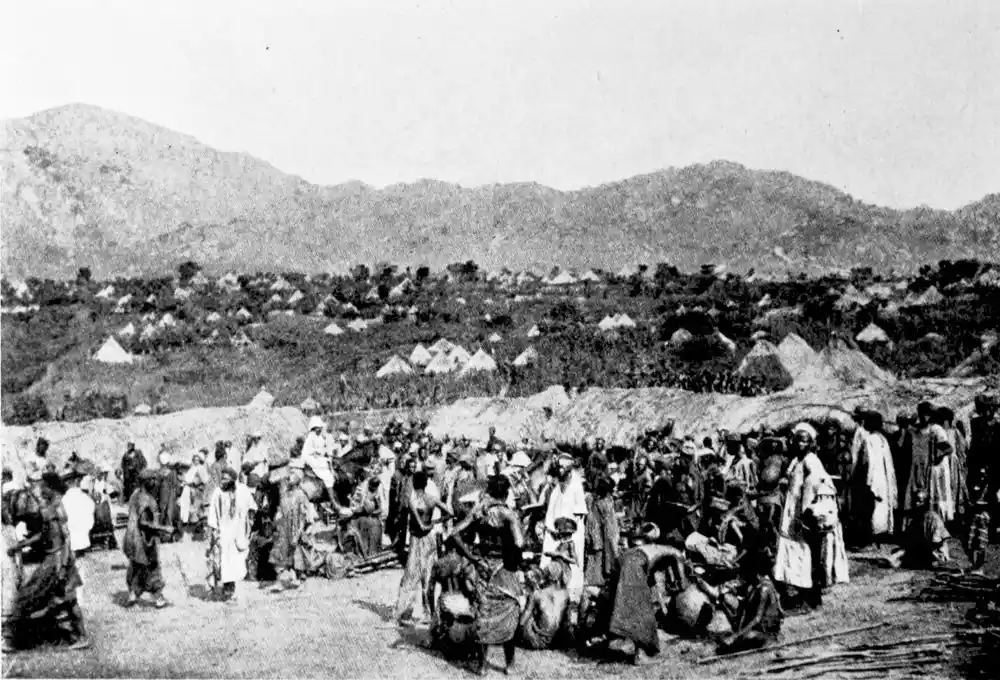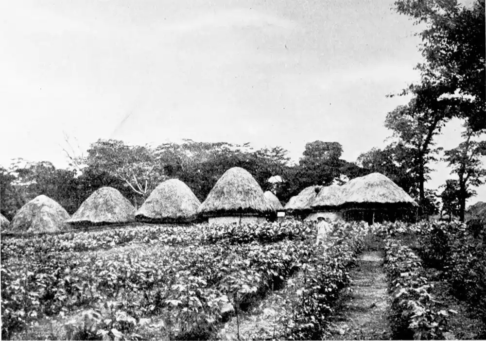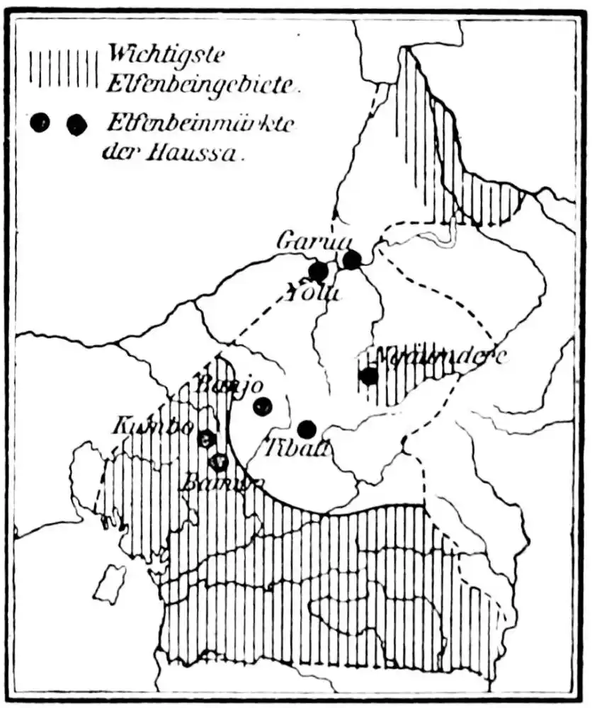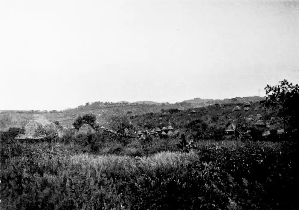 “The boundary after crossing the Gazuba River, a tributary of the Teraba, again ascends into an unexplored continuation of the Banjo highlands, and drops into the plain of the Donga Valley. The inhabitants here are a mixture of Jukums and Zumperis, but there are numerous settlements of Hausas, whose trade consists of smuggling rubber and kola nuts into Nigeria without paying the German tax. The pagans, who live in ‘swallow-nest’ villages on the heights, cultivate guinea-corn and root crops, while yams, cassava and sweet potatoes grow in abundance in the interstices between the huts. The boundary reaches the Donga, and after following the river for fifteen miles and crossing the plateau of the Wanya Moun{73}tains, reaches the plain of the Bamana Valley, in which oil palms are first encountered.