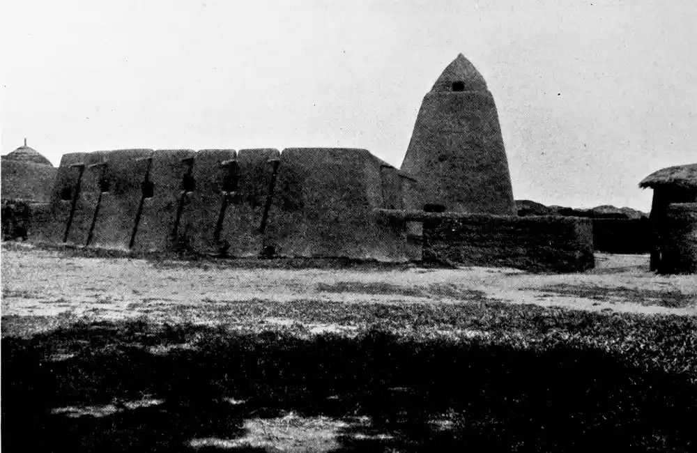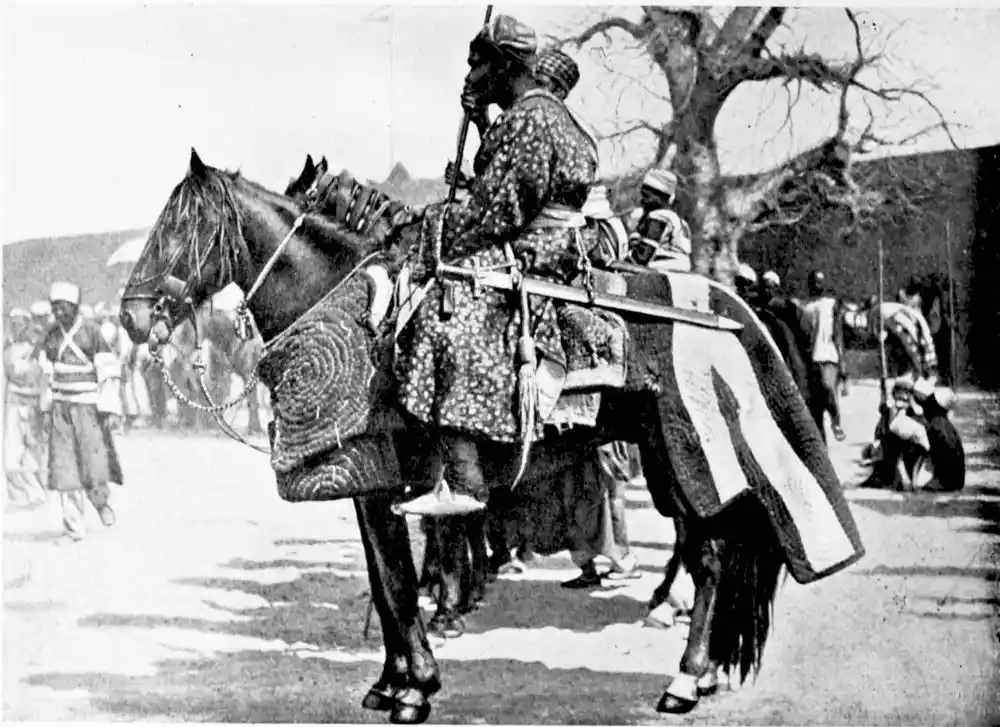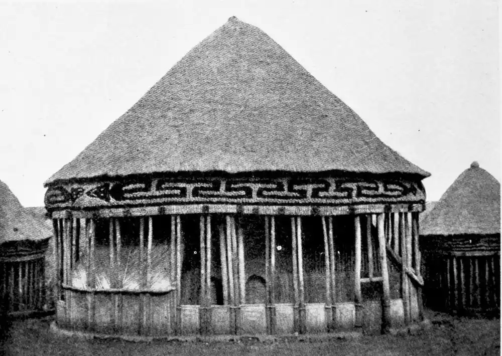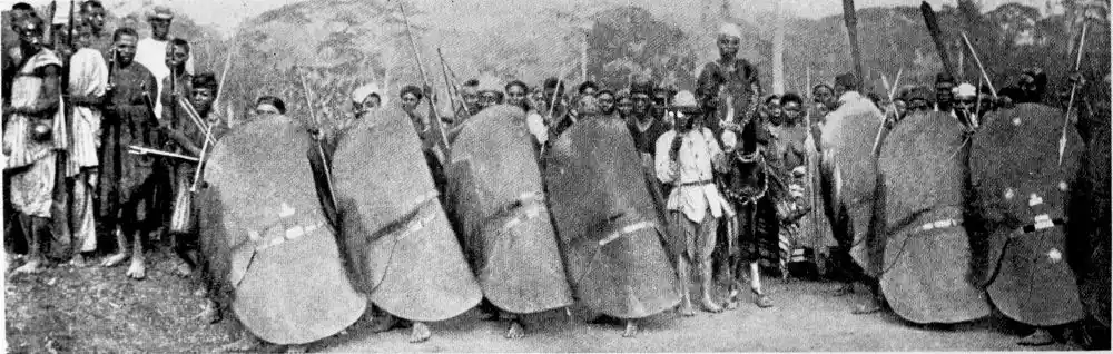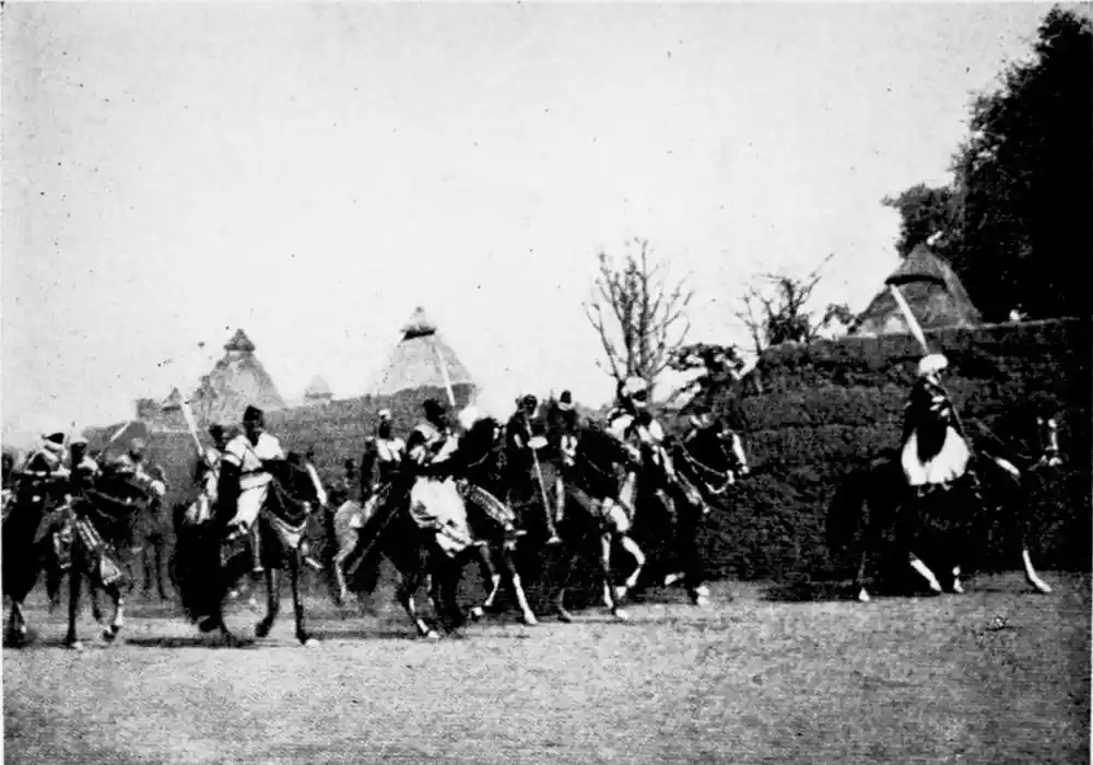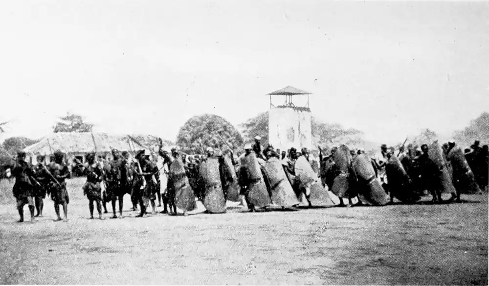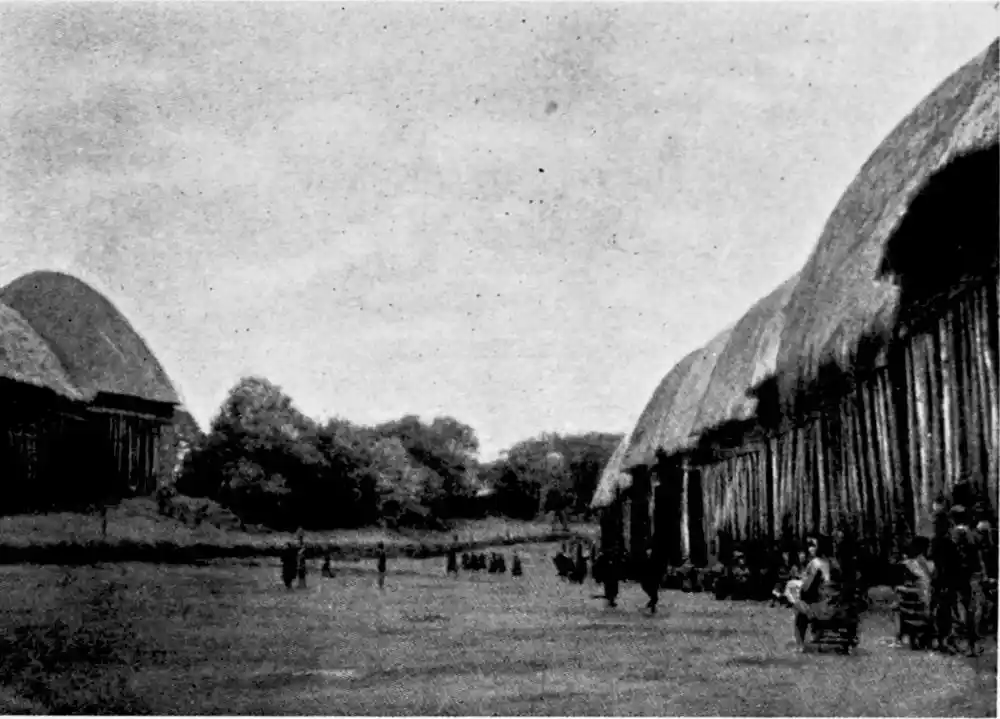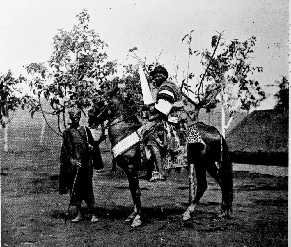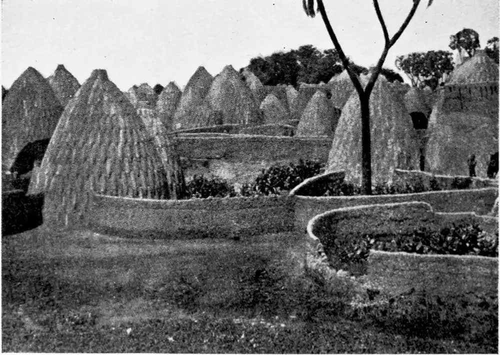 The boundary line, which commences at Byaaer, a three days’ march from Yola, crosses the M’Bulo plain and follows the Upper M’Bulo river to its source in the Shebshi Mountains. “The plain,” to{64} quote from Captain Nugent’s description, “is covered with thin bush, and dotted with villages, each with its surrounding patches of cultivation. The formation is brown laterite, the rocks containing occasional bands and lumps of ironstone.” The lower slopes of the isolated granite hills, which rise above the general level, are covered with pagan villages. “The people inhabiting the plains on both sides of the boundary are Fulanis, subject to the Emirs of Yola and Nassarawa; but the tops of isolated mountains, and the narrow valleys between the long spurs jutting out from the Shebshi group, are inhabited by pagans, offshoots of the Chamba and Dakka tribes. The habits and customs of the Fulanis are well known—they are by nature herdsmen, just as the Hausas are born traders and the pagans agriculturists. The country is rich in flocks and herds of cattle, sheep and goats. A large trade is also done in horses. The villages consist of round huts of sun-baked mud, with conical roofs thatched with dry grass. Sometimes, when the village is only intended to be temporary, the walls of the huts are made of zana matting, which is also used to enclose the compounds, or groups of huts inhabited by one family. Every village has its assembly place, generally under{65} a large shady tree, where the headman and his advisers sit all day and smoke, while the slaves work in the fields or drive the cattle to pasture. Slave-dealing is still carried on in this country, advantage being taken of the proximity of the boundary, which makes it so easy to evade justice.... The work of marking the boundary was watched with the greatest interest by the Fulani population. The ‘kings’ of all the towns on the English side, and a good many from the German side, came to salute us, generally bringing a present of a fowl or a basket of limes. Each ‘king’ carries a long stick, surmounted by a brass crown, the emblem of his office under the Government. There are first, second and third class ‘kings’; the size of the crown varies accordingly.”