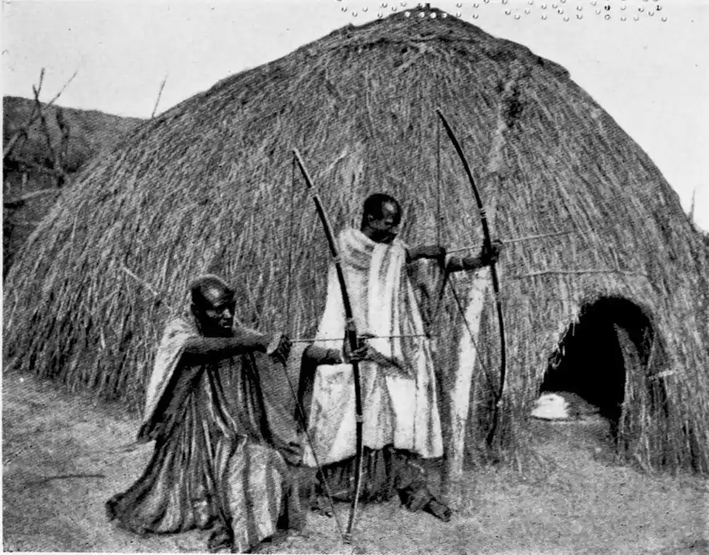 “The villages consist of little beehive-shaped{68} huts of mud or grass, perched on apparently inaccessible heights, or cunningly hidden away in mazes of dense tropical vegetation. The inhabitants bear a great resemblance to monkeys, being small in stature, but extraordinarily active. The steepest and most difficult ascent over rocks and ravines is to them as easy as a straight, broad, level road. In fact, I have often noticed that these pagans, made to carry a load on the level, are utterly at a loss. They only come down from their rocky fastnesses to cultivate their fields, or to make war on their neighbours. They are armed with bows and poisoned arrows, from which it is never safe for them to be parted, even when working in the fields. They are almost invariably at war with a neighbouring village, the probable reason being that some of their women have been carried off. No regular trade is indulged in, but they are very fond of salt, which they obtain from Hausa traders. A bag of salt which costs half-a-crown on the coast has a purchasing power of at least ten shillings in this country.