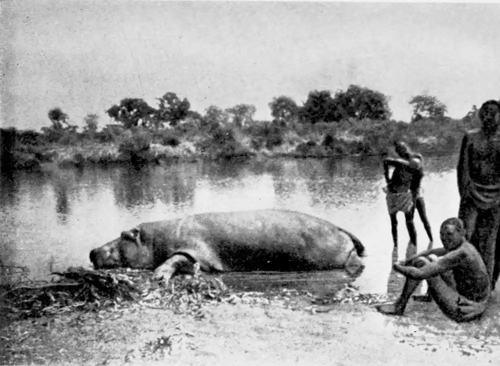 “There is no village within many miles of this place, and it was only with the greatest difficulty that we could obtain guides, as there are no tracks except those made by the larger game. The inhabitants of the pools were thoroughly startled at our approach. There seemed to be a sort of collusion between the different birds and beasts. The shrieking ibis warned the alligators asleep on the rocks in{72} the sun, they, in alarm, slid into the water and warned the river-horse that something was amiss; the river-horse in his turn went pounding up-stream, under water, coming up to breathe at intervals behind the rocks and branches. The snorting was terrific. We estimated that there were between thirty and forty hippopotami in the largest pool. I have never seen a wilder-looking place; it seemed to be alive with everything except humanity.