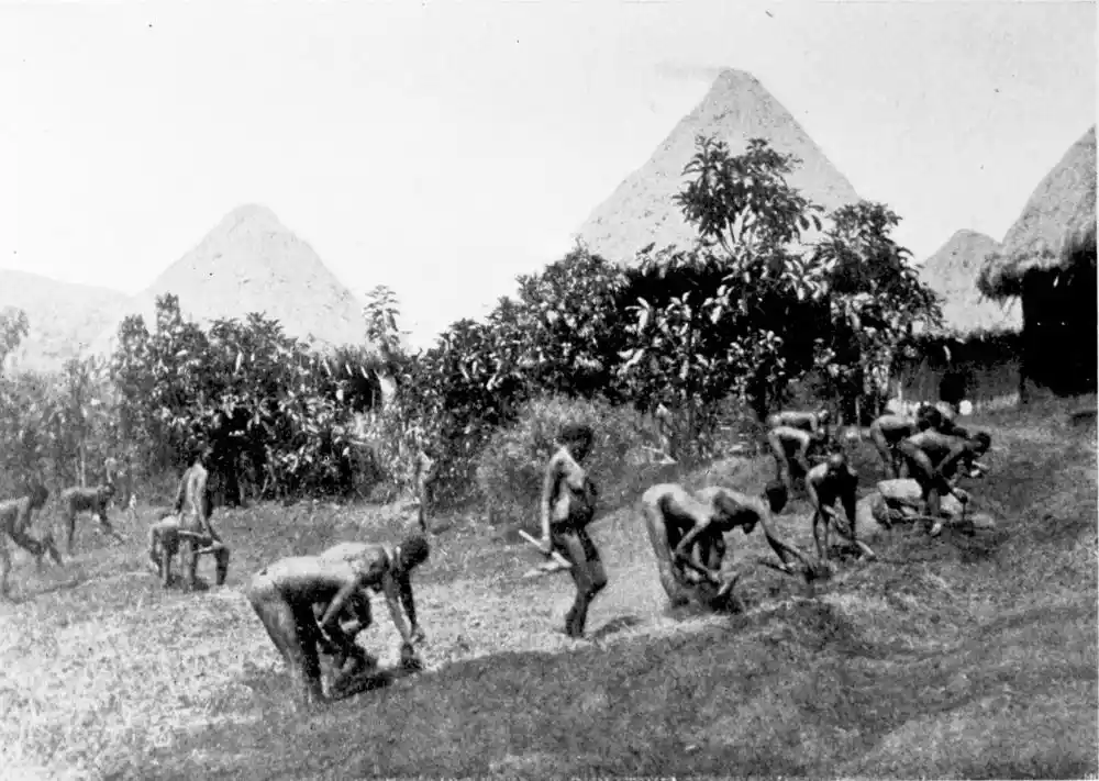 As in all parts where the tsetse fly prevails, and the employment of cattle for ploughing is impossible, the land is chiefly cultivated with the hoe; and as the{23} West African hoe is a tool which calls for the exercise of patience rather than skill or strength, the native leaves the field work to his women. From this form of servitude the women will not be emancipated until cattle are rendered immune from tsetse fly and the hoe is supplanted by the plough.{24}